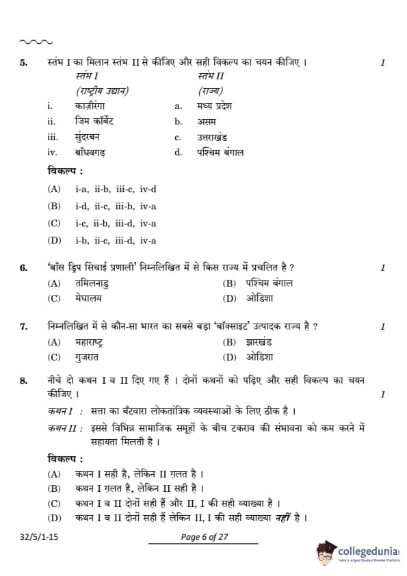 | 6. In which one of the following states is the ‘bamboo drip irrigation system’ prevalent? (A) Tamil Nadu (B) West Bengal (C) Meghalaya (D) Odisha |