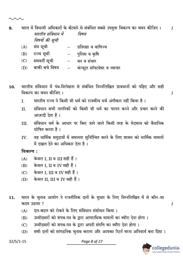 | 10. Read the following provisions regarding secularism in the Indian Constitution and choose the correct option: I. The Indian State has not adopted any religion as its official religion. II. The Constitution gives freedom to all the citizens to practice and propagate any religion. III. The Constitution declares any kind of discrimination done on the basis of religion to be legal. IV. It gives the government the right to intervene in religious matters for ensuring equality within religious communities. (A) Only I, II, and III are correct. (B) Only I, II, and IV are correct. (C) Only I, III, and IV are correct. (D) Only II, III, and IV are correct. |