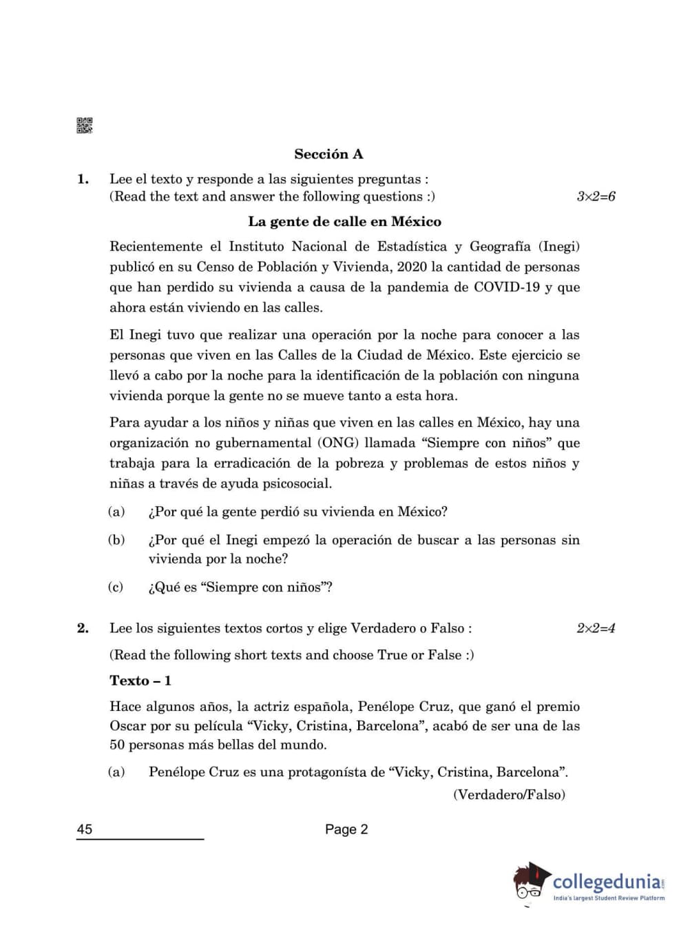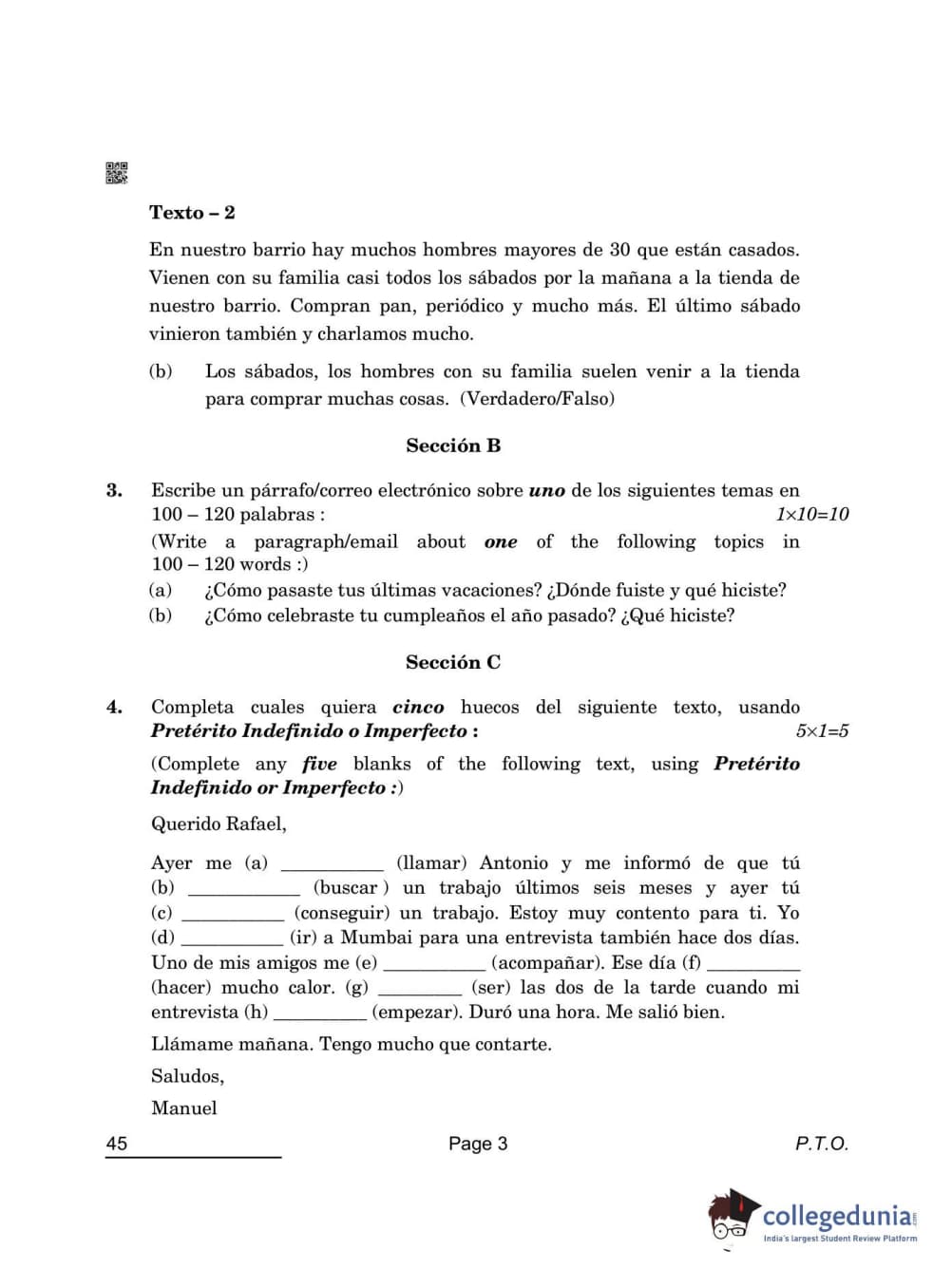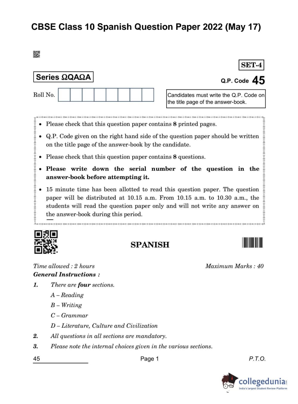 CBSE Class 10 Spanish Question Paper 2022 with Answer Key (May 17)