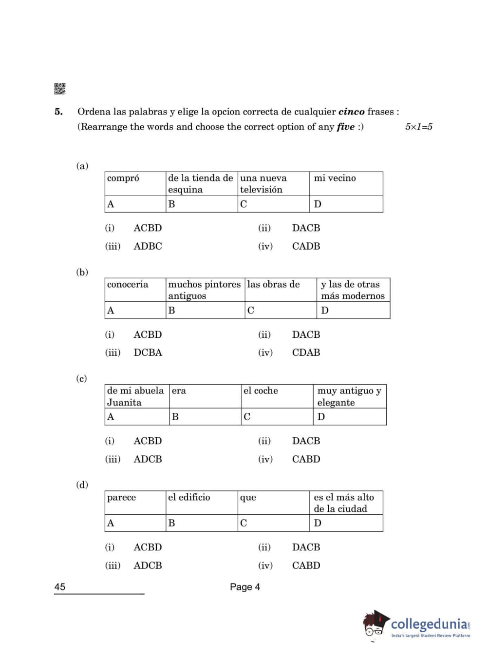 CBSE Class 10 Spanish Question Paper 2022 with Answer Key Set 4 is available for download. The exam was conducted by the Central Board of Secondary Education on May 17, 2022 in the Morning Session 10:30 AM to 12:30 PM. The medium of paper was Spanish. The question paper comprised a total of 8 questions divided among 4 sections.