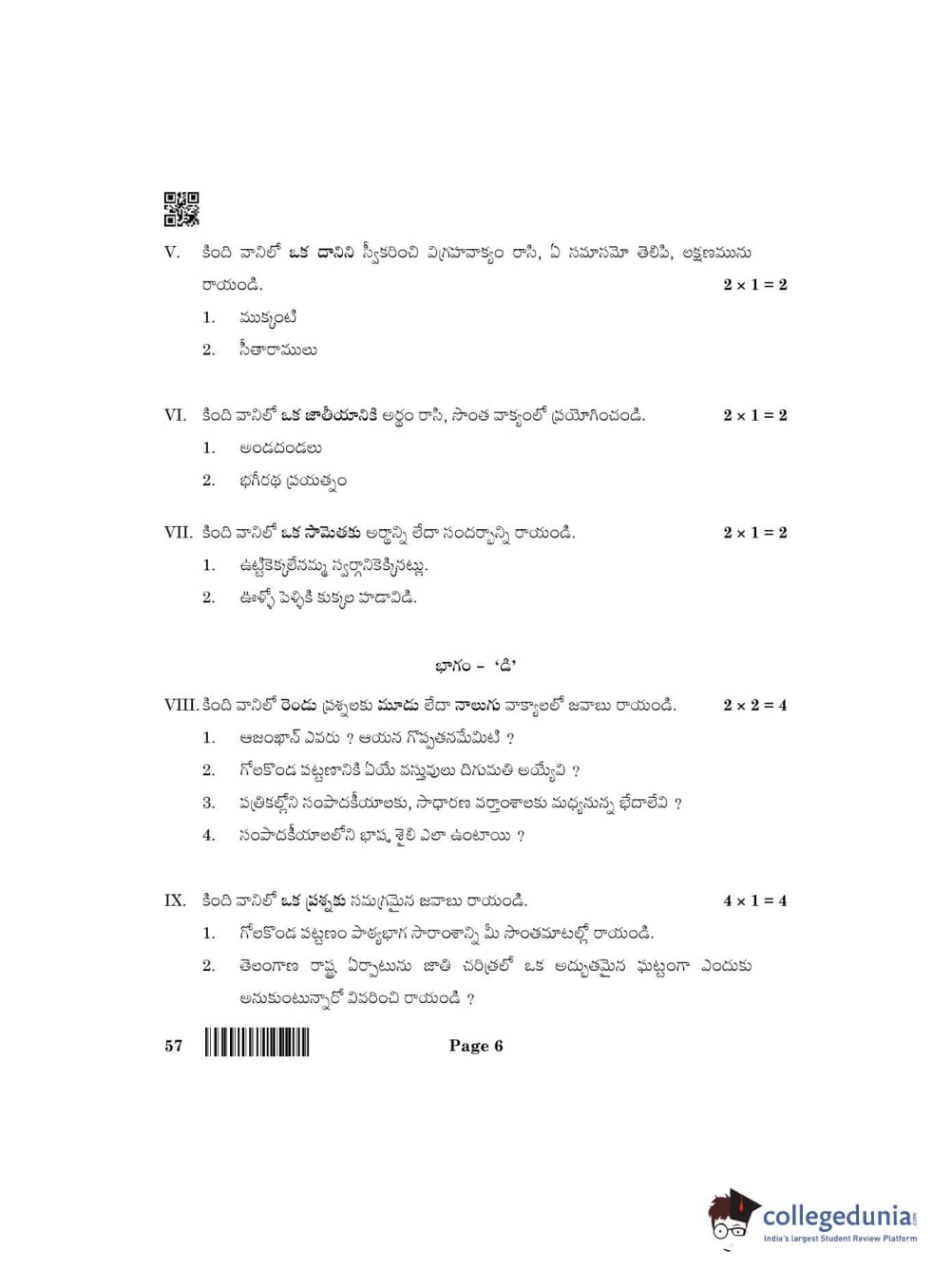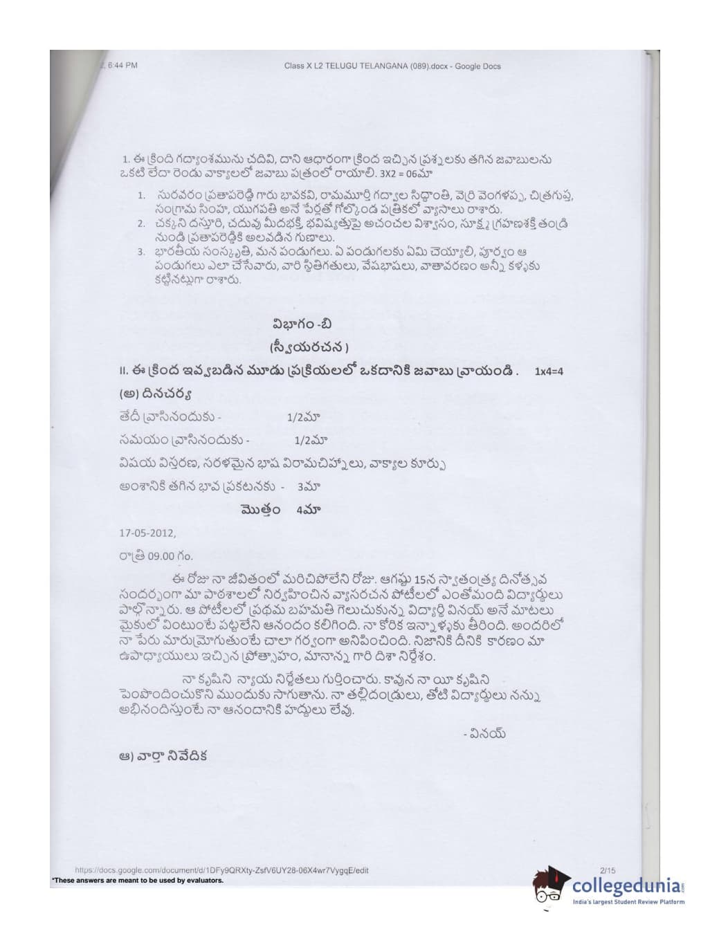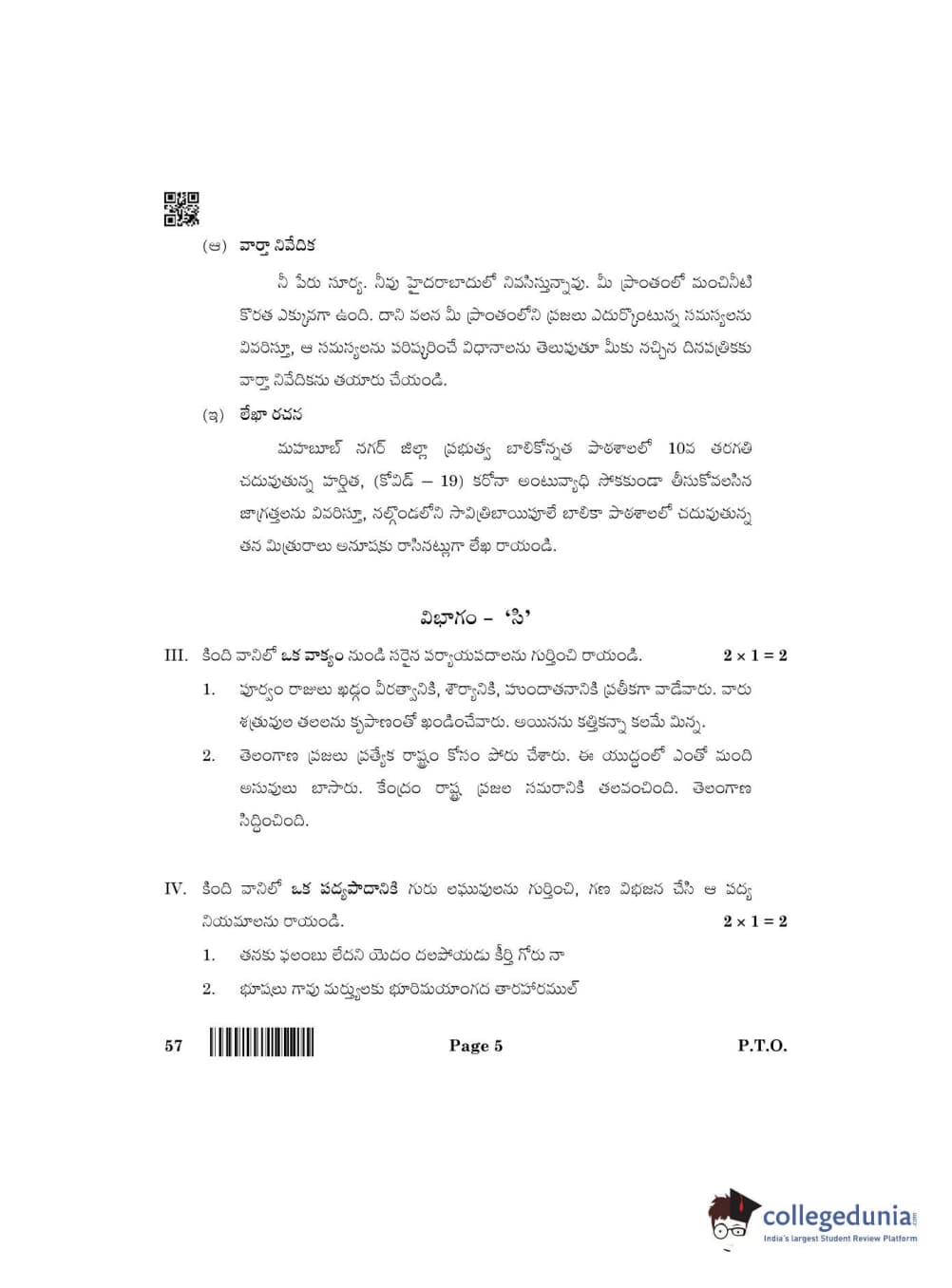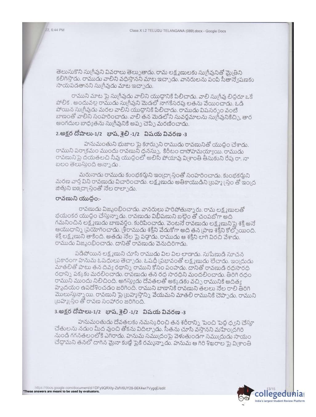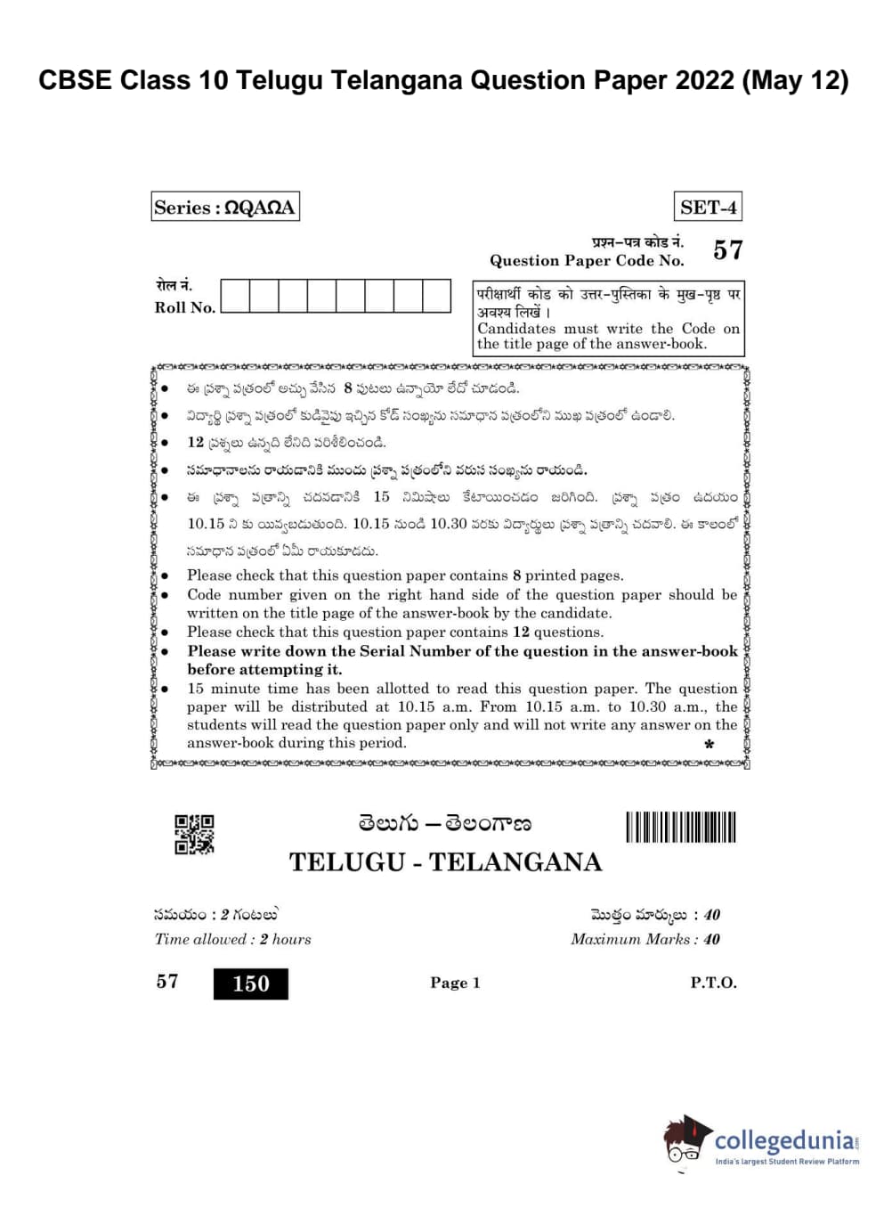CBSE Class 10 Telugu Telangana Question Paper 2022 with Answer Key (May 12)