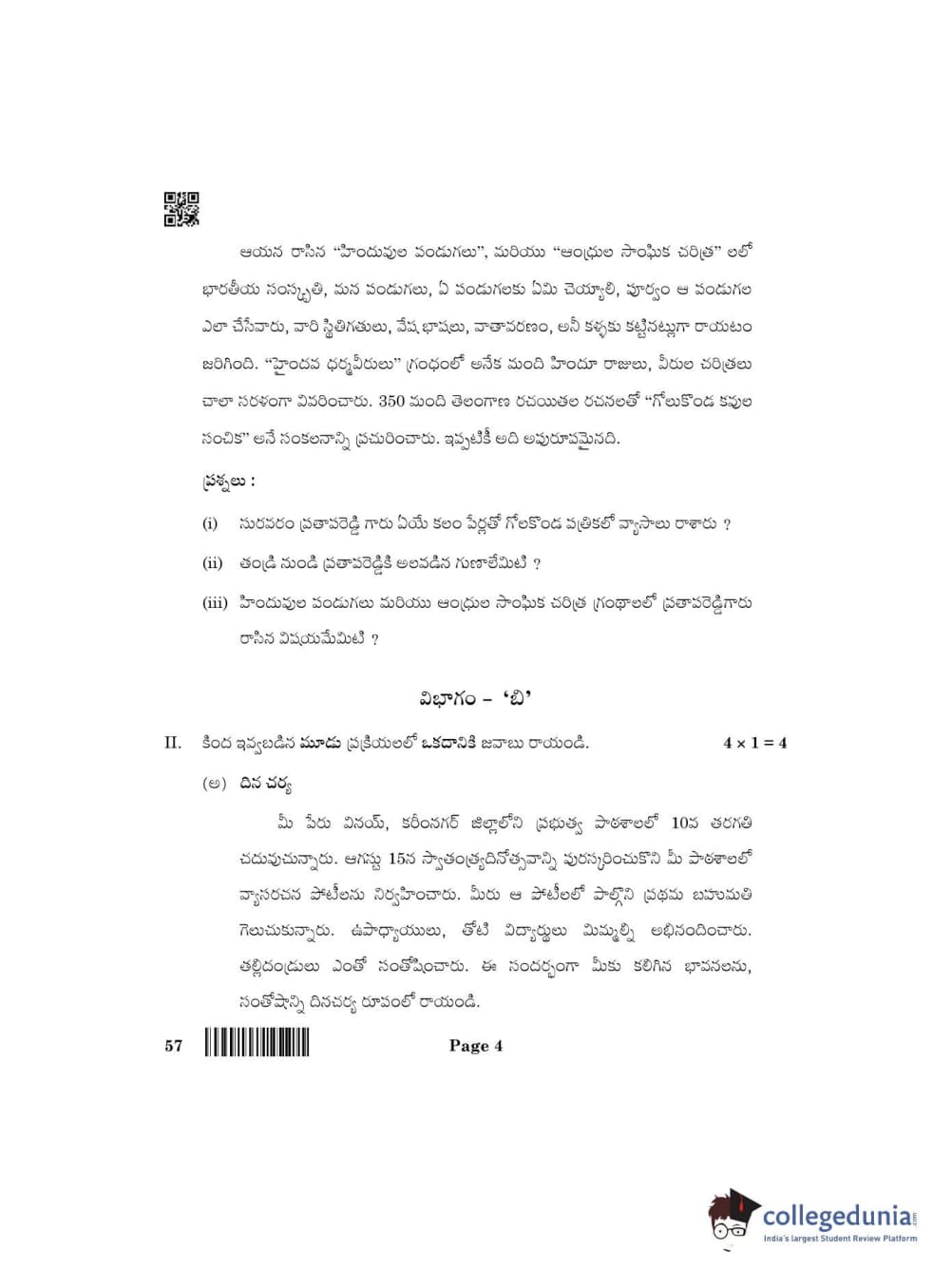 CBSE Class 10 Telugu Telangana Question Paper 2022 with Answer Key Set 4 is available for download. The exam was conducted by the Central Board of Secondary Education on May 12, 2022 in the Morning Session 10:30 AM to 12:30 PM. The medium of paper was Telugu Telangana. The question paper comprised a total of 12 questions divided among 4 sections.