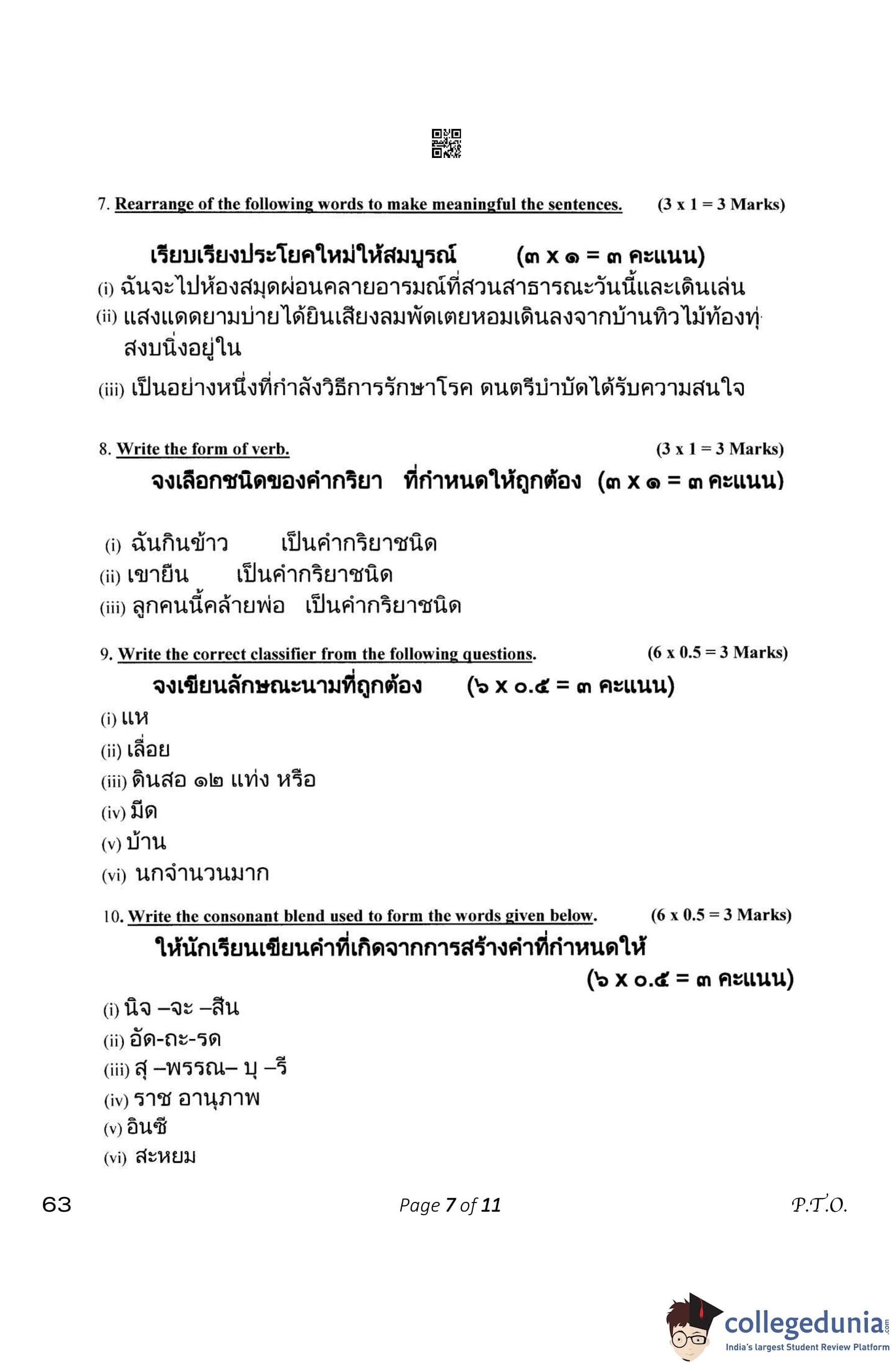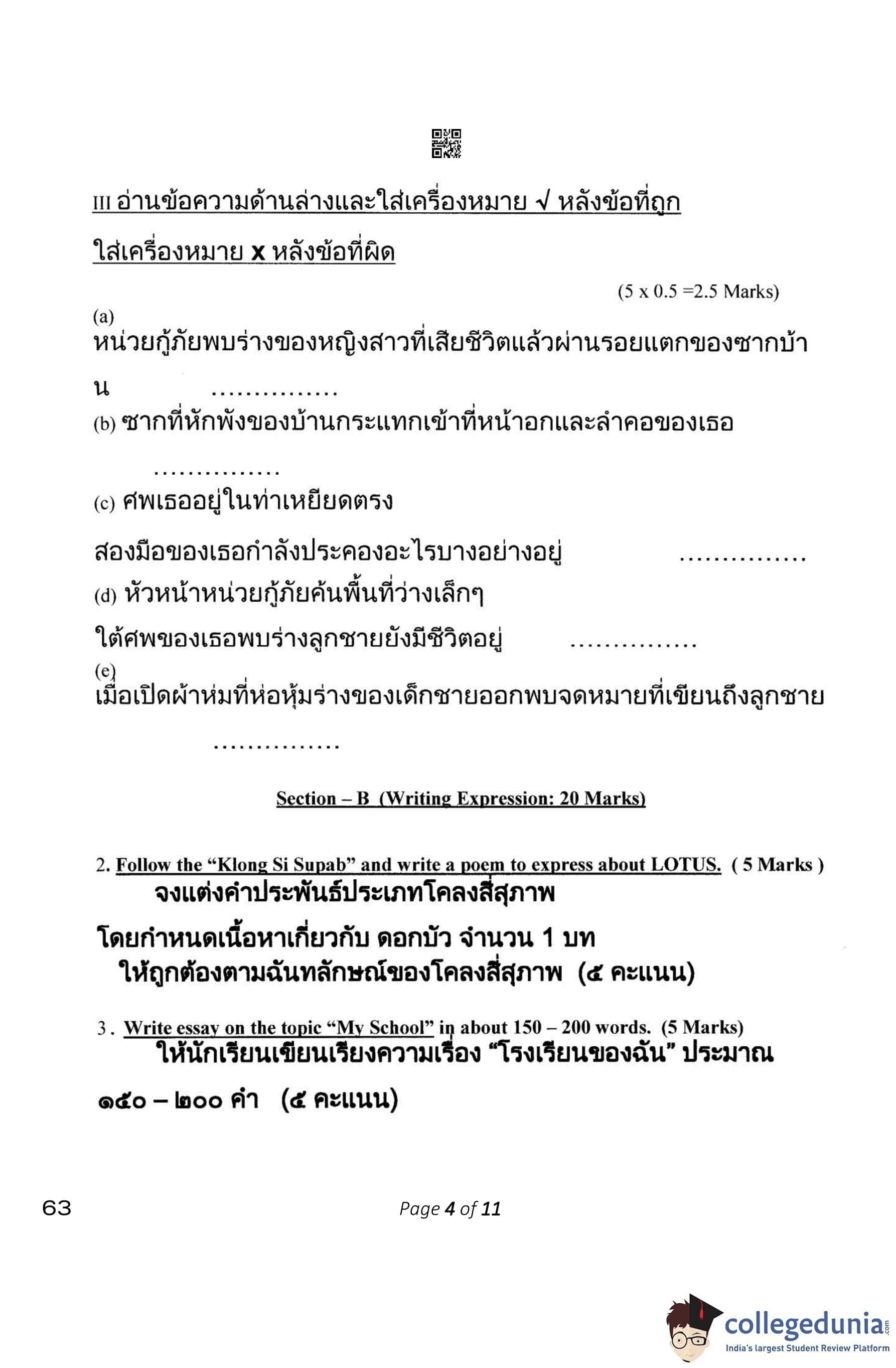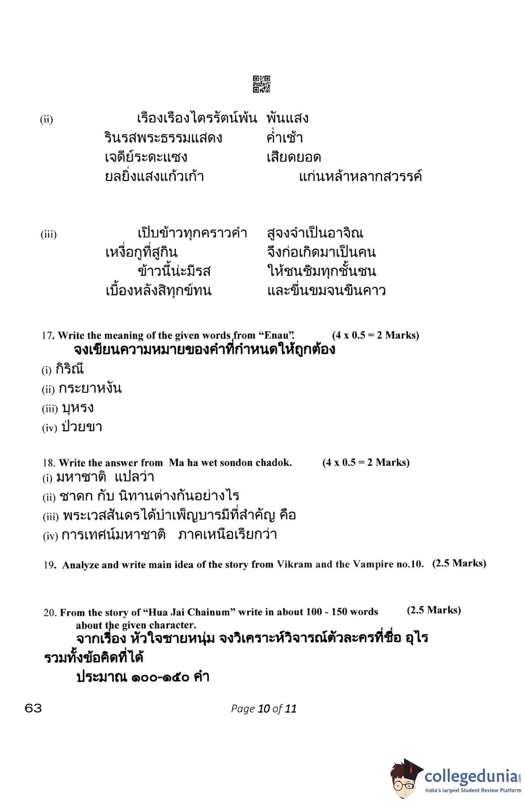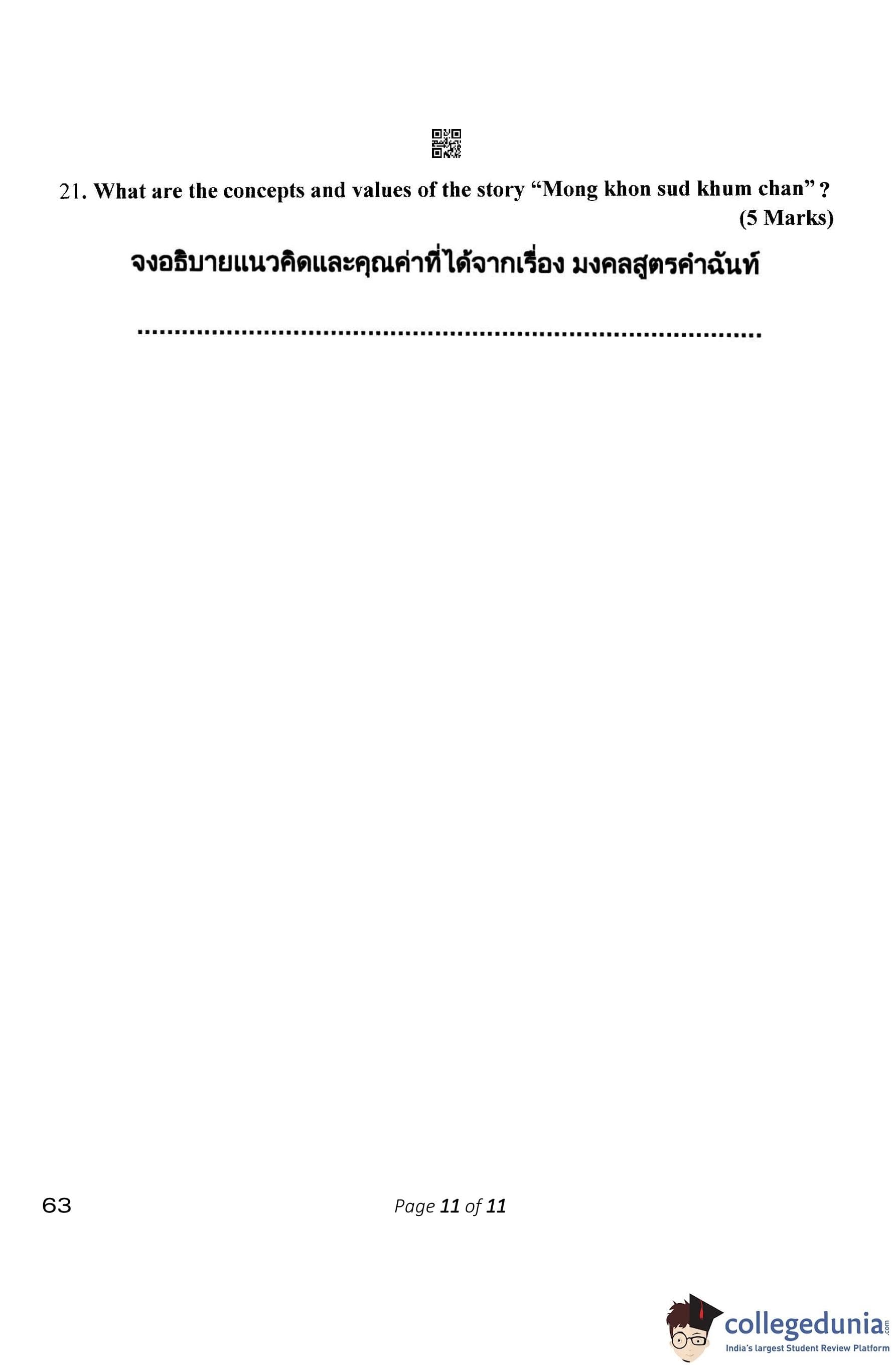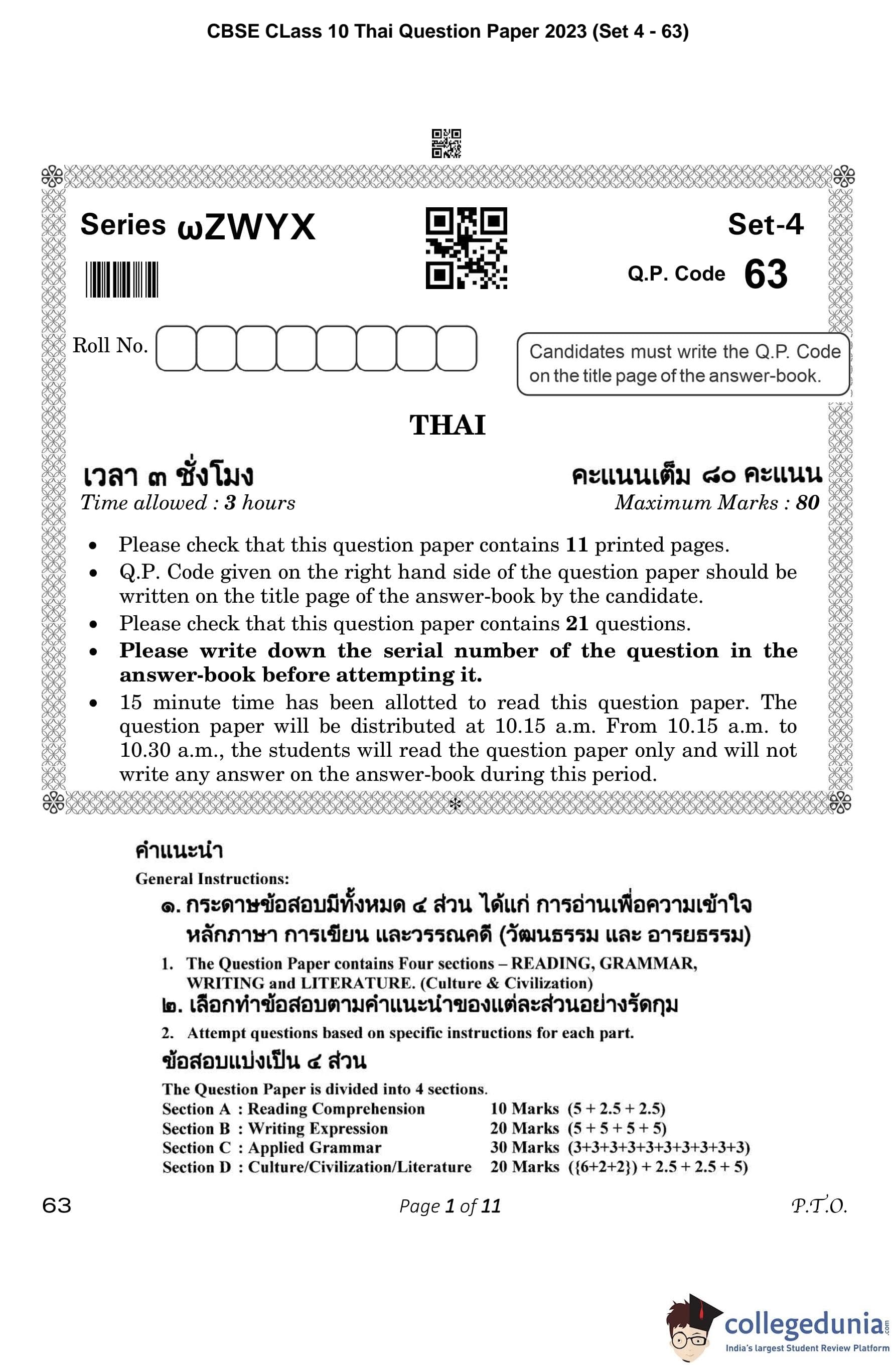 CBSE Class 10 Thai Question Paper 2023 (Set 4- 63) with Answer Key pdf is available for download here. The exam was conducted by Central Board of Secondary Education on February 15, 2023. The question paper comprised a total of 21 questions.