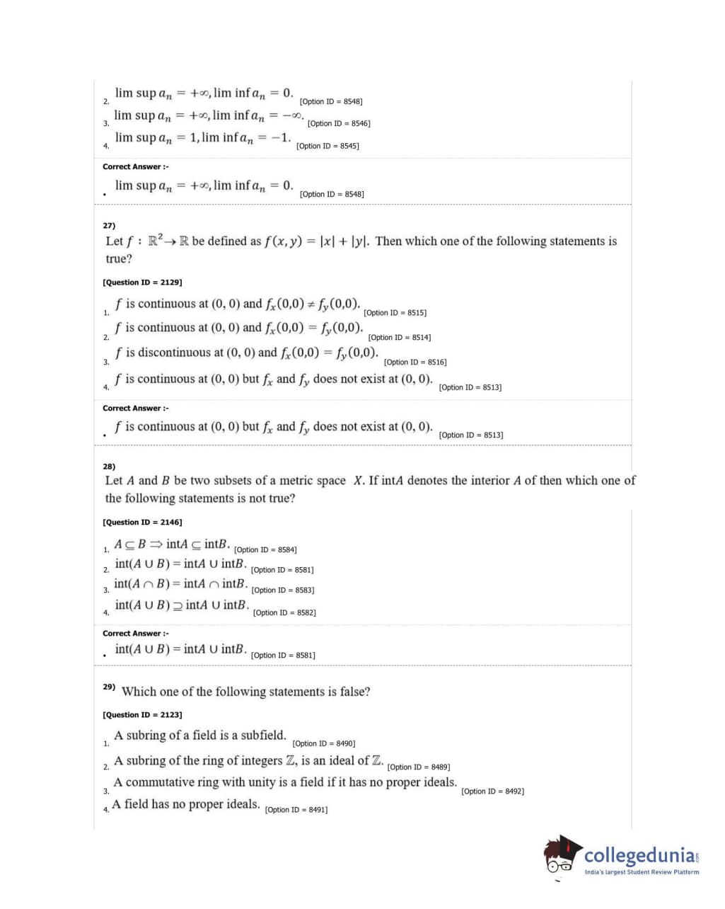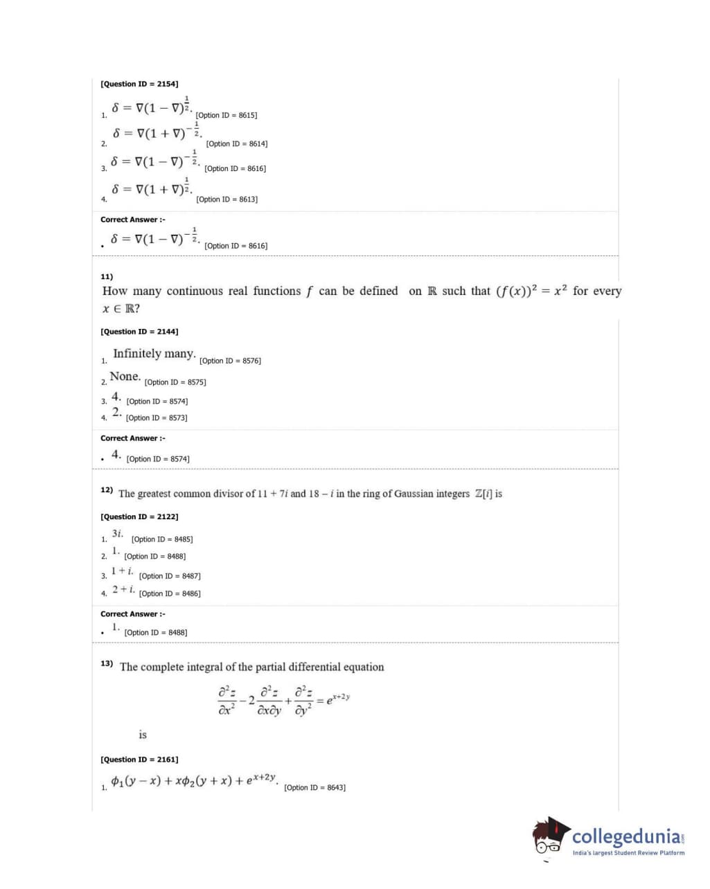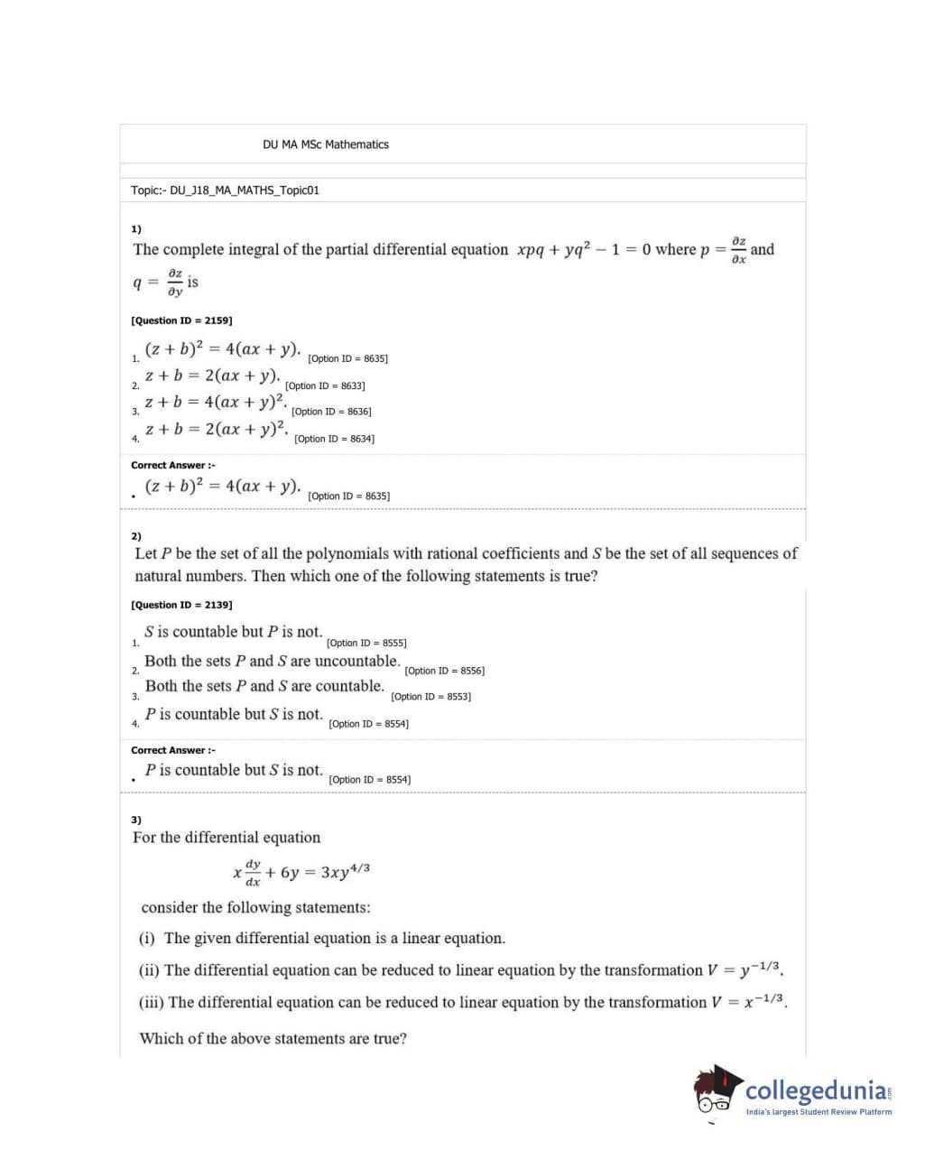 DUET 2018 M.A./M.Sc. Mathematics Question Paper with Answer Key PDF Shift 3
