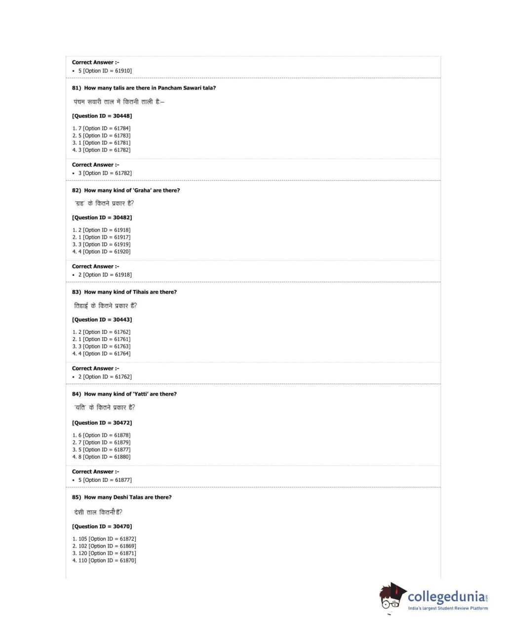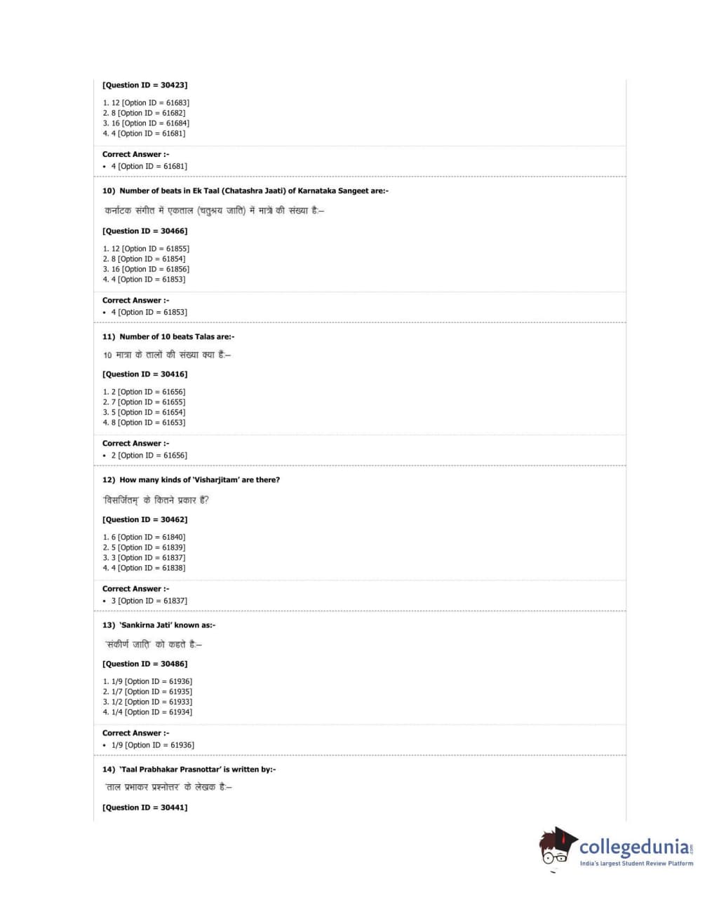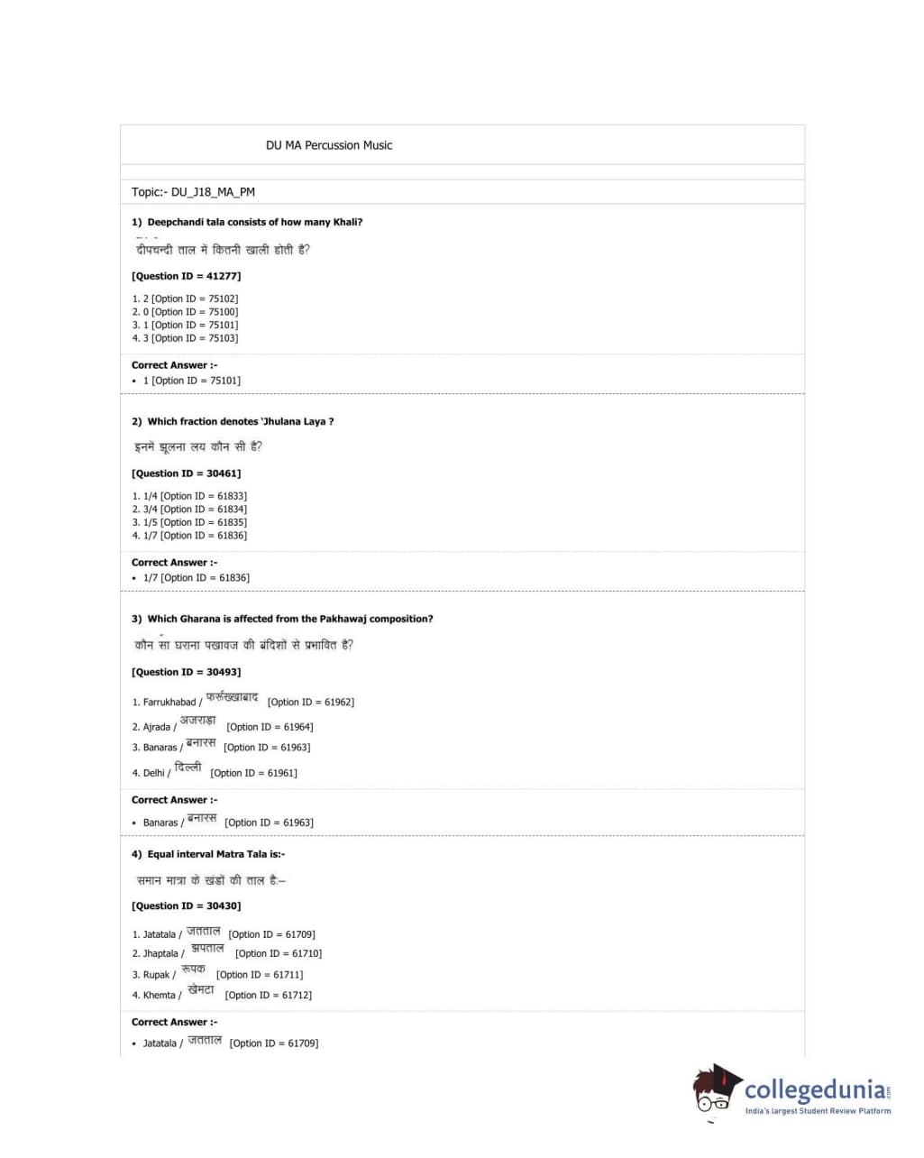 DUET 2018 M.A. Percussion Music Question paper with answer key pdf conducted on June 21, 2018 in Shift 3 is available for download. The exam was successfully organized by University of Delhi. The question paper comprised a total of 100 questions.