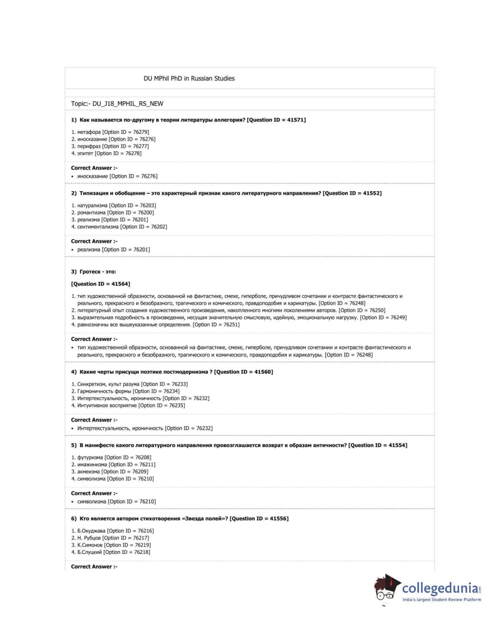 DUET 2018 M.Phil. in Russian Studies Question paper with answer key pdf conducted on June 20, 2018 in Shift 1 is available for download. The exam was successfully organized by University of Delhi. The question paper comprised a total of 50 questions.