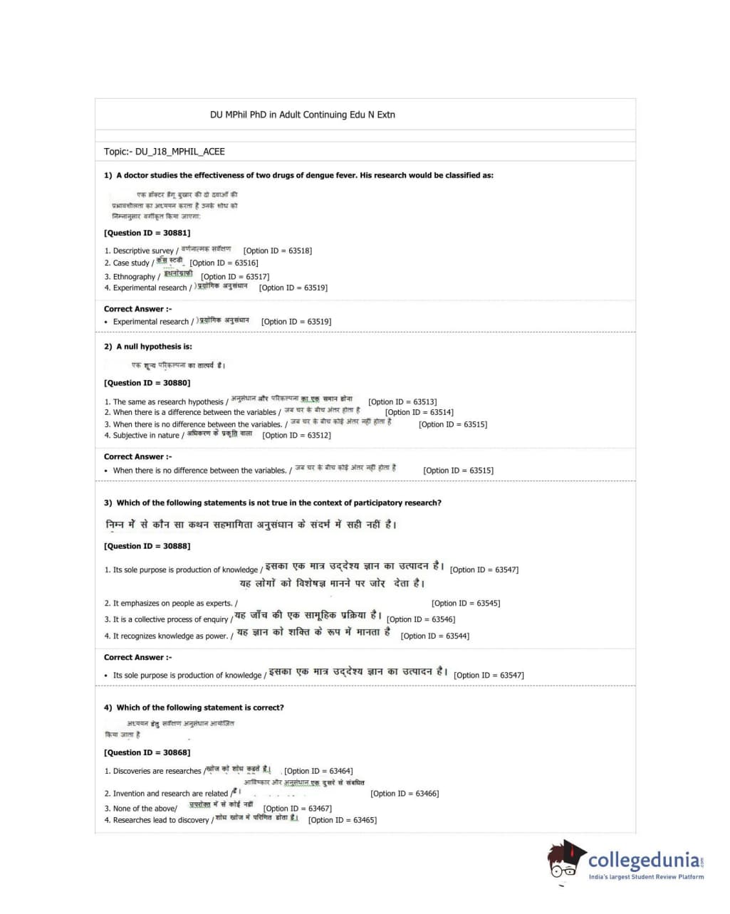 DUET 2018 M.Phil./Ph.D. in Adult Continuing Education & Extension Question paper with answer key pdf conducted on June 21, 2018 in Shift 3 is available for download. The exam was successfully organized by University of Delhi. The question paper comprised a total of 50 questions.