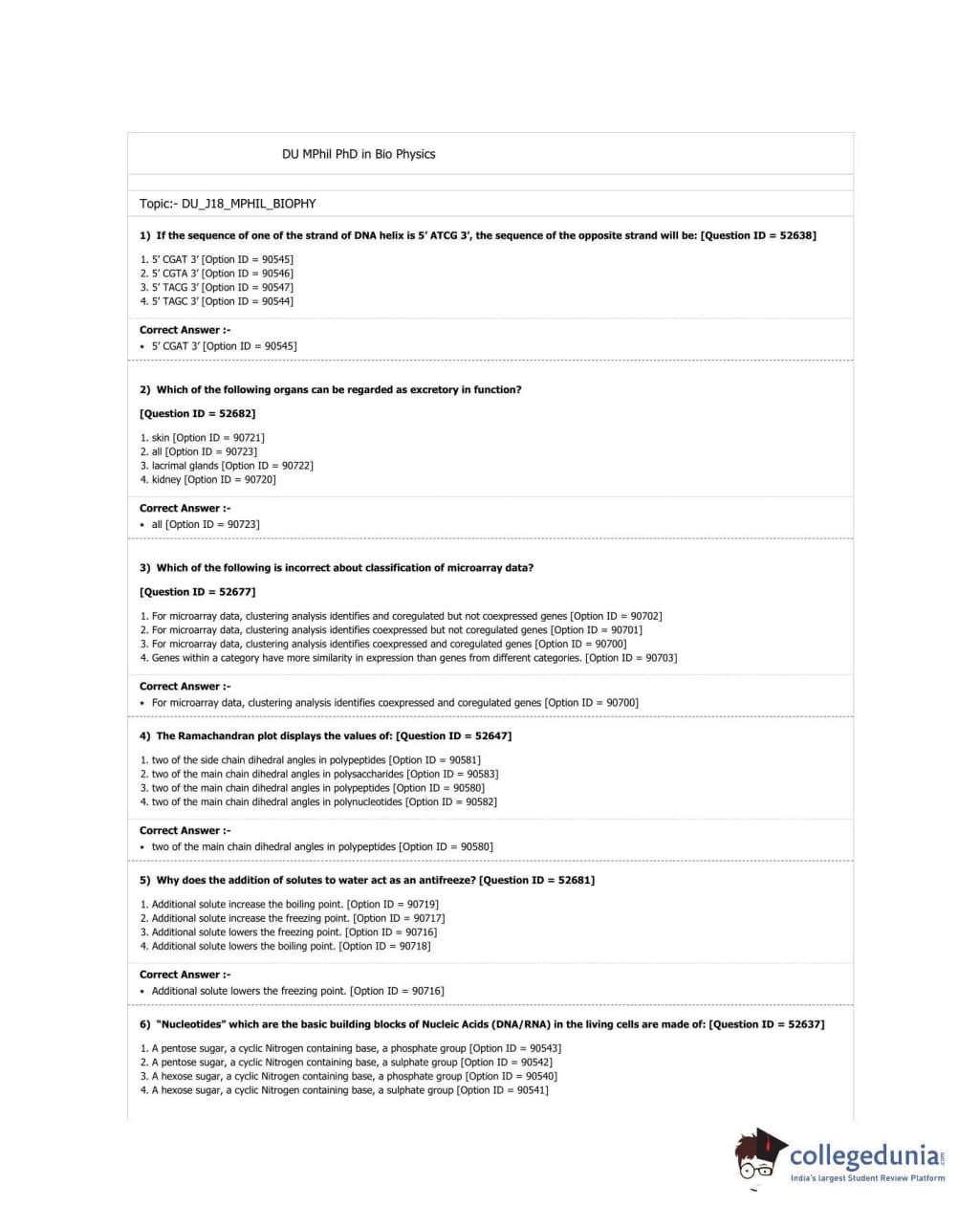 DUET 2018 M.Phil./Ph.D. in Bio-Physics Question paper with answer key pdf conducted on June 20, 2018 in Shift 1 is available for download. The exam was successfully organized by University of Delhi. The question paper comprised a total of 50 questions.