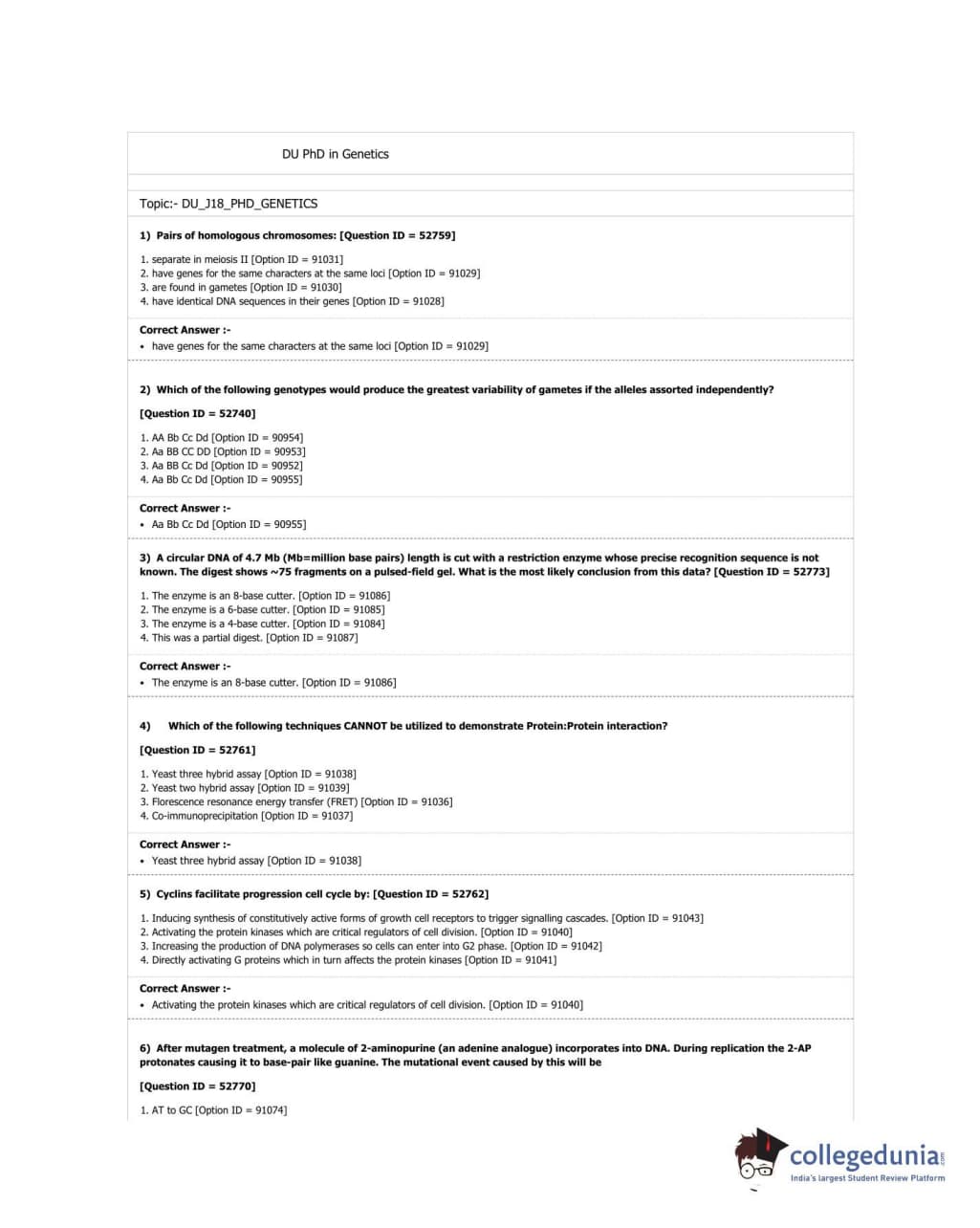 DUET 2018 M.Phil./Ph.D. in Genetics Question paper with answer key pdf conducted on June 20, 2018 in Shift 3 is available for download. The exam was successfully organized by University of Delhi. The question paper comprised a total of 50 questions.