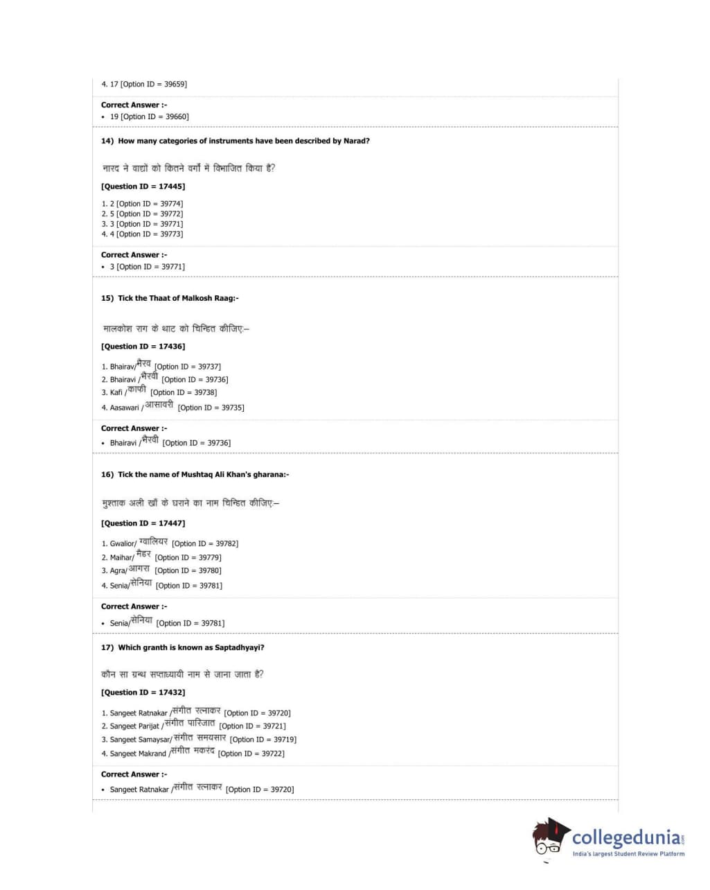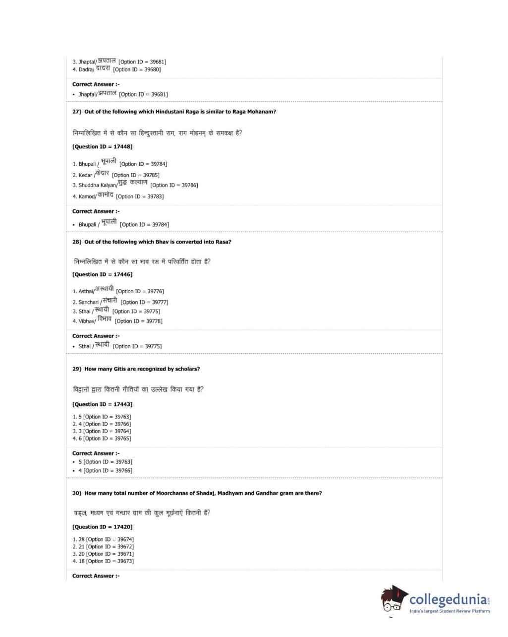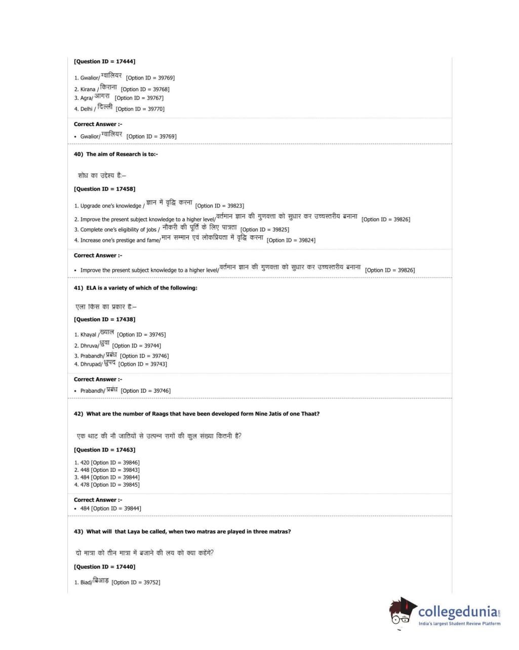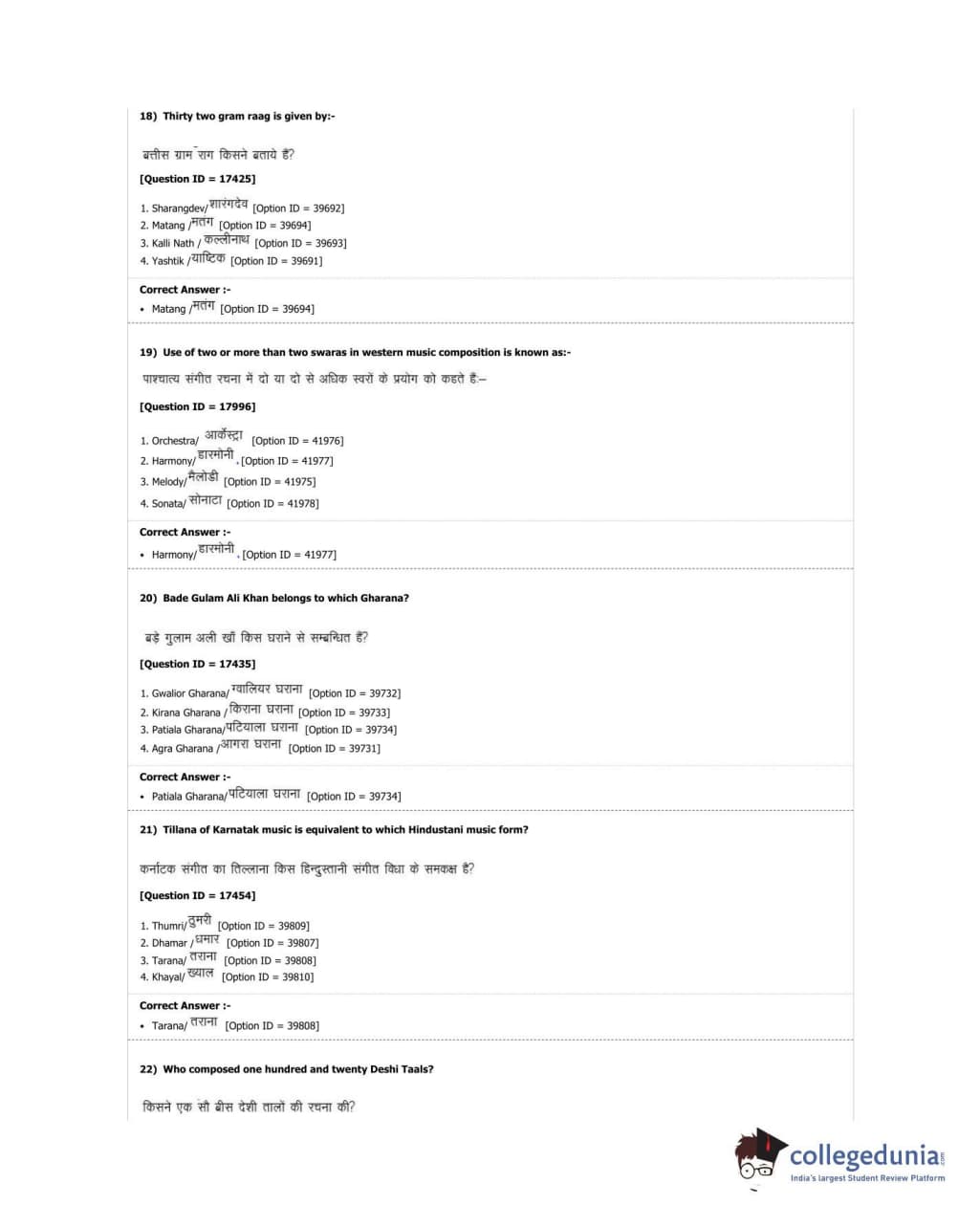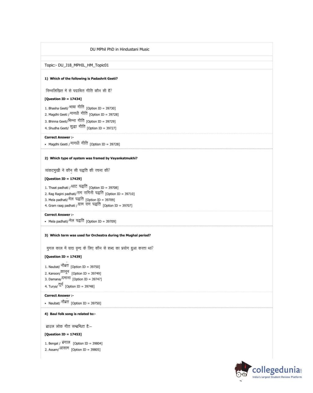 DUET 2018 M.Phil./Ph.D. in Hindustani Music Question Paper with Answer Key PDF Shift 1