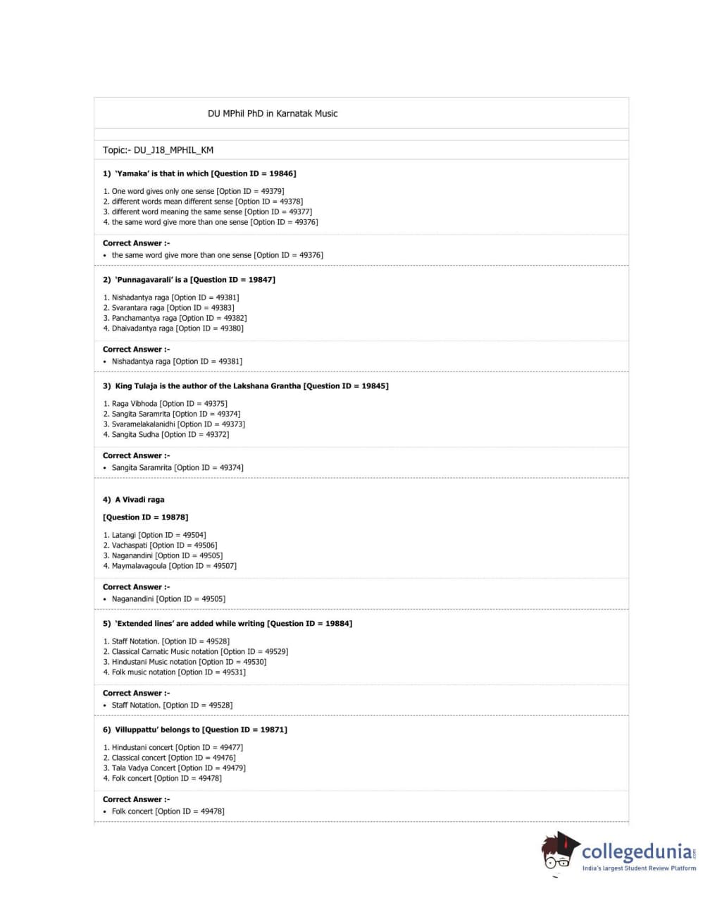 DUET 2018 M.Phil./Ph.D. in Karnatak Music Question paper with answer key pdf conducted on June 20, 2018 in Shift 3 is available for download. The exam was successfully organized by University of Delhi. The question paper comprised a total of 50 questions.