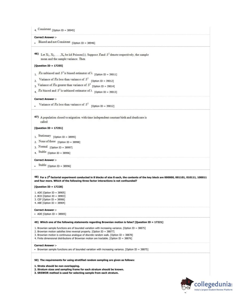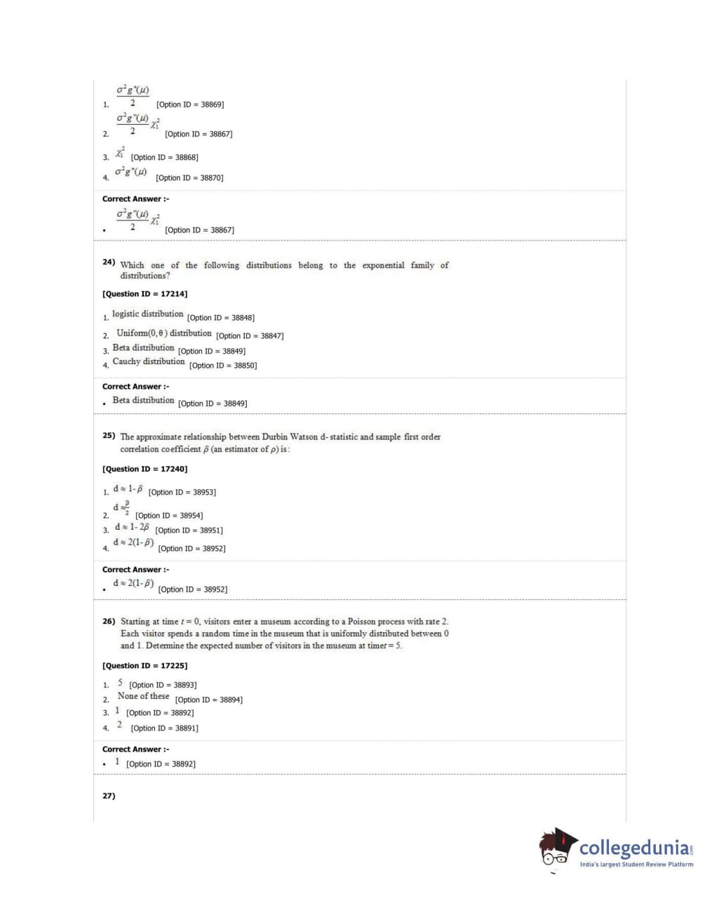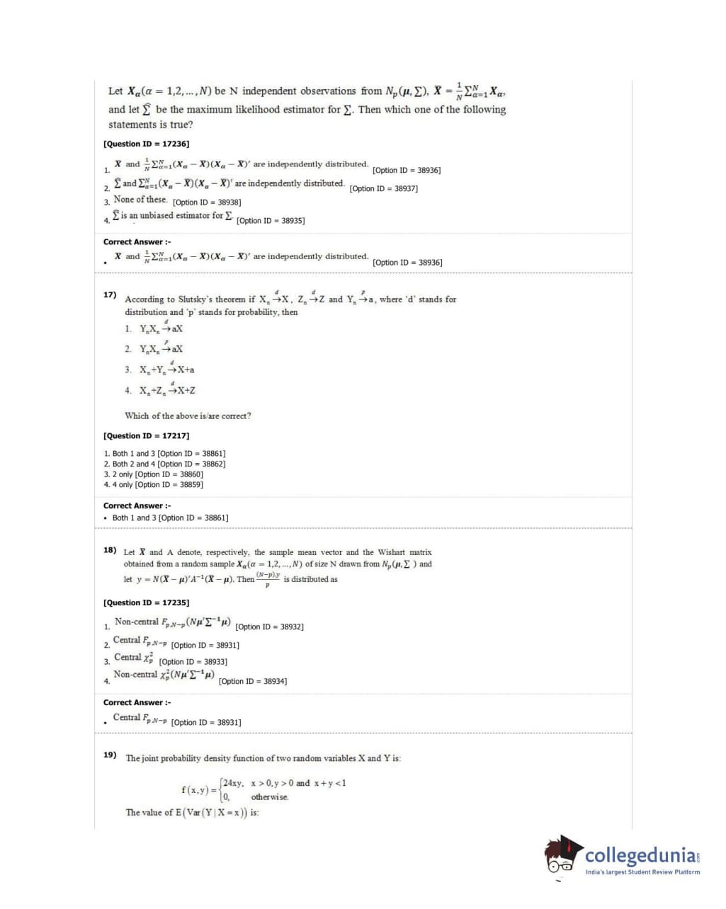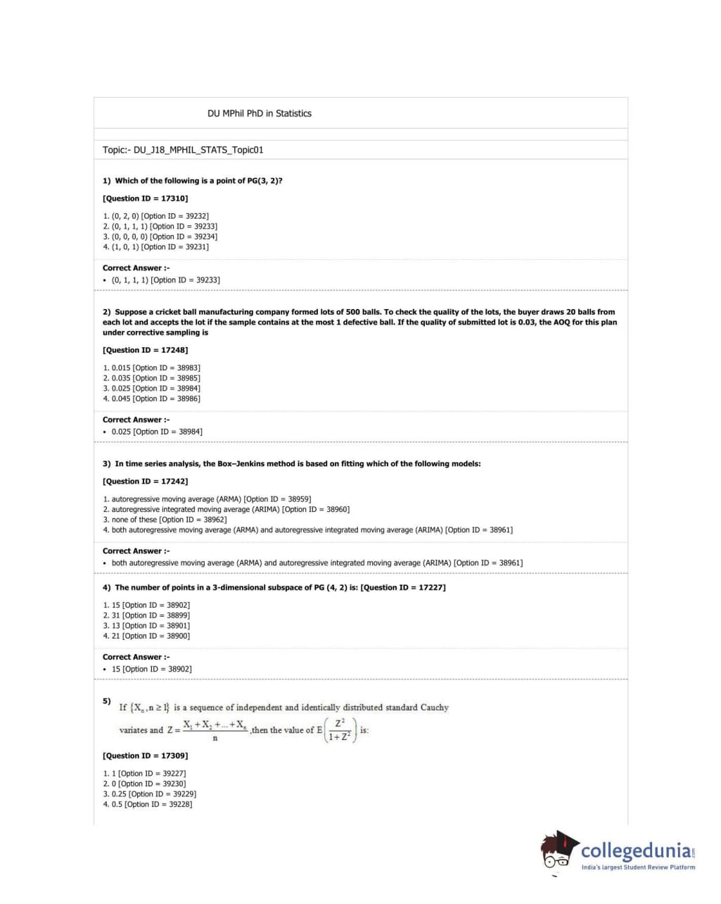 DUET 2018 M.Phil./Ph.D. in Statistics Question Paper with Answer Key PDF Shift 1