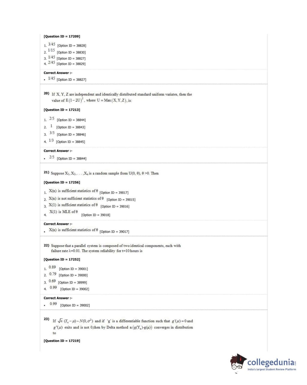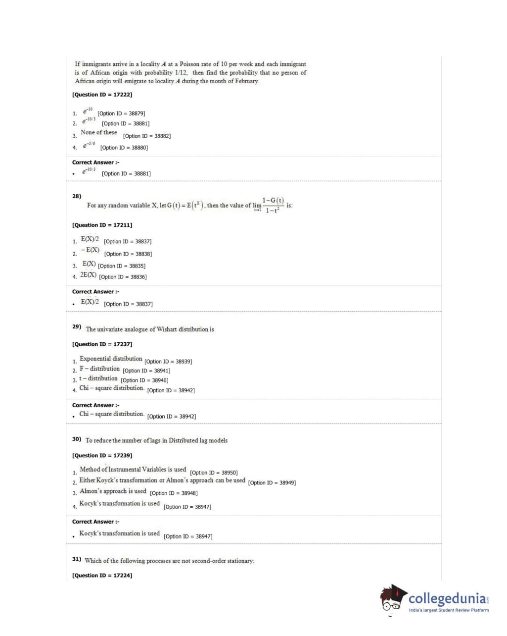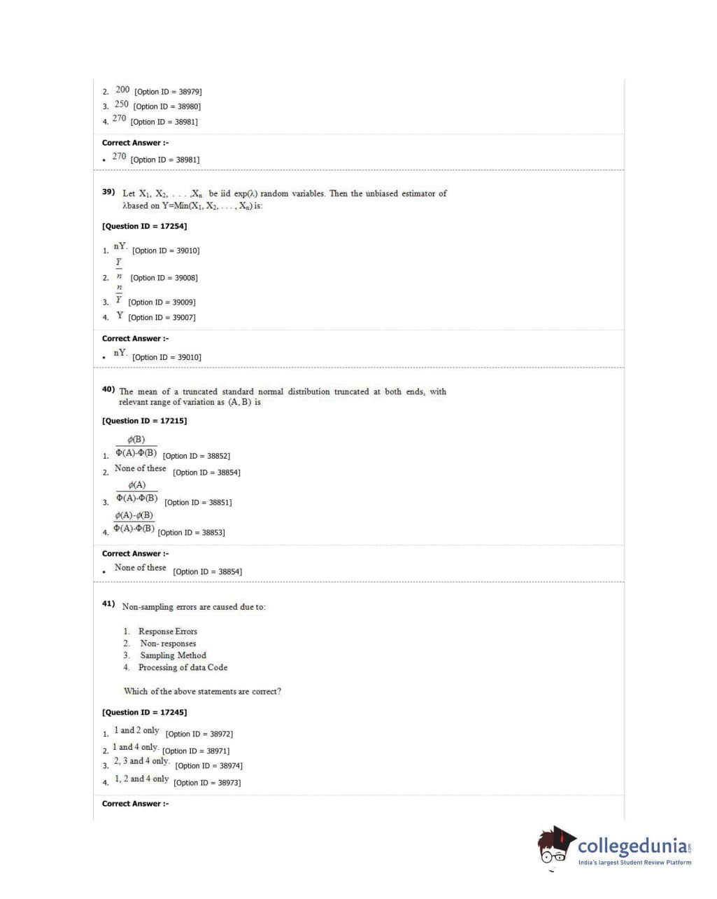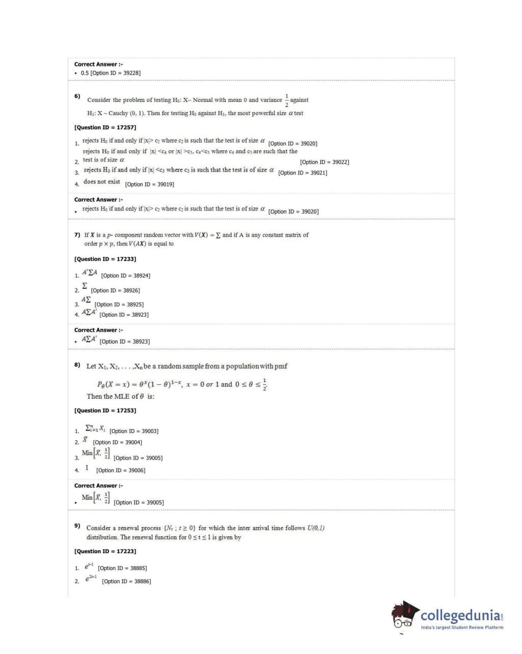 DUET 2018 M.Phil./Ph.D. in Statistics Question Paper with Answer Key PDF Shift 1