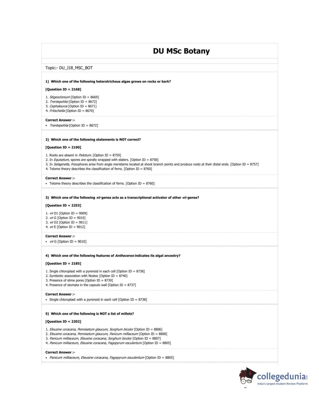 DUET 2018 M.Sc. Botany Question paper with answer key pdf conducted on June 17, 2018 in Shift 3 is available for download. The exam was successfully organized by University of Delhi. The question paper comprised a total of 100 questions.