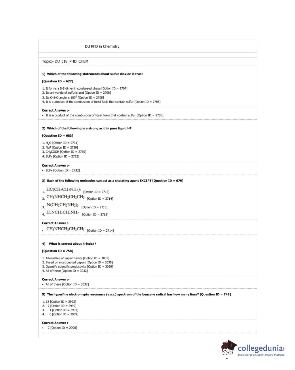DUET 2018 Ph.D. in Chemistry Question paper with answer key pdf conducted on June 18, 2018 in Shift 2 is available for download. The exam was successfully organized by University of Delhi. The question paper comprised a total of 100 questions.