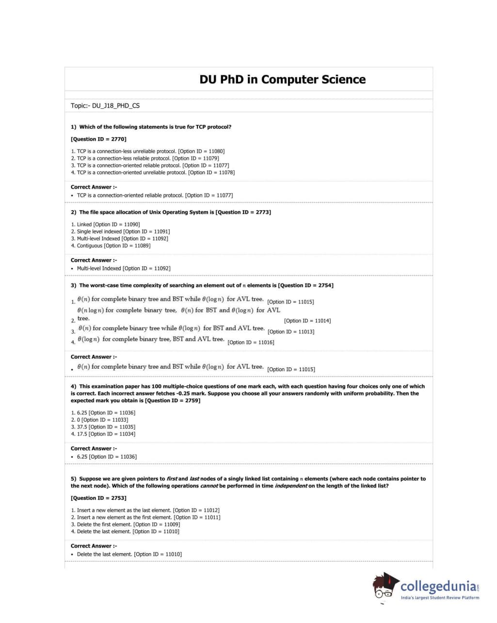 DUET 2018 Ph.D. in Computer Science Question paper with answer key pdf conducted on June 18, 2018 in Shift 1 is available for download. The exam was successfully organized by University of Delhi. The question paper comprised a total of 50 questions.