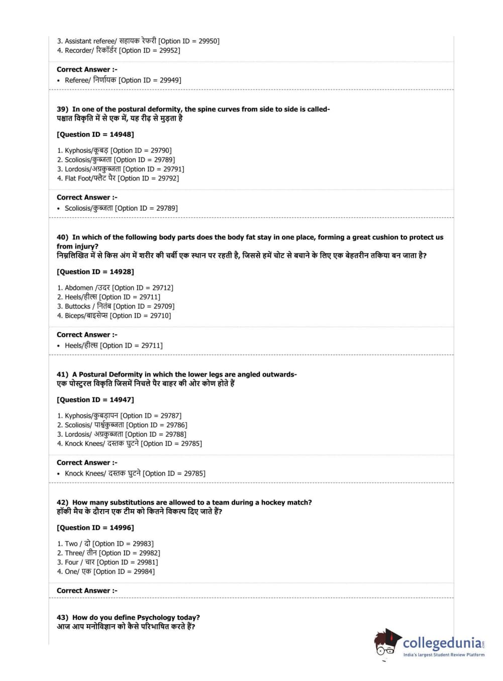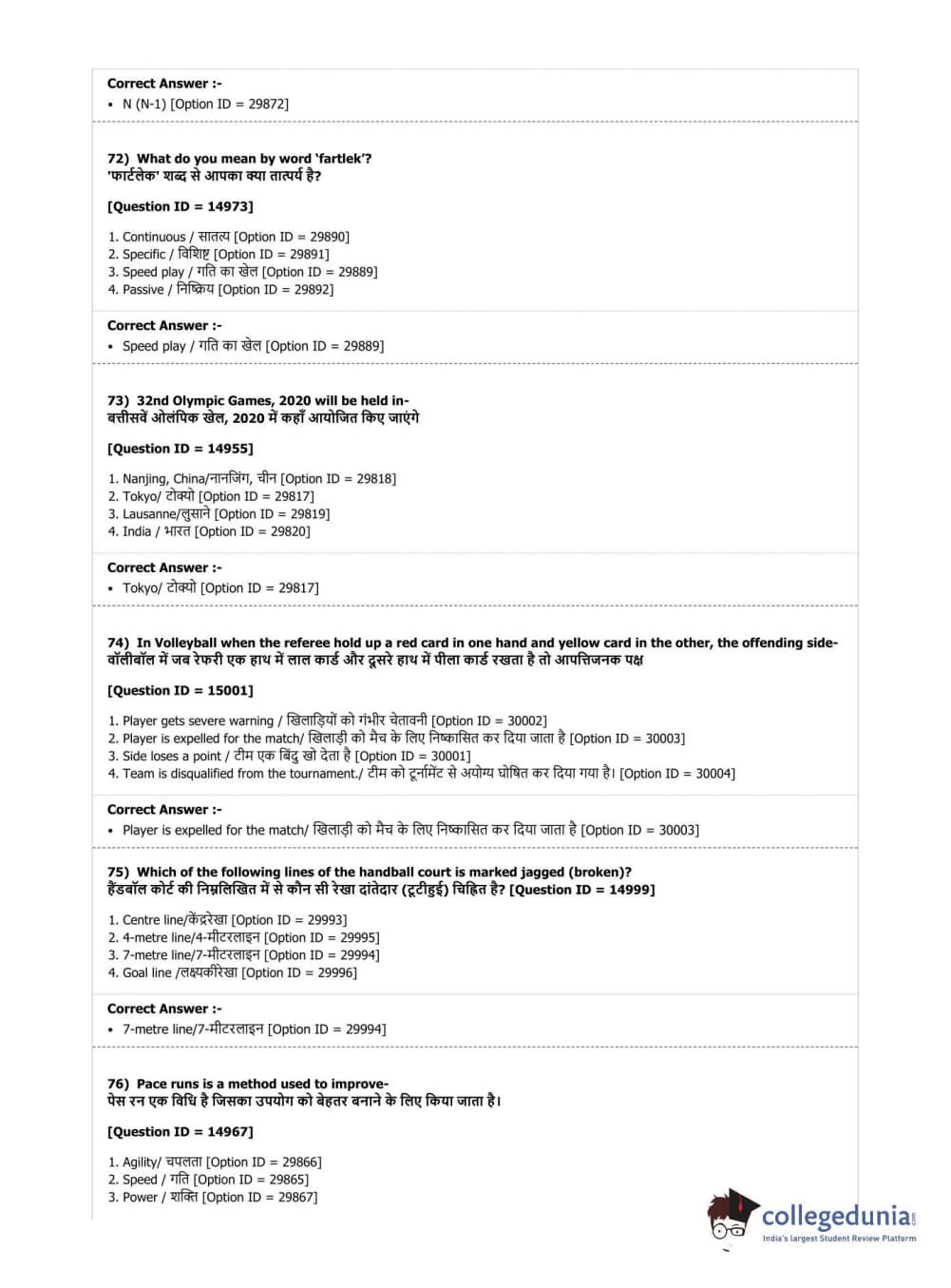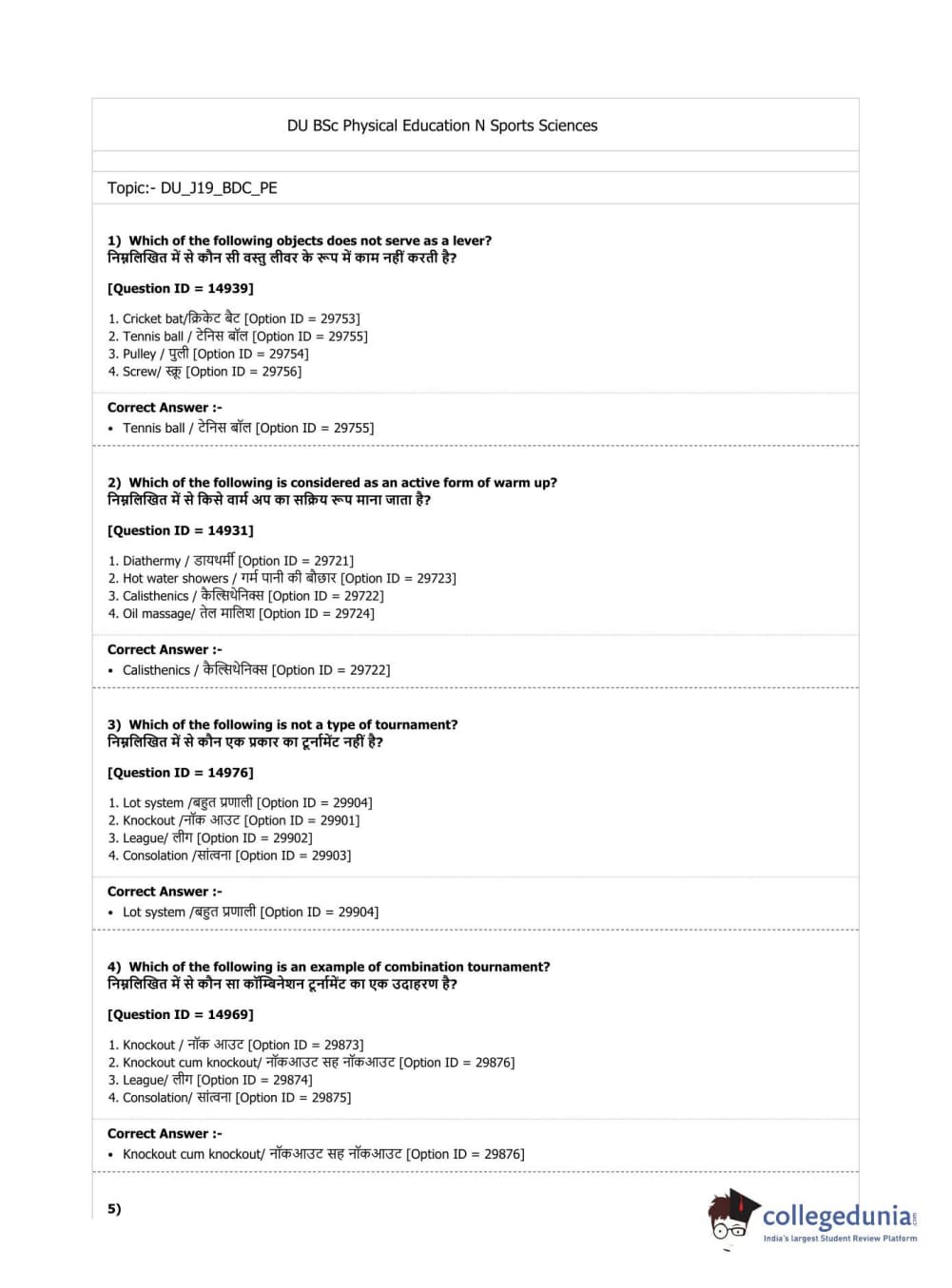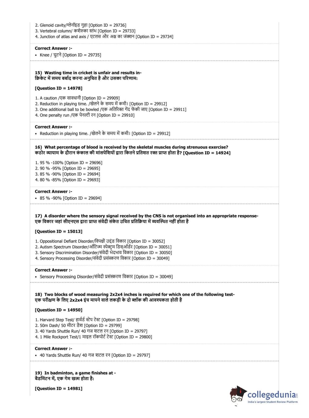 DUET 2019 B.Sc. Physical Education, Health Education & Sports Sciences Question Paper with Answer Key PDF Shift 3
