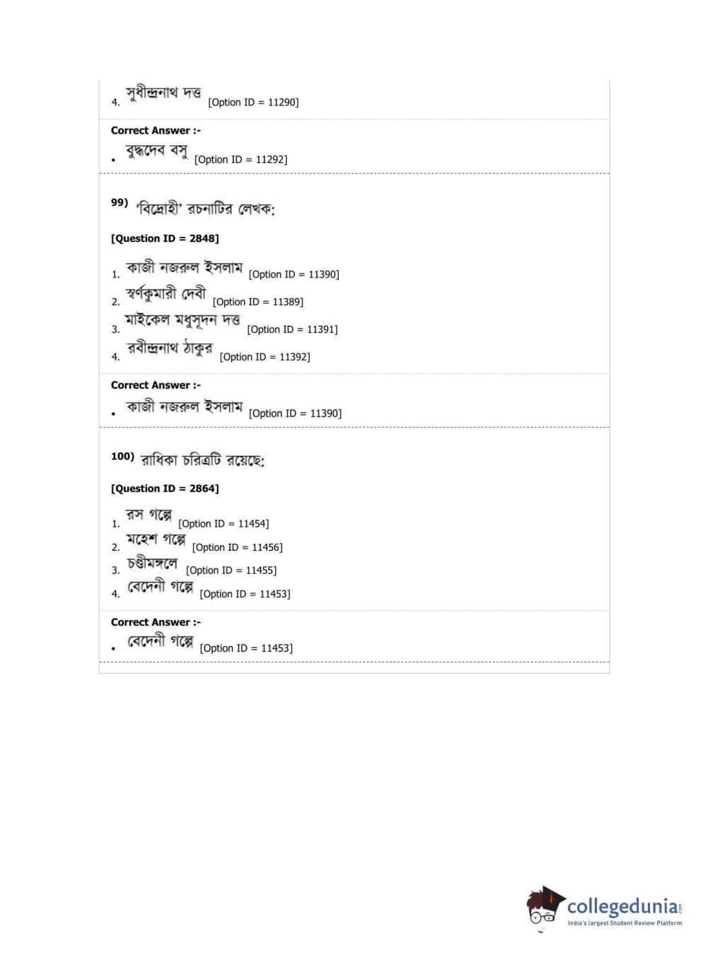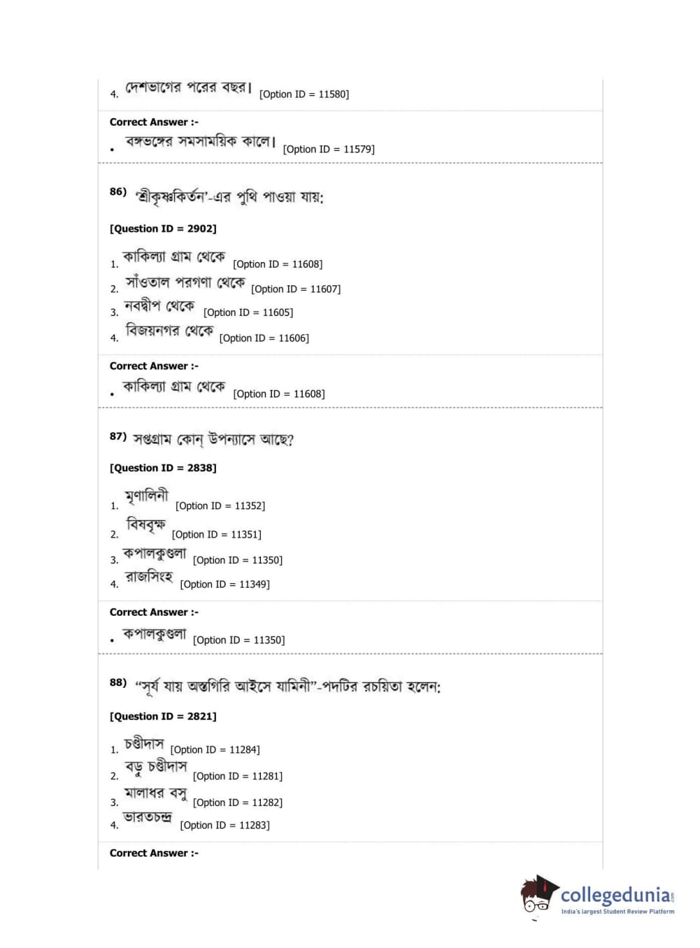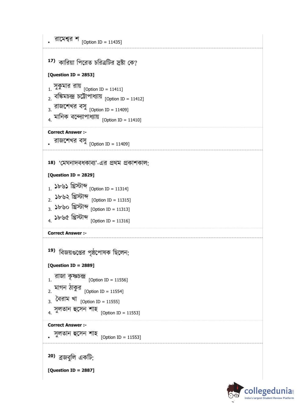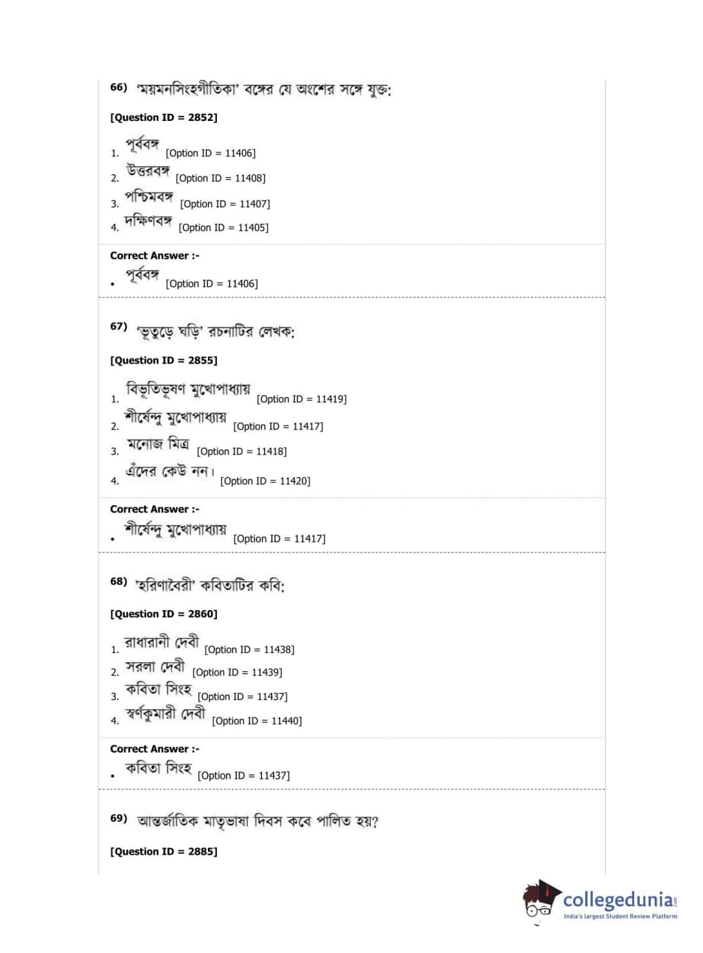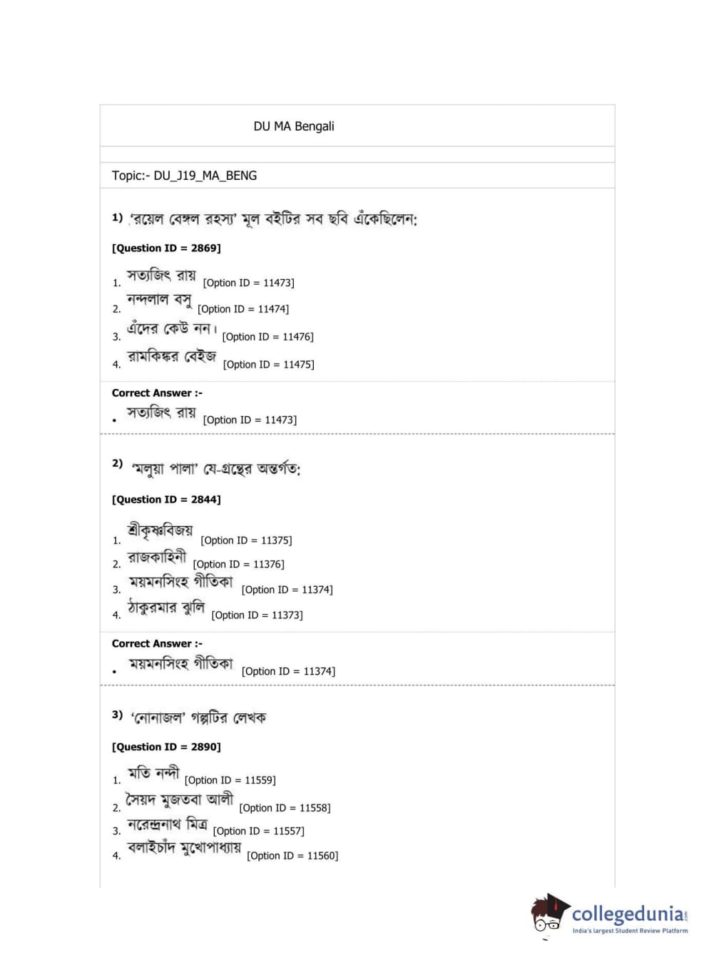 DUET 2019 M.A. Bengali Question Paper with Answer Key PDF Shift 2
