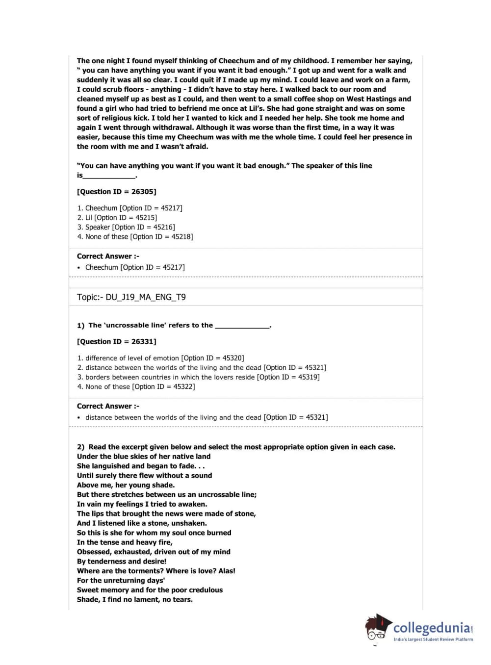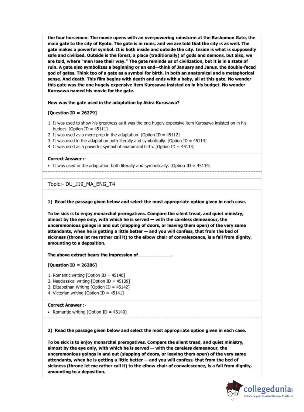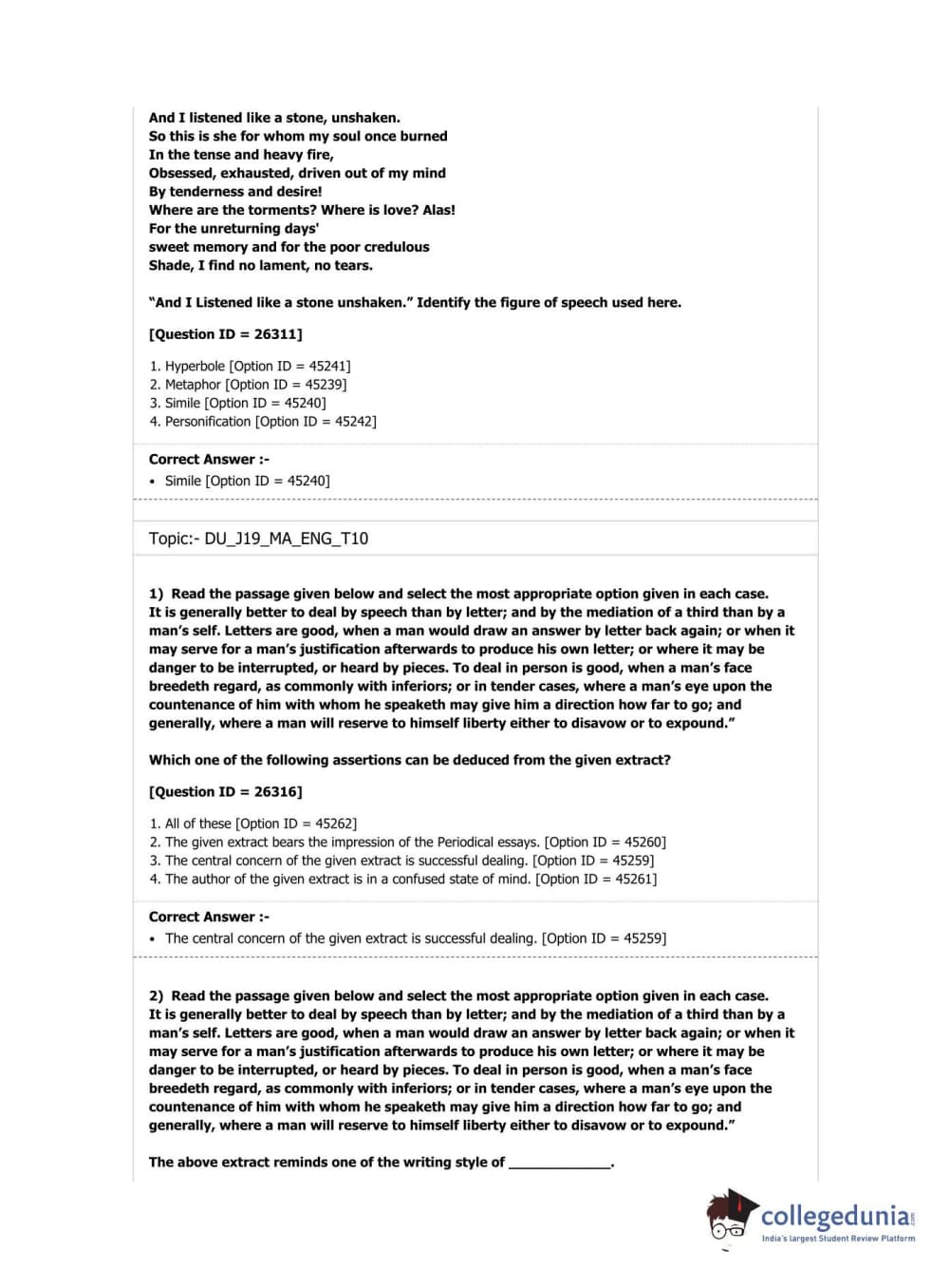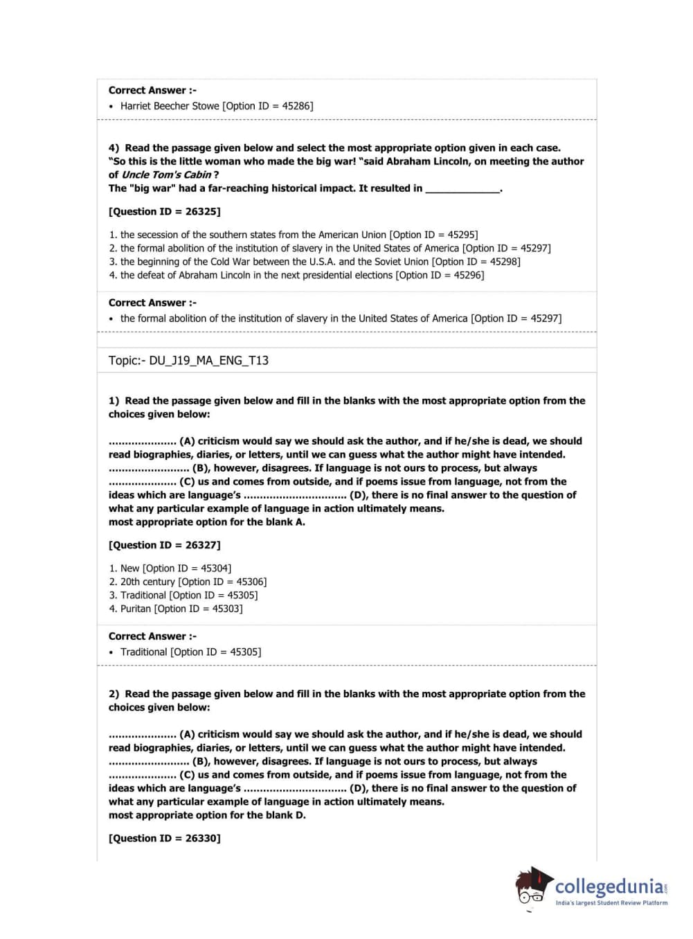 DUET 2019 M.A. English Question paper with answer key pdf conducted on May 7, 2019 in Shift 1 is available for download. The exam was successfully organized by National Testing Agency (NTA). The question paper comprised a total of 100 questions.