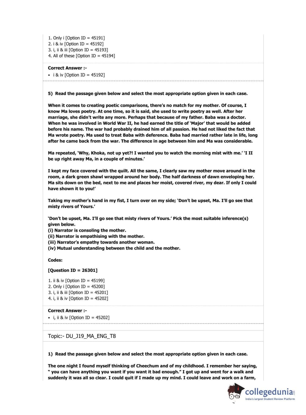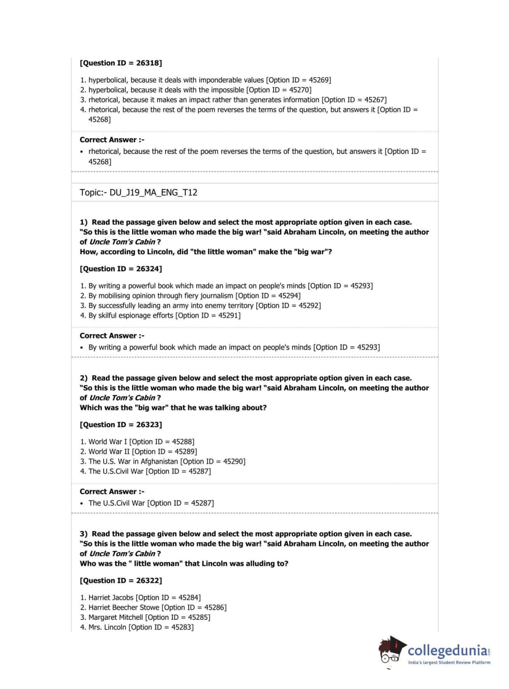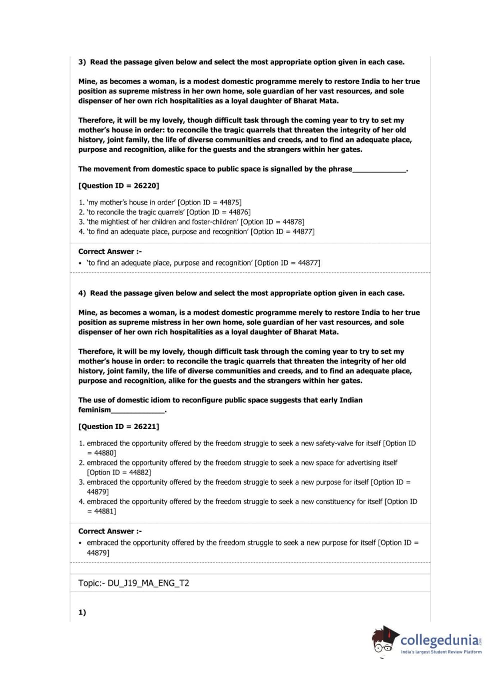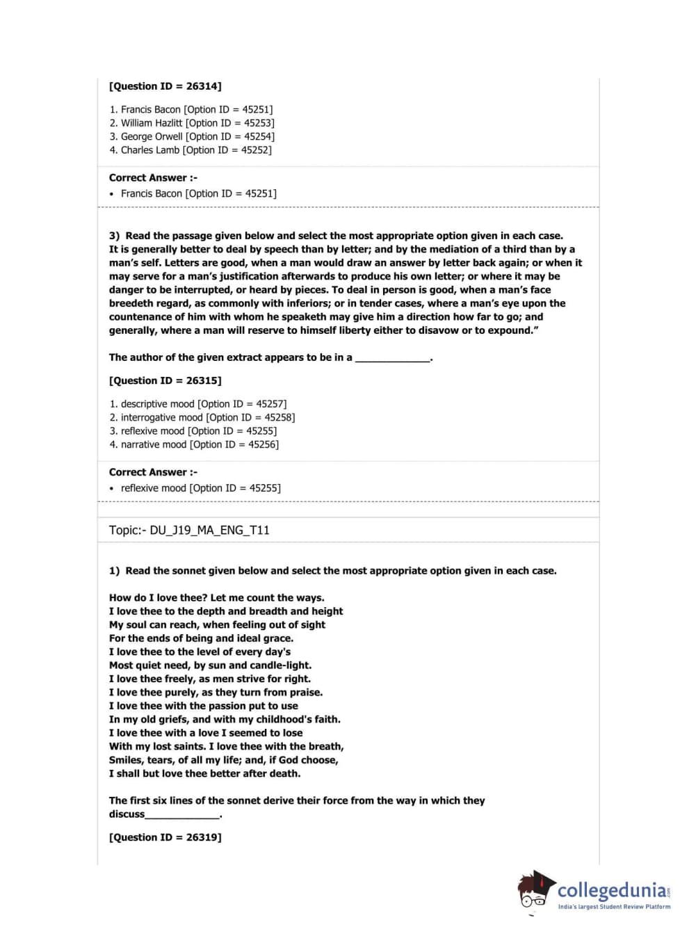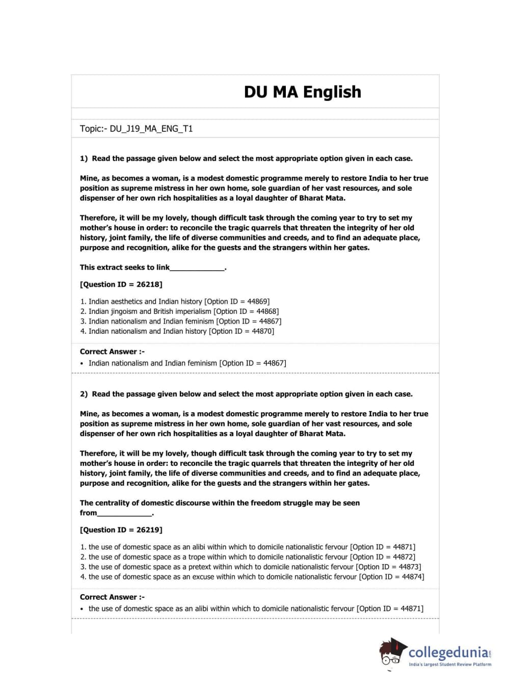 DUET 2019 M.A. English Question paper with answer key pdf conducted on May 7, 2019 in Shift 1 is available for download. The exam was successfully organized by National Testing Agency (NTA). The question paper comprised a total of 100 questions.