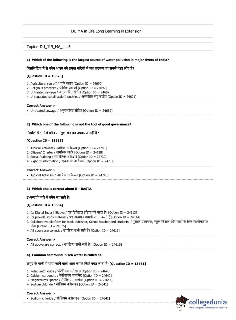 DUET 2019 M.A. in Life Long Learning & Extension Question Paper with Answer Key PDF Shift 3