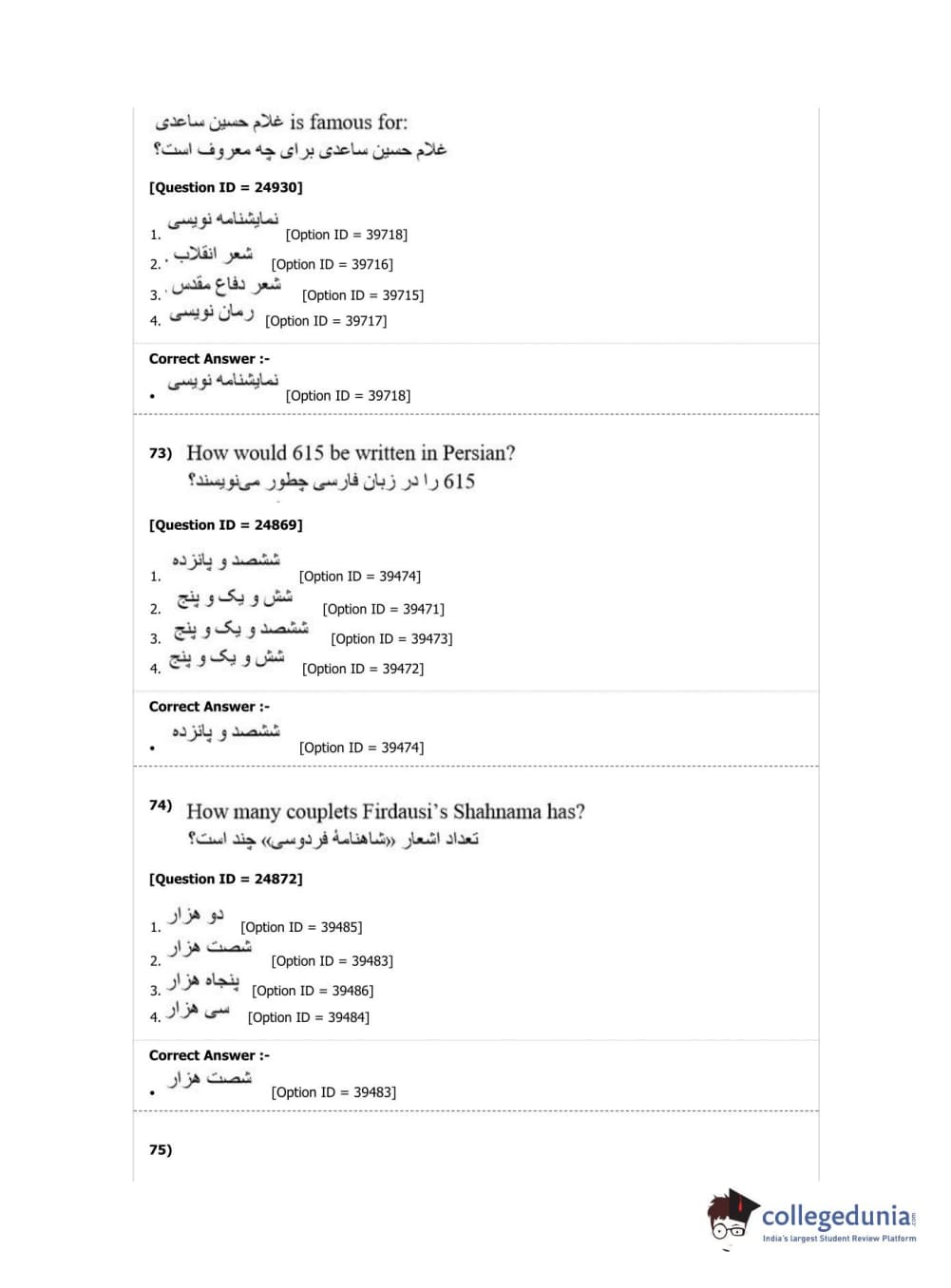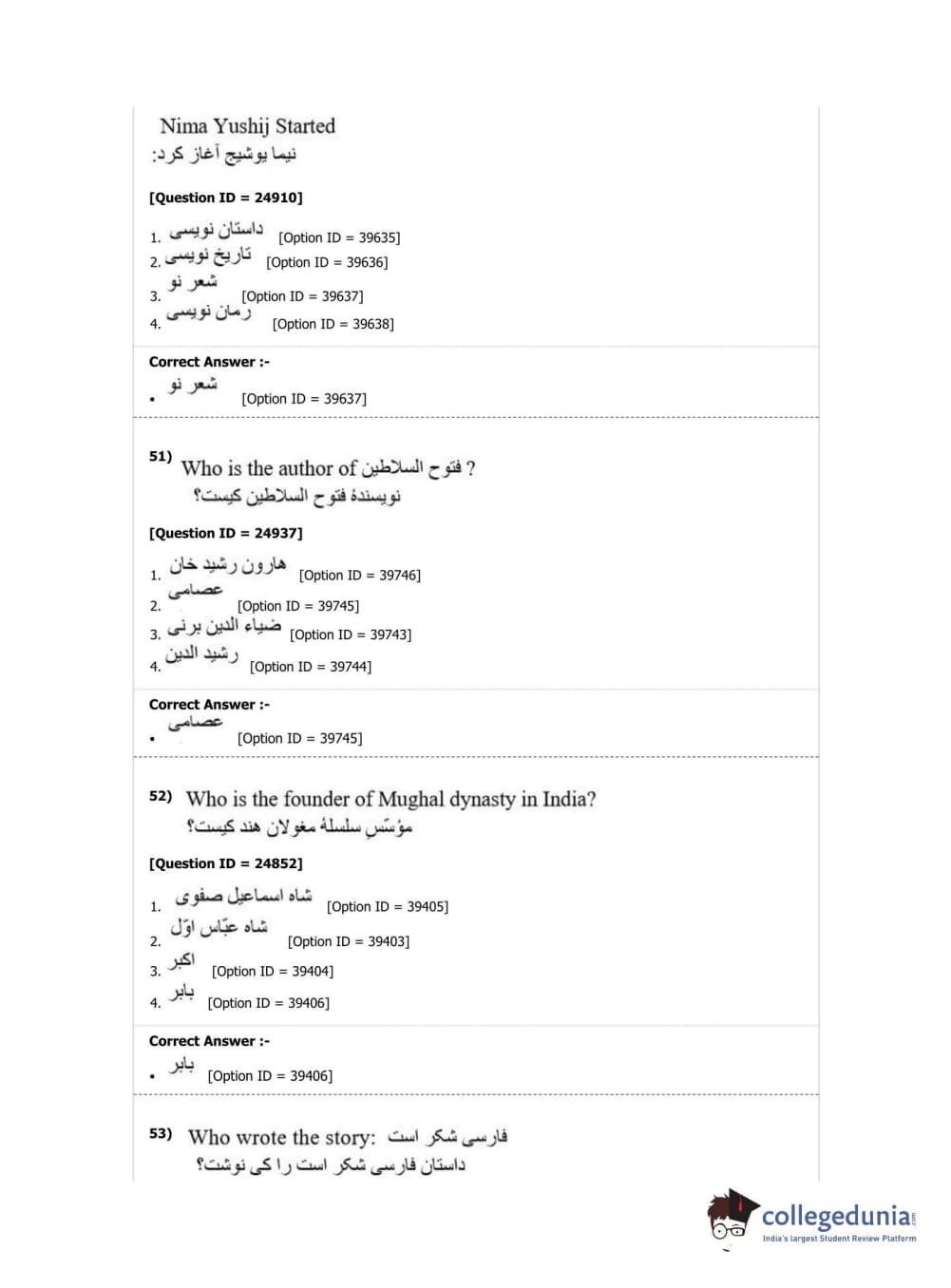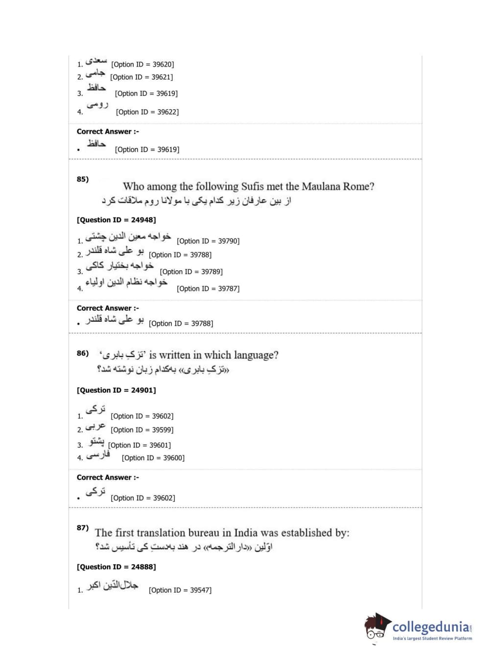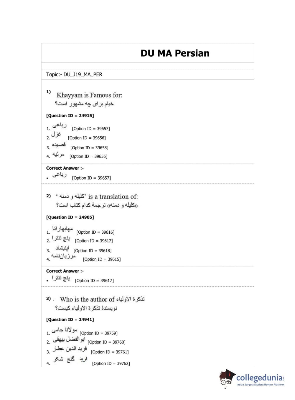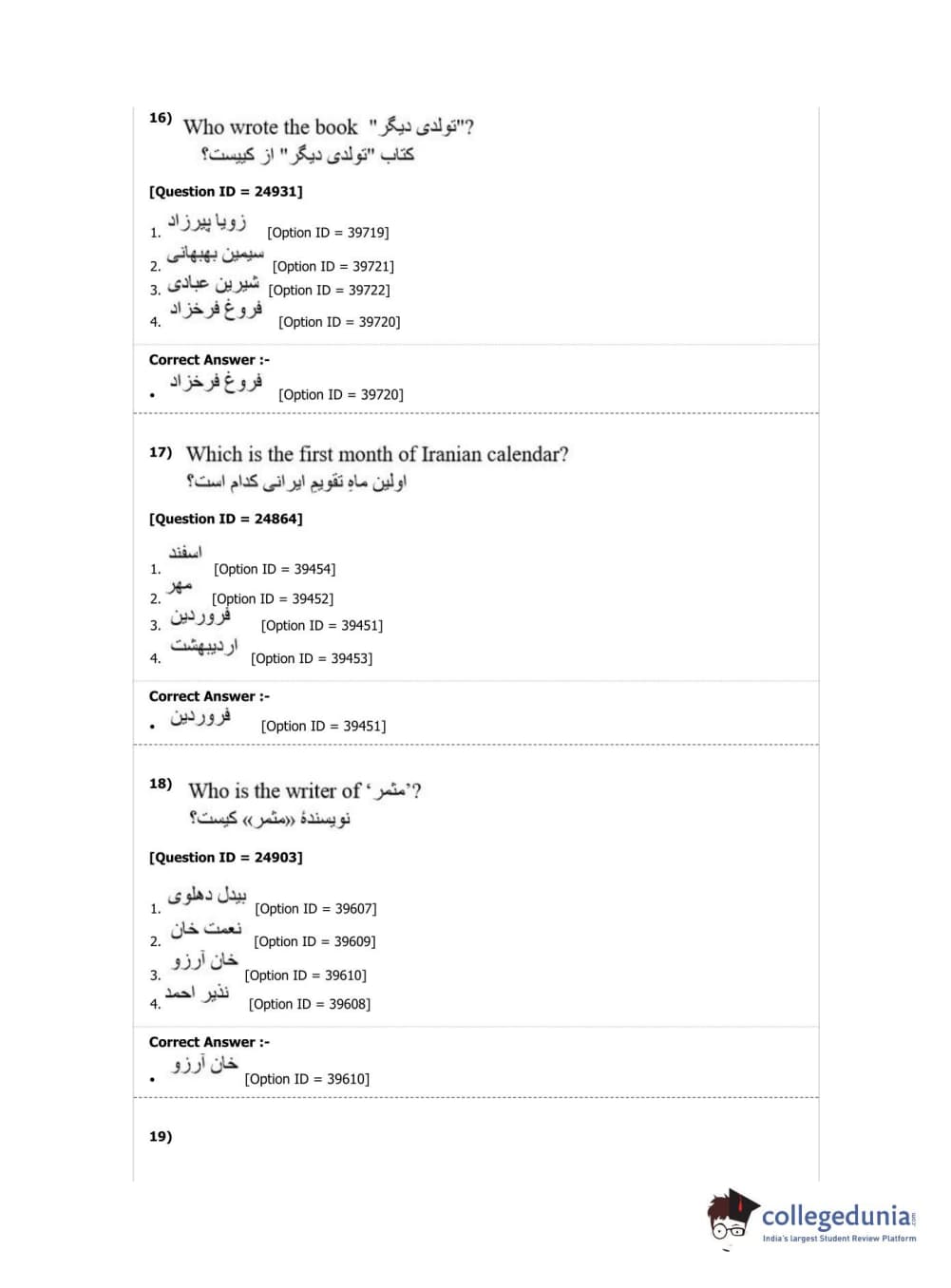 DUET 2019 M.A. Persian Question Paper with Answer Key PDF Shift 2