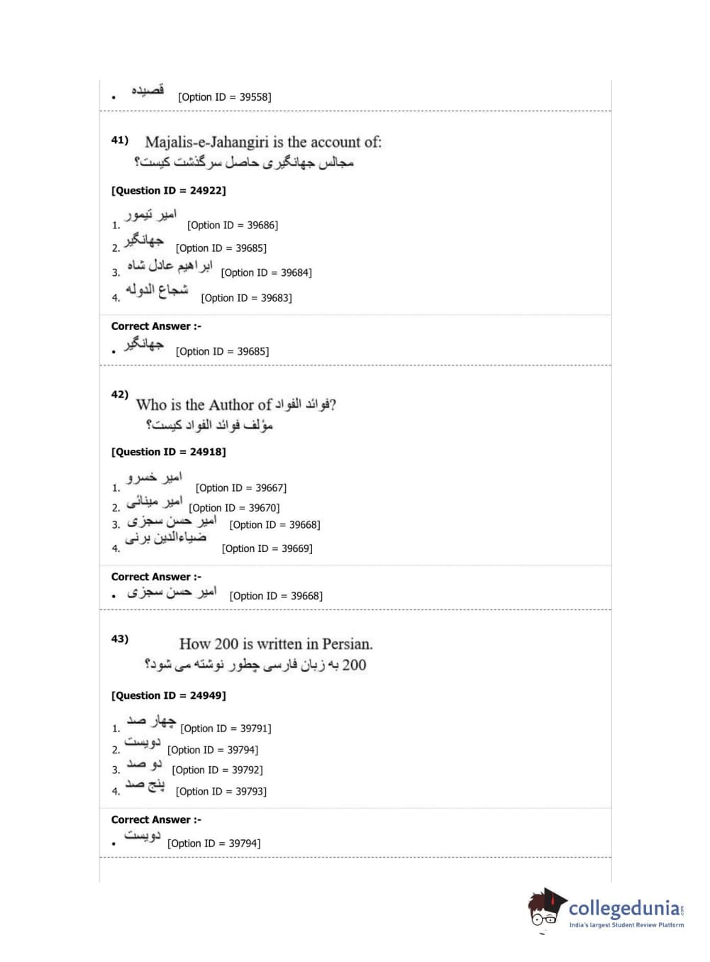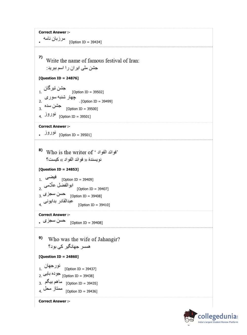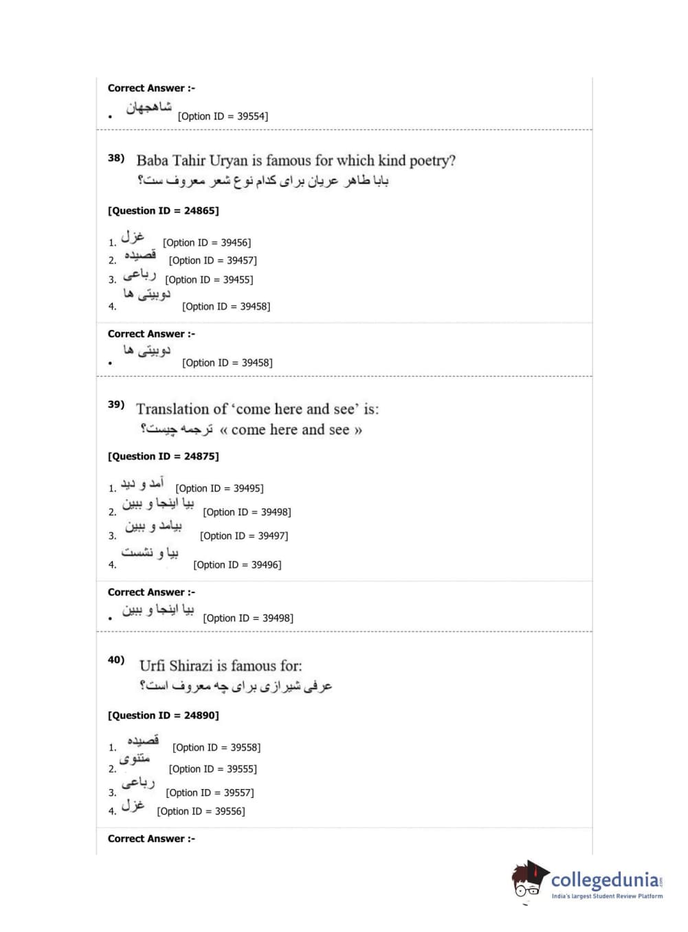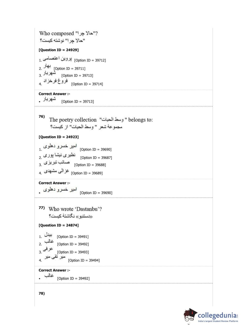 DUET 2019 M.A. Persian Question Paper with Answer Key PDF Shift 2