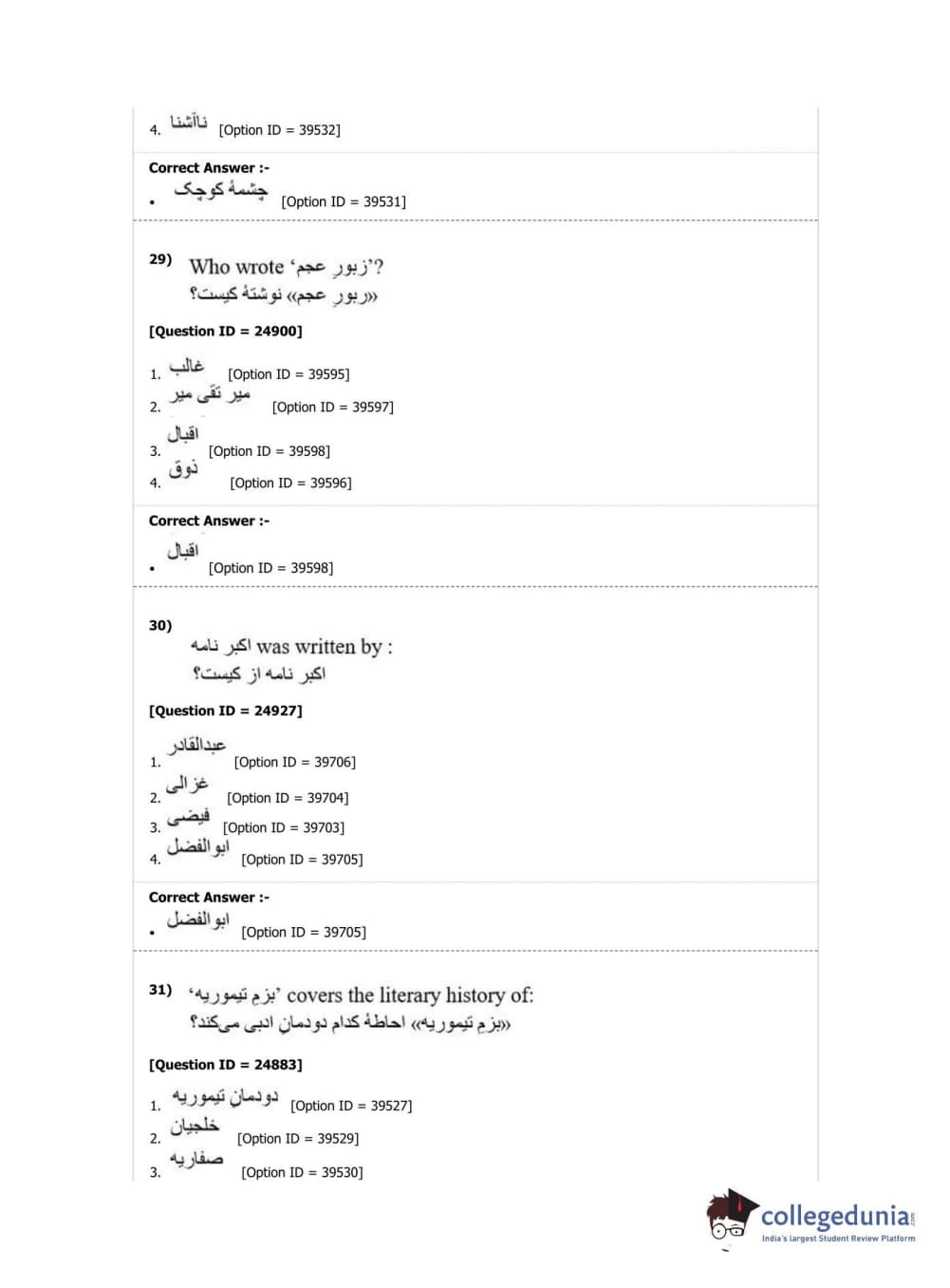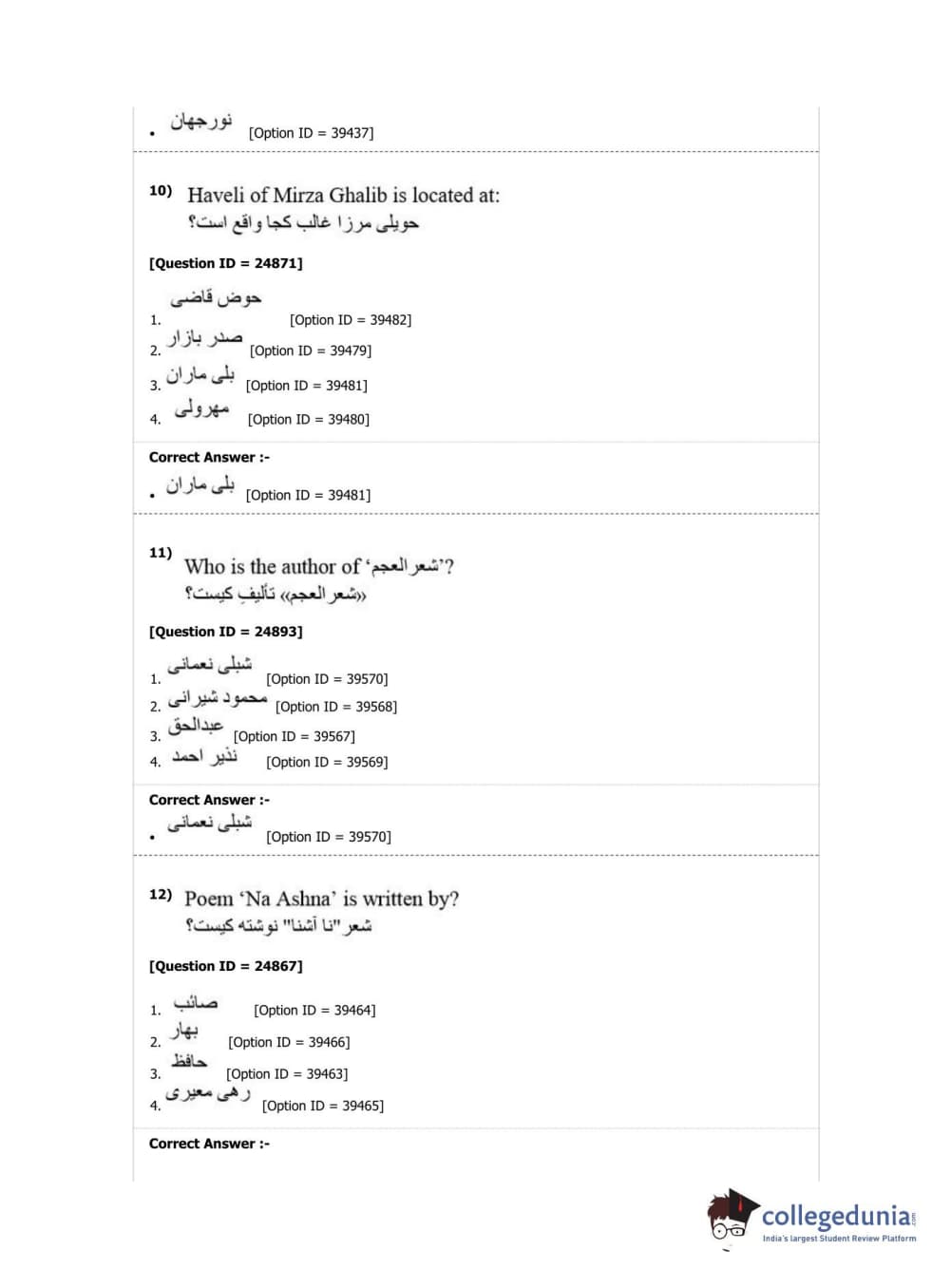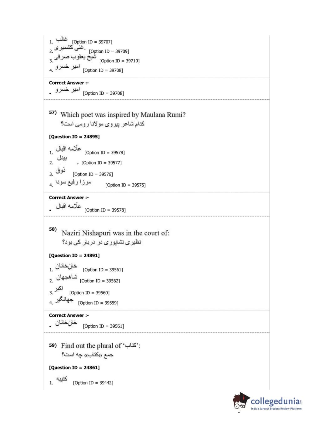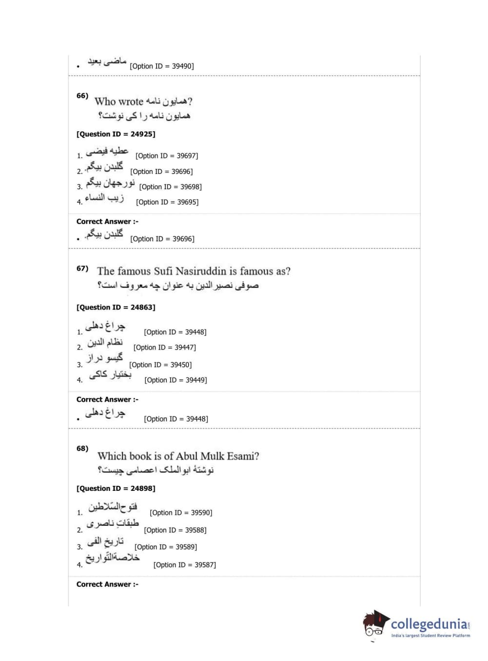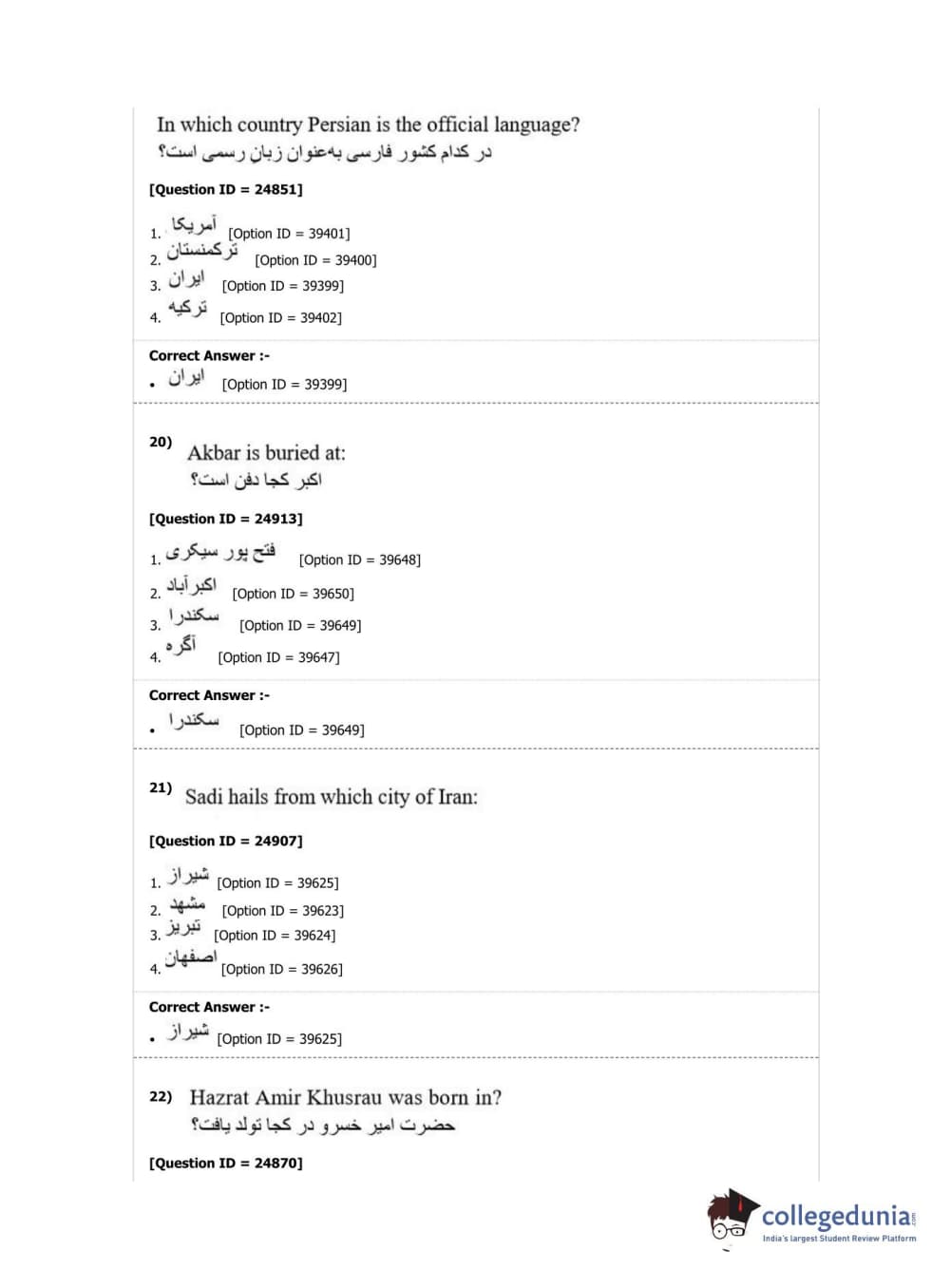 DUET 2019 M.A. Persian Question Paper with Answer Key PDF Shift 2
