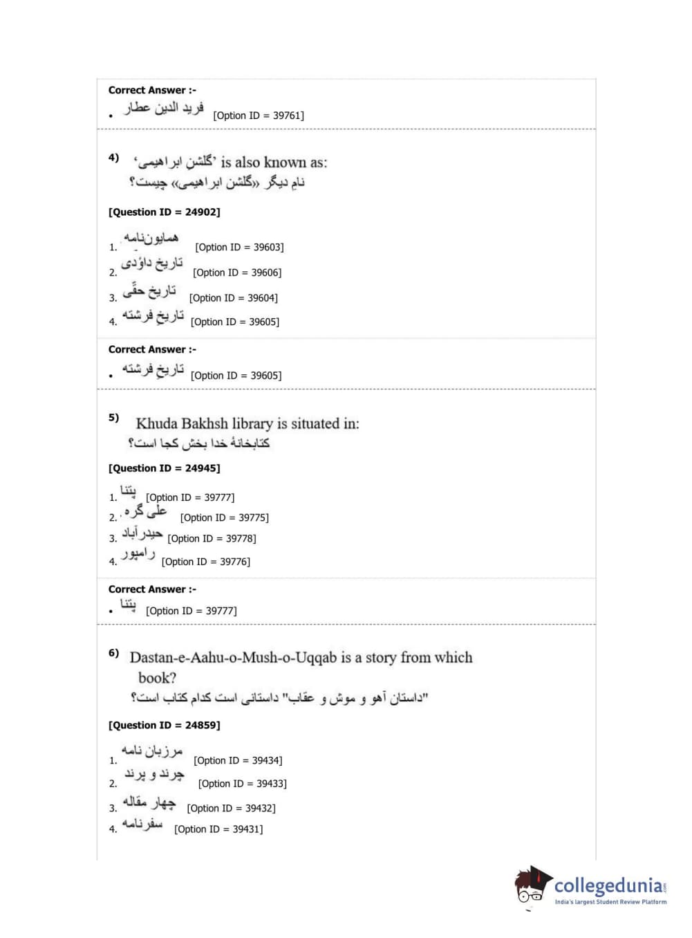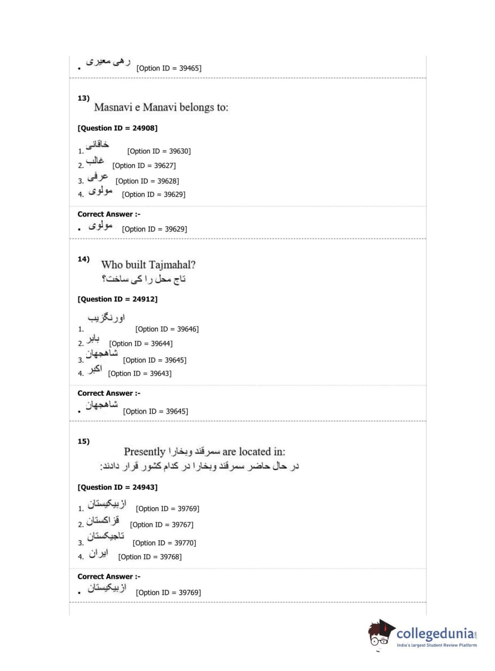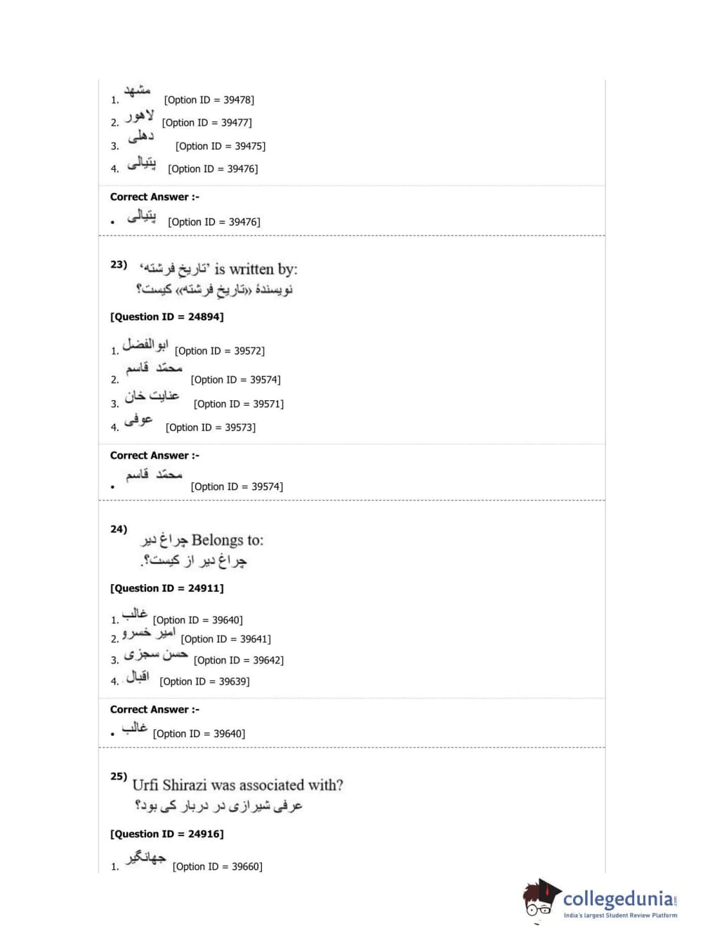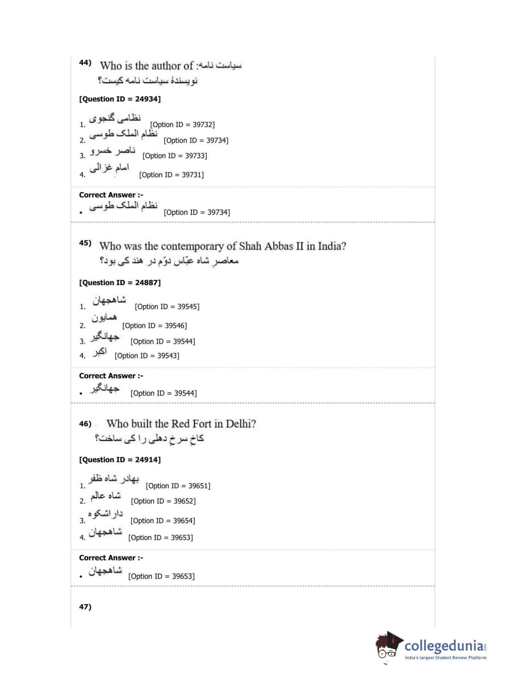 DUET 2019 M.A. Persian Question Paper with Answer Key PDF Shift 2