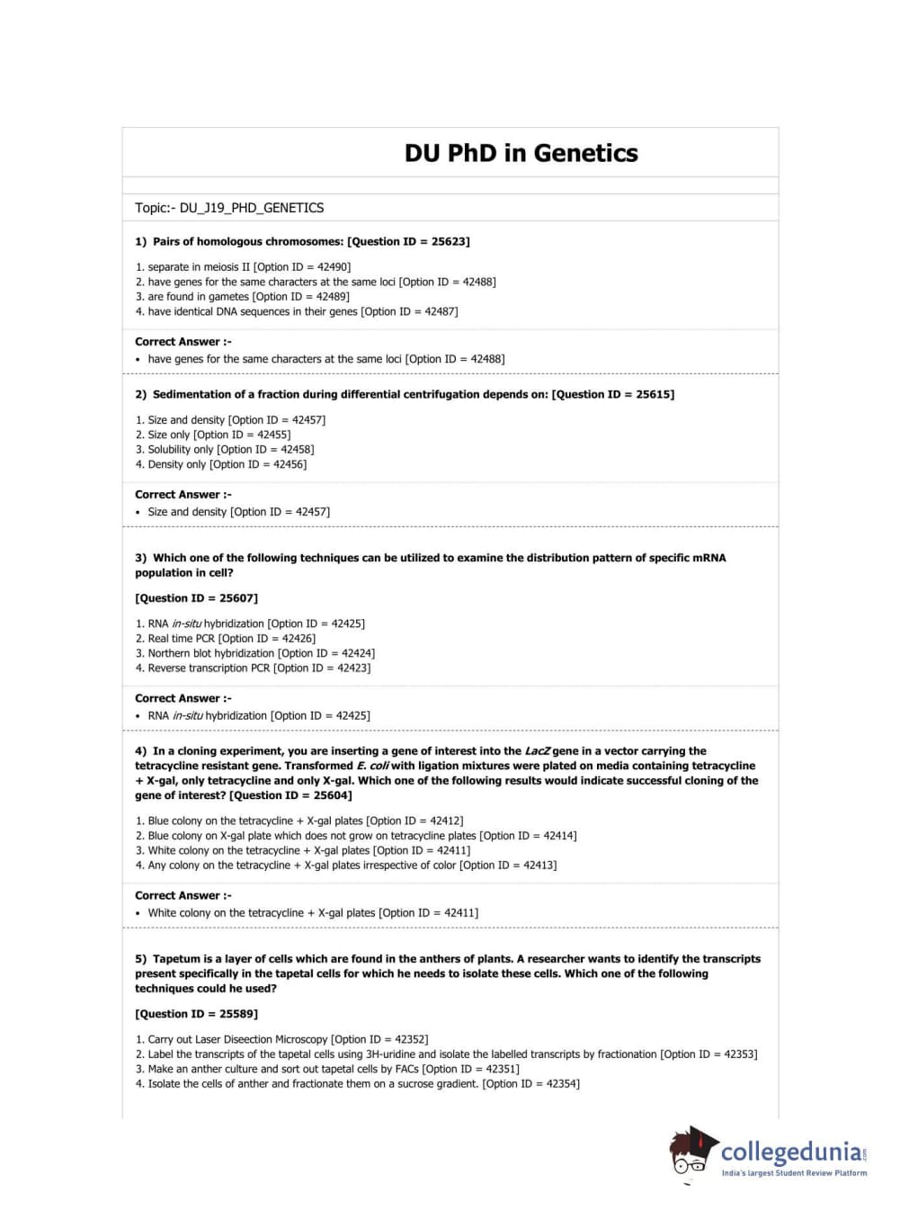DUET 2019 M.Phil./Ph.D. in Genetics Question paper with answer key pdf conducted on May 7, 2019 in Shift 3 is available for download. The exam was successfully organized by National Testing Agency (NTA). The question paper comprised a total of 50 questions.