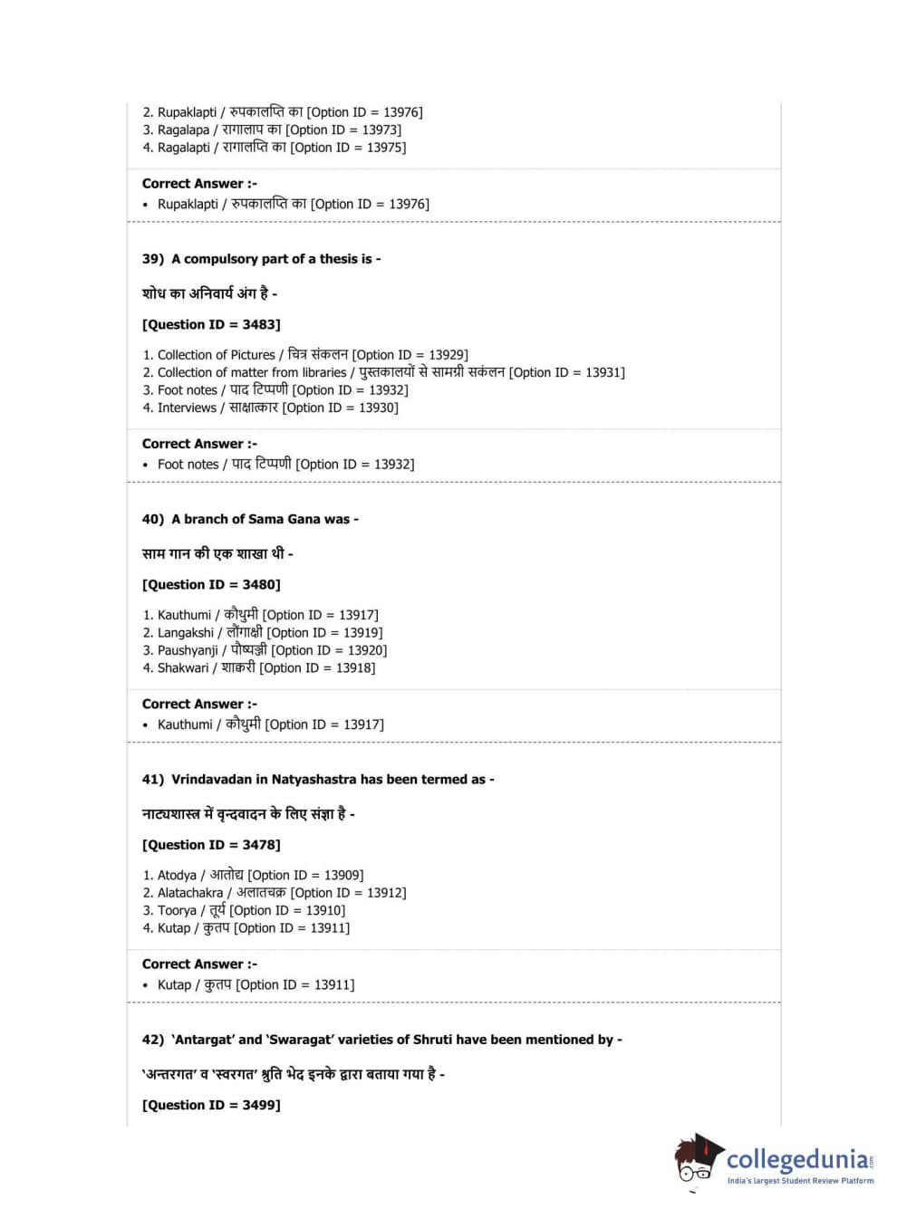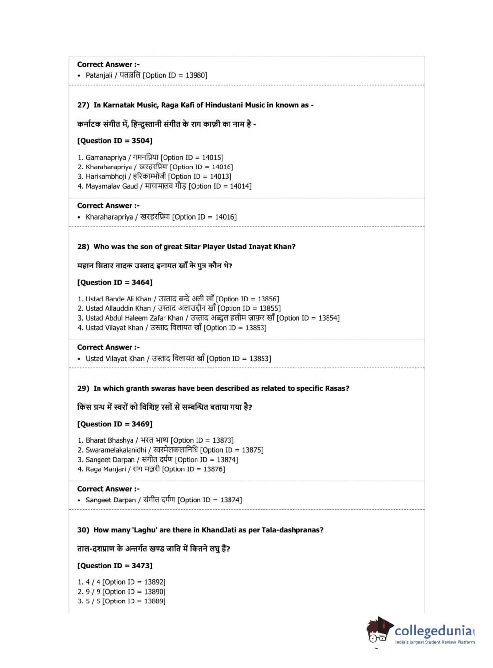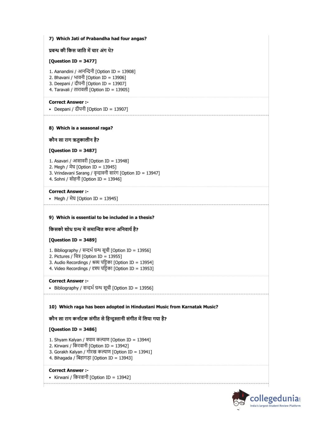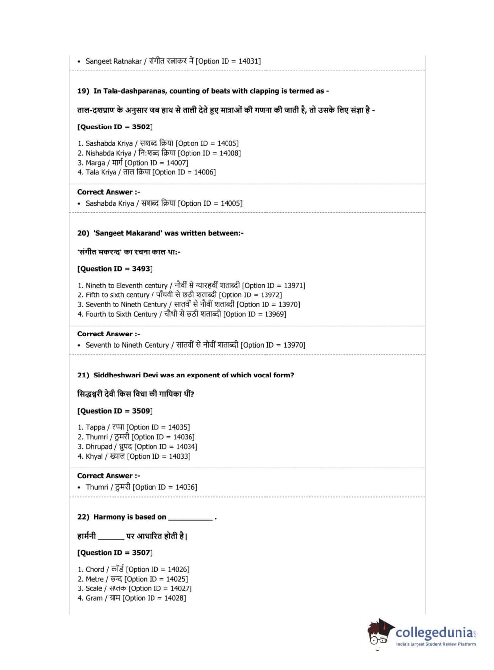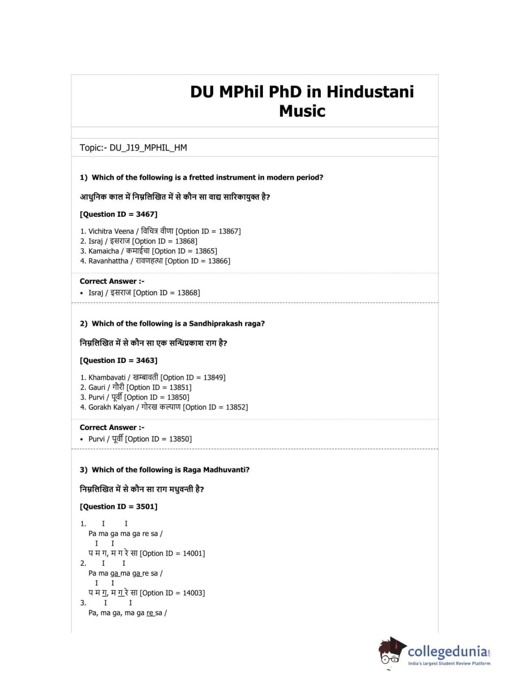 DUET 2019 M.Phil./Ph.D. in Hindustani Music Question Paper with Answer Key PDF Shift 1