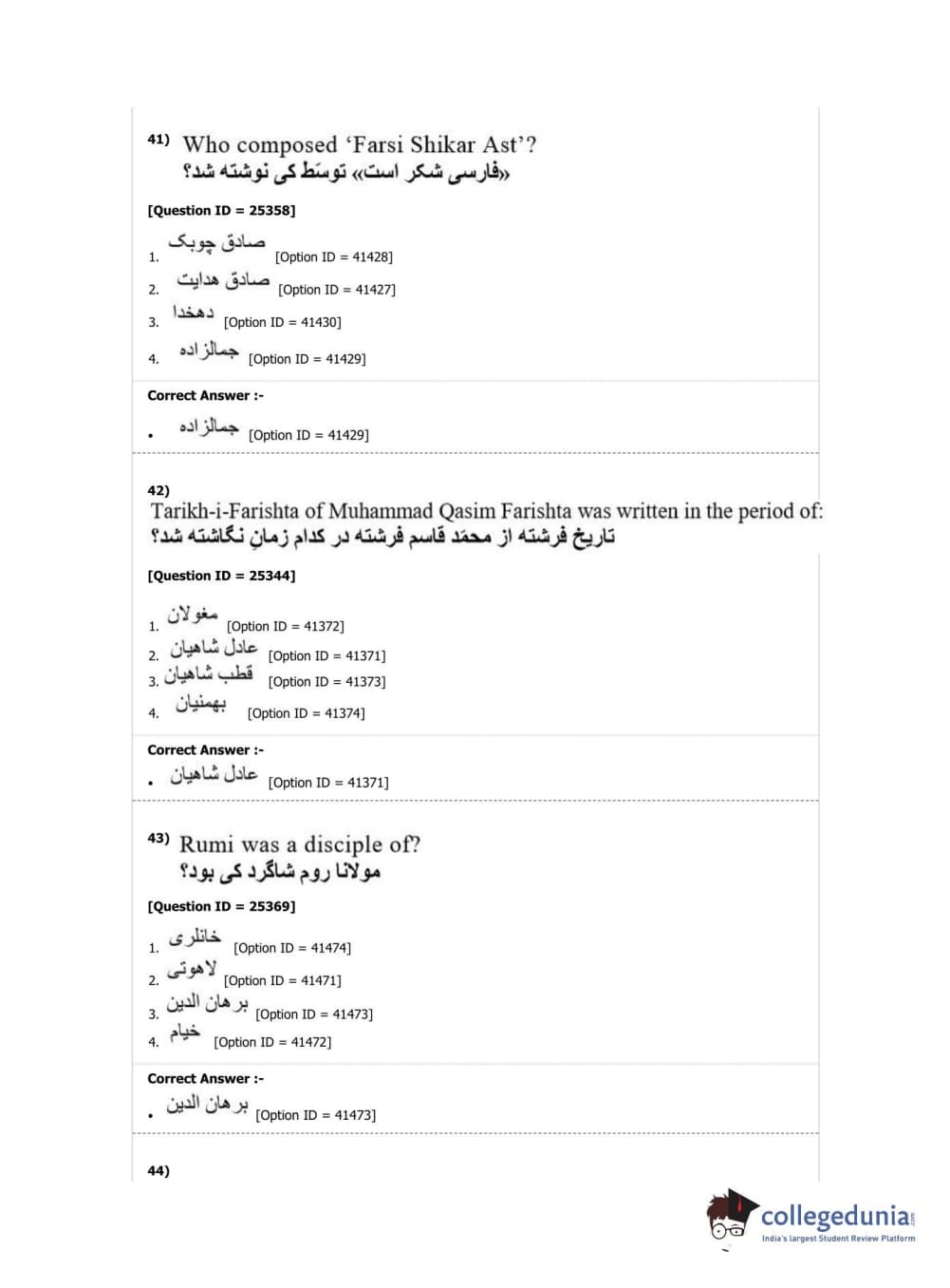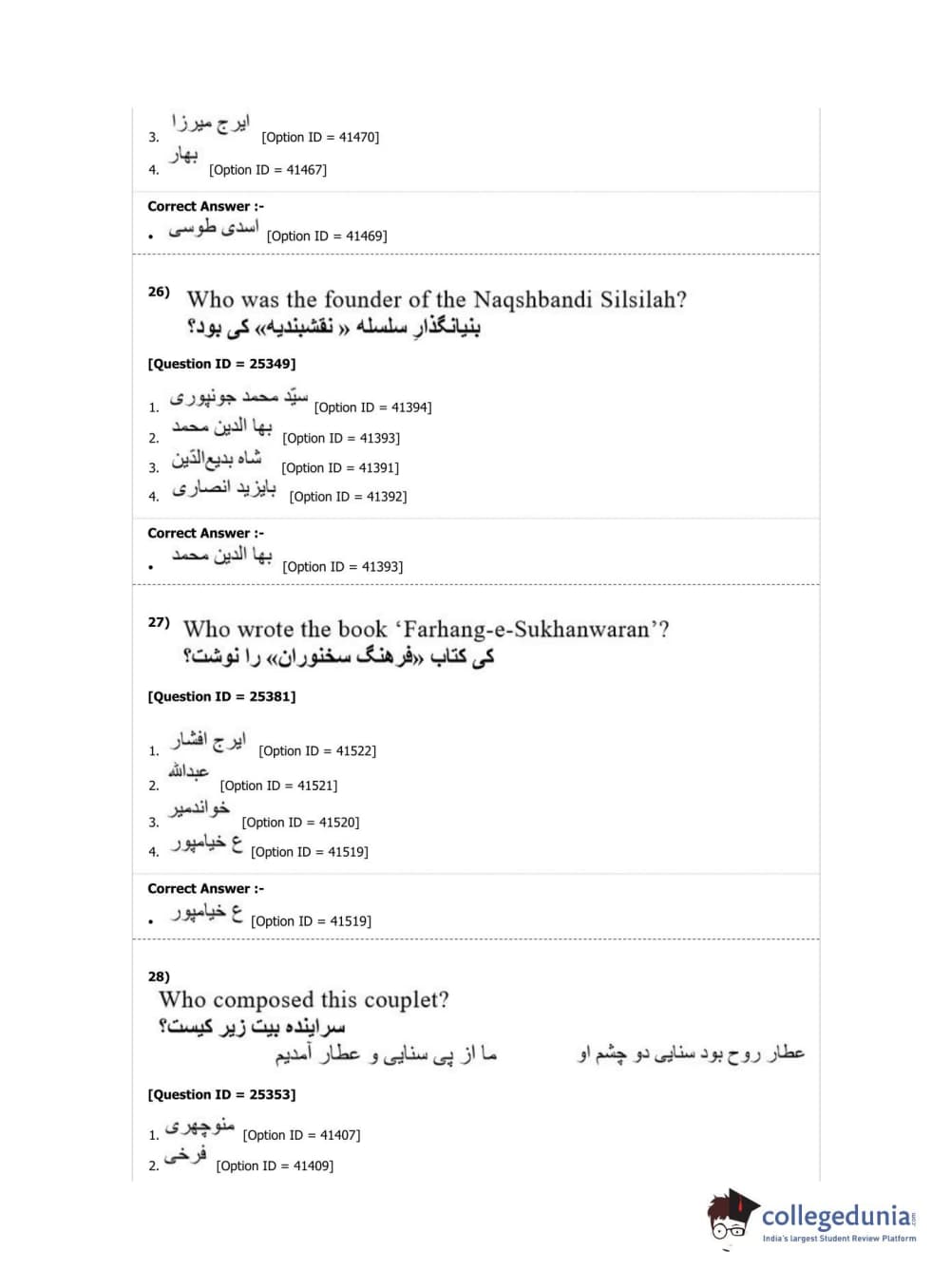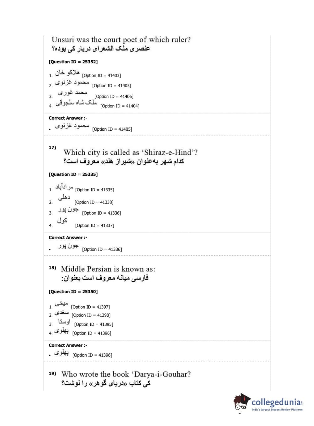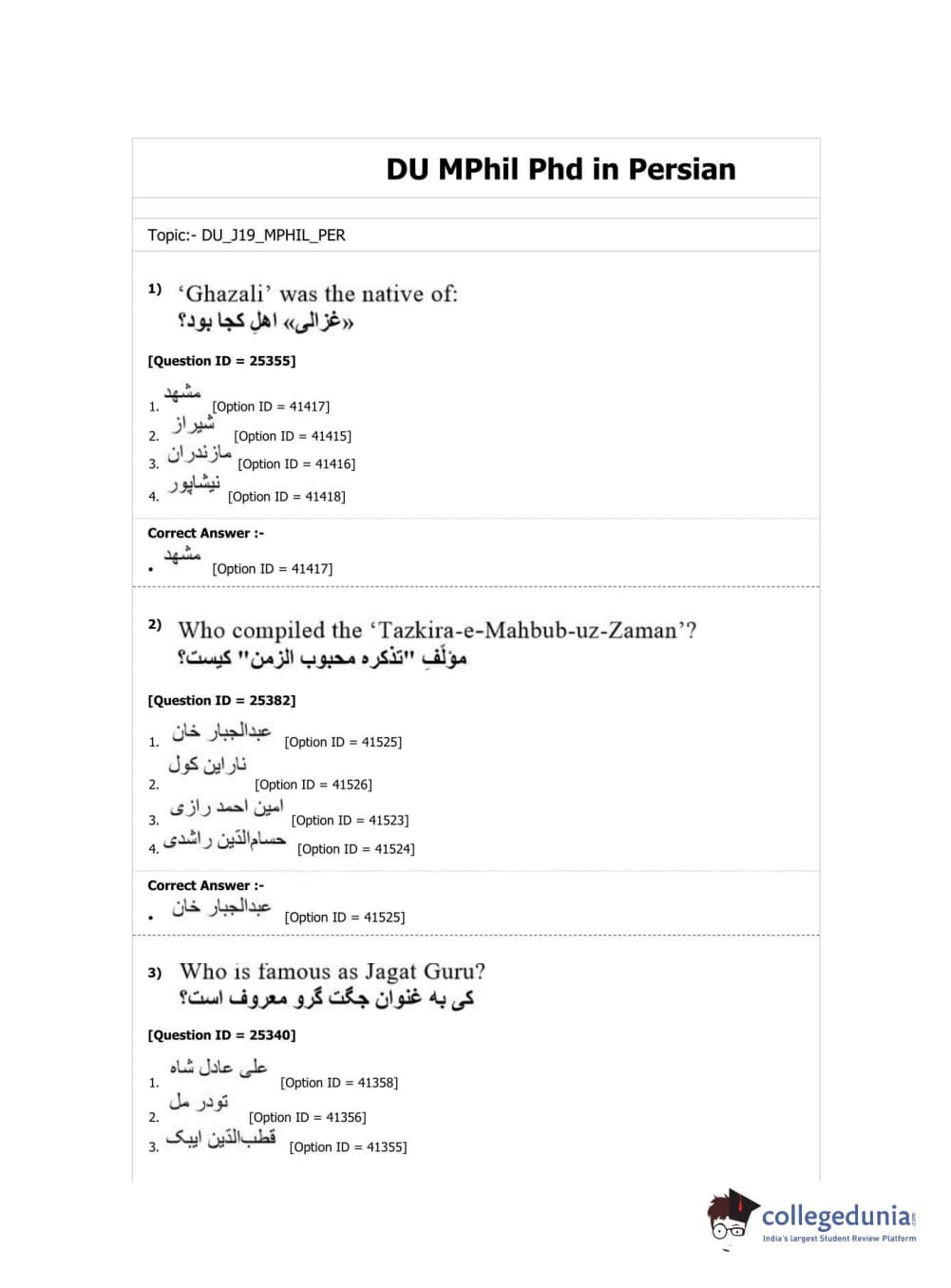 DUET 2019 M.Phil./Ph.D. in Persian Question Paper with Answer Key PDF Shift 2
