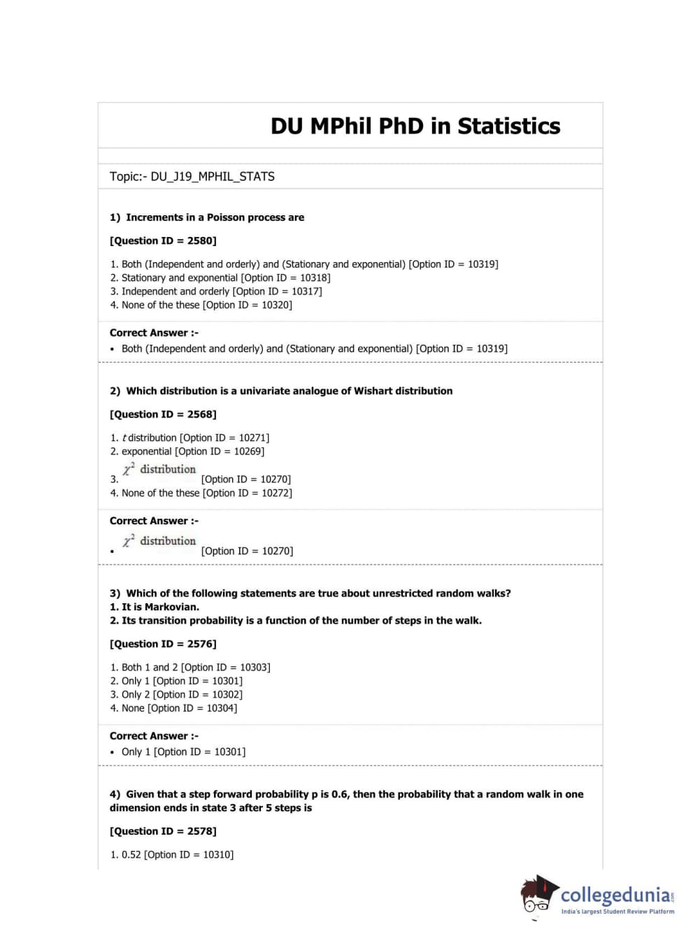 DUET 2019 M.Phil./Ph.D. in Statistics Question paper with answer key pdf conducted on May 7, 2019 in Shift 1 is available for download. The exam was successfully organized by National Testing Agency (NTA). The question paper comprised a total of 50 questions.