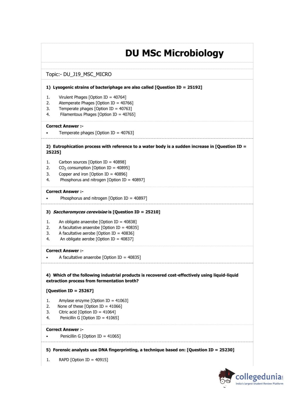 DUET 2019 M.Sc. Microbiology Question paper with answer key pdf conducted on April 7, 2019 in Shift 2 is available for download. The exam was successfully organized by National Testing Agency (NTA). The question paper comprised a total of 100 questions.