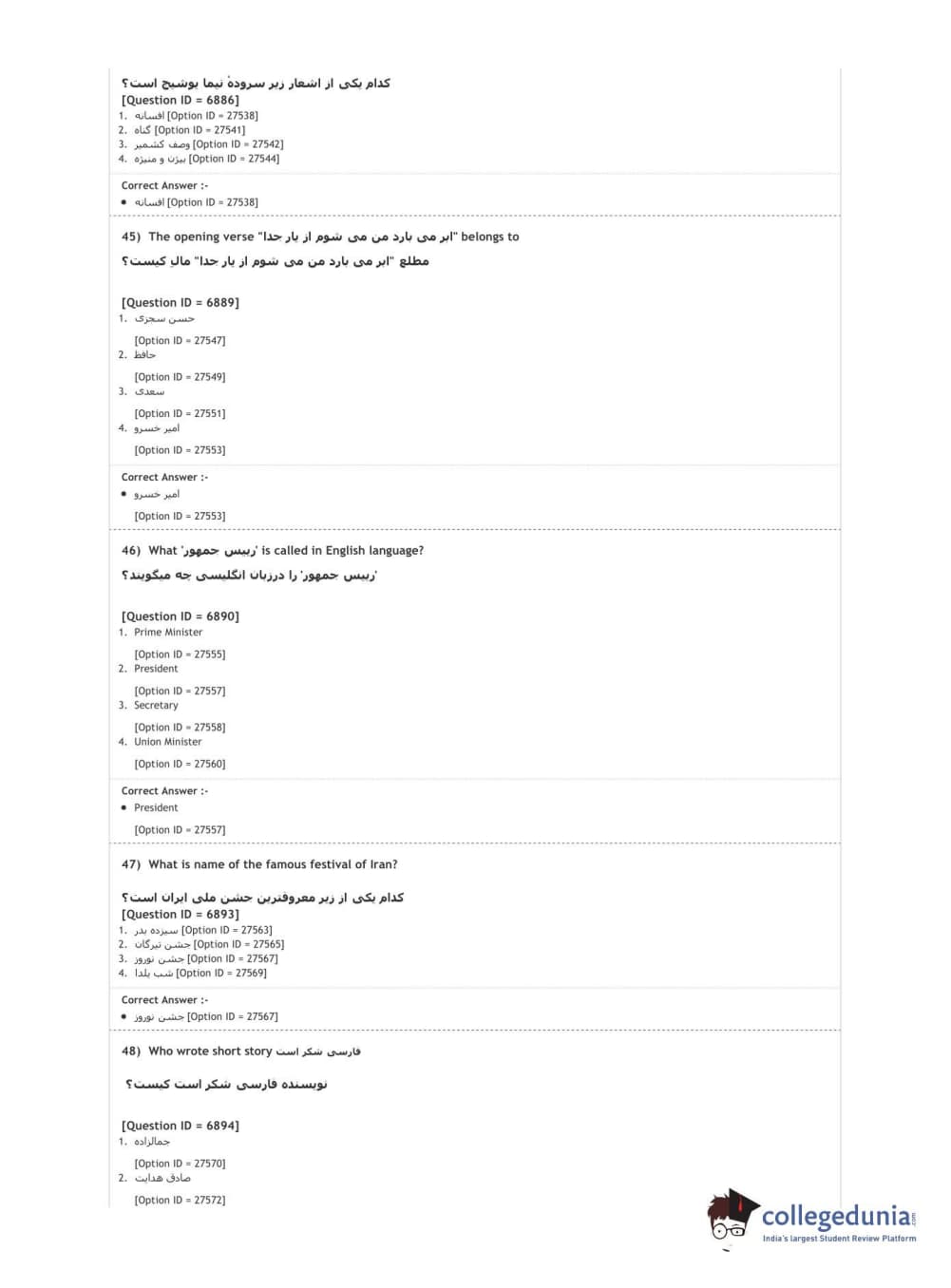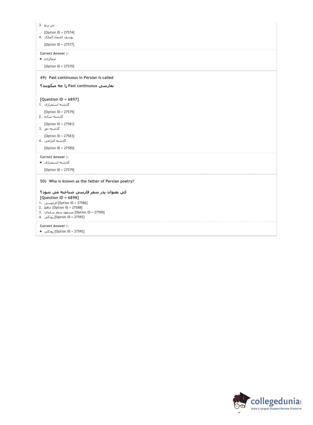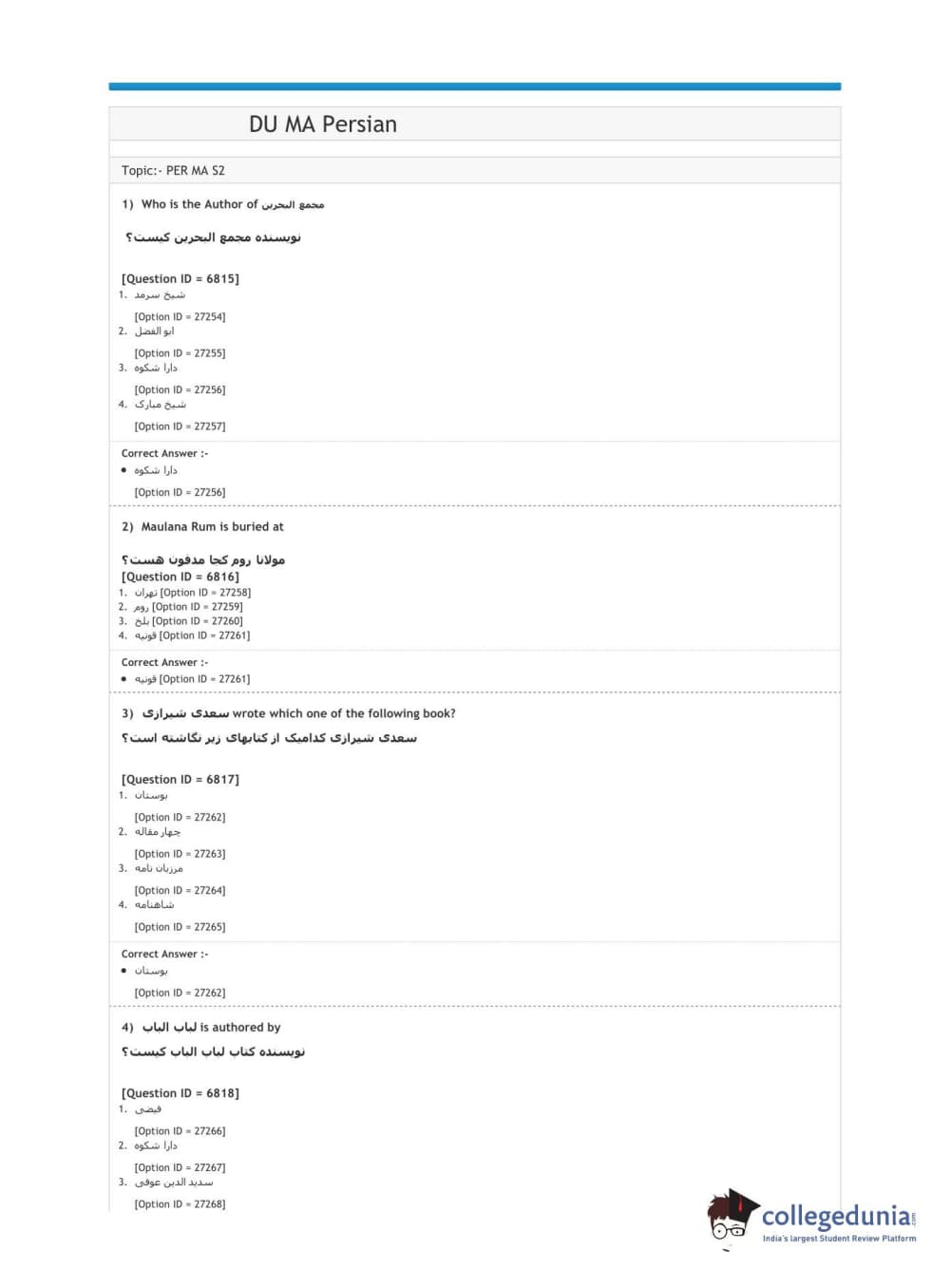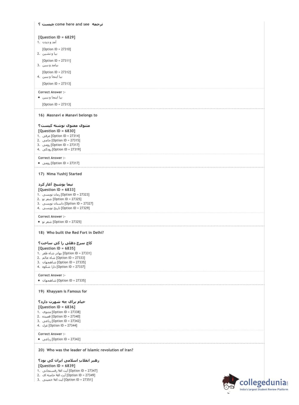 DUET 2020 M.A. Persian Question Paper with Answer Key PDF Shift 2