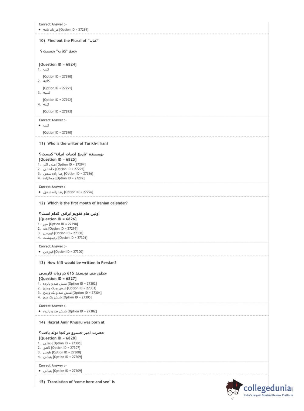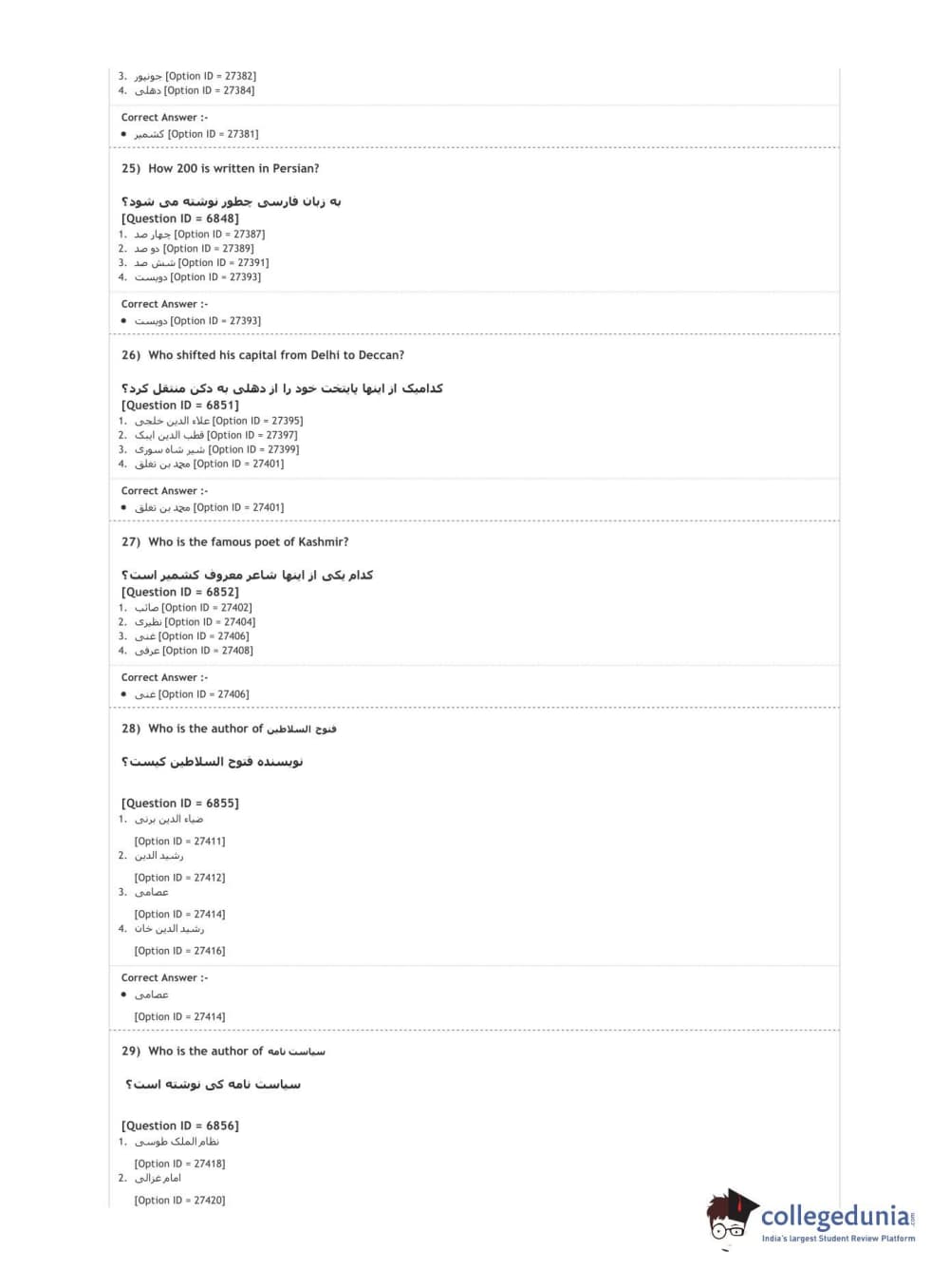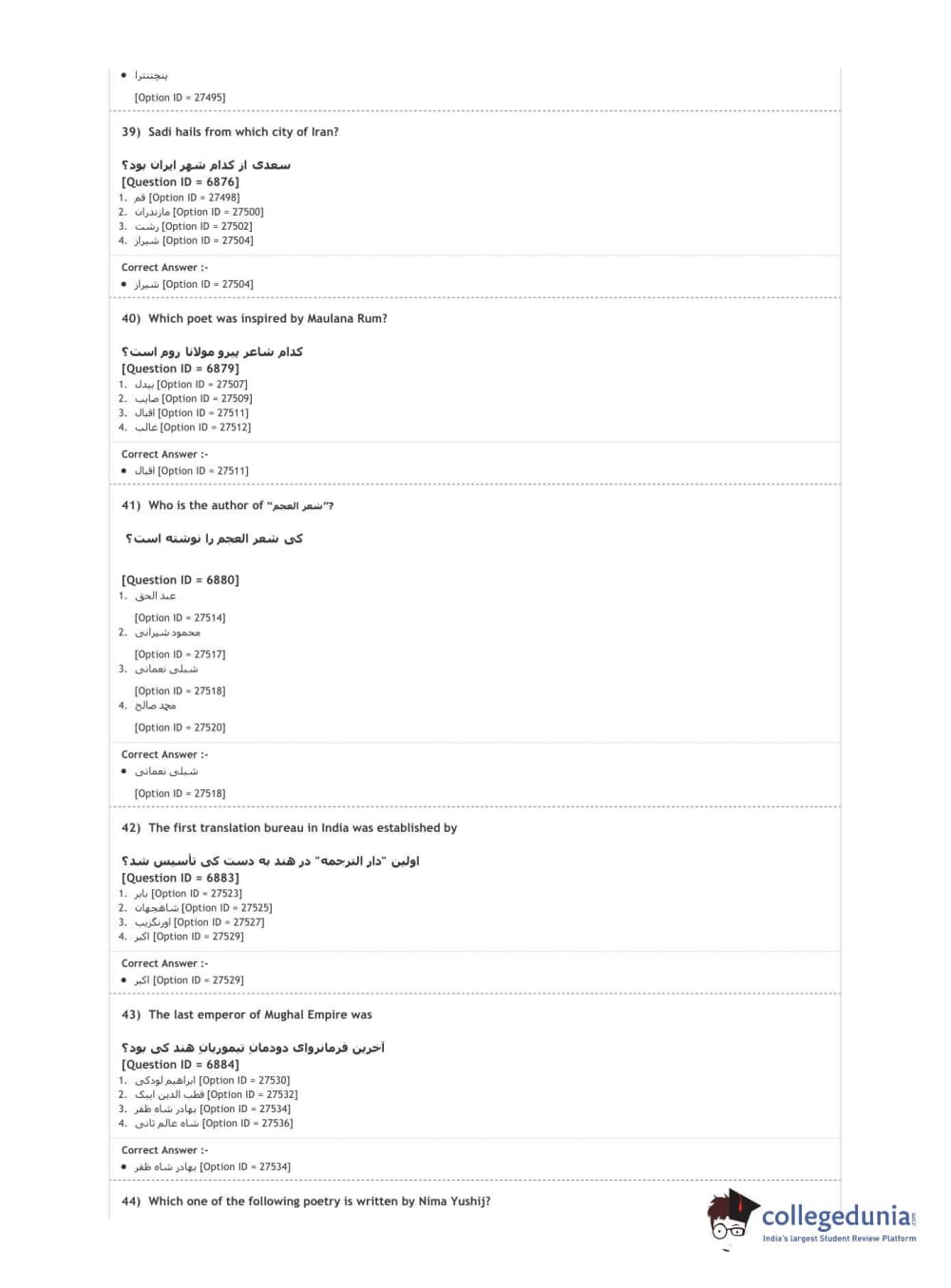 DUET 2020 M.A. Persian Question Paper with Answer Key PDF Shift 2