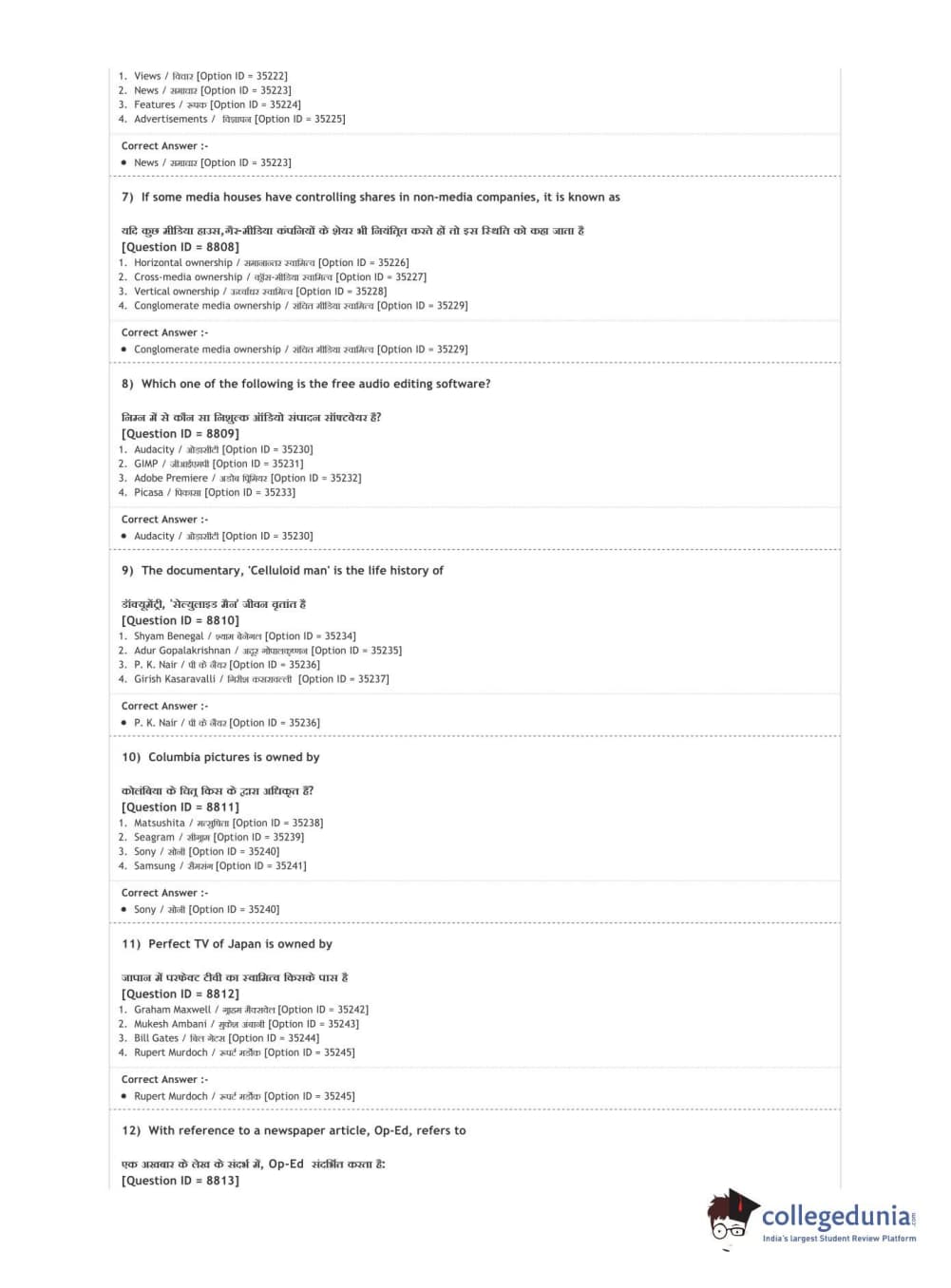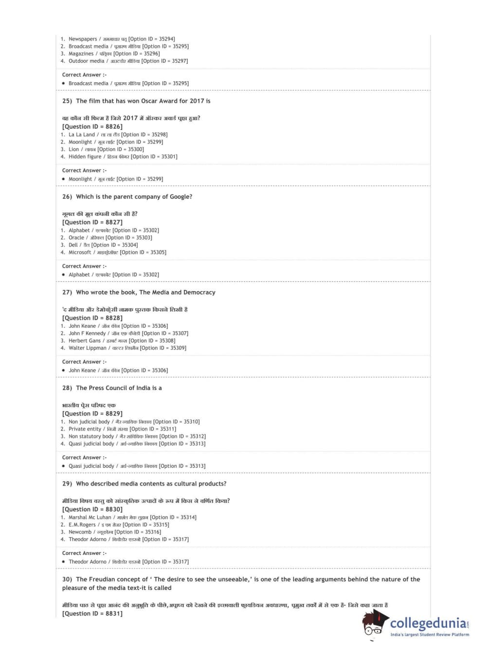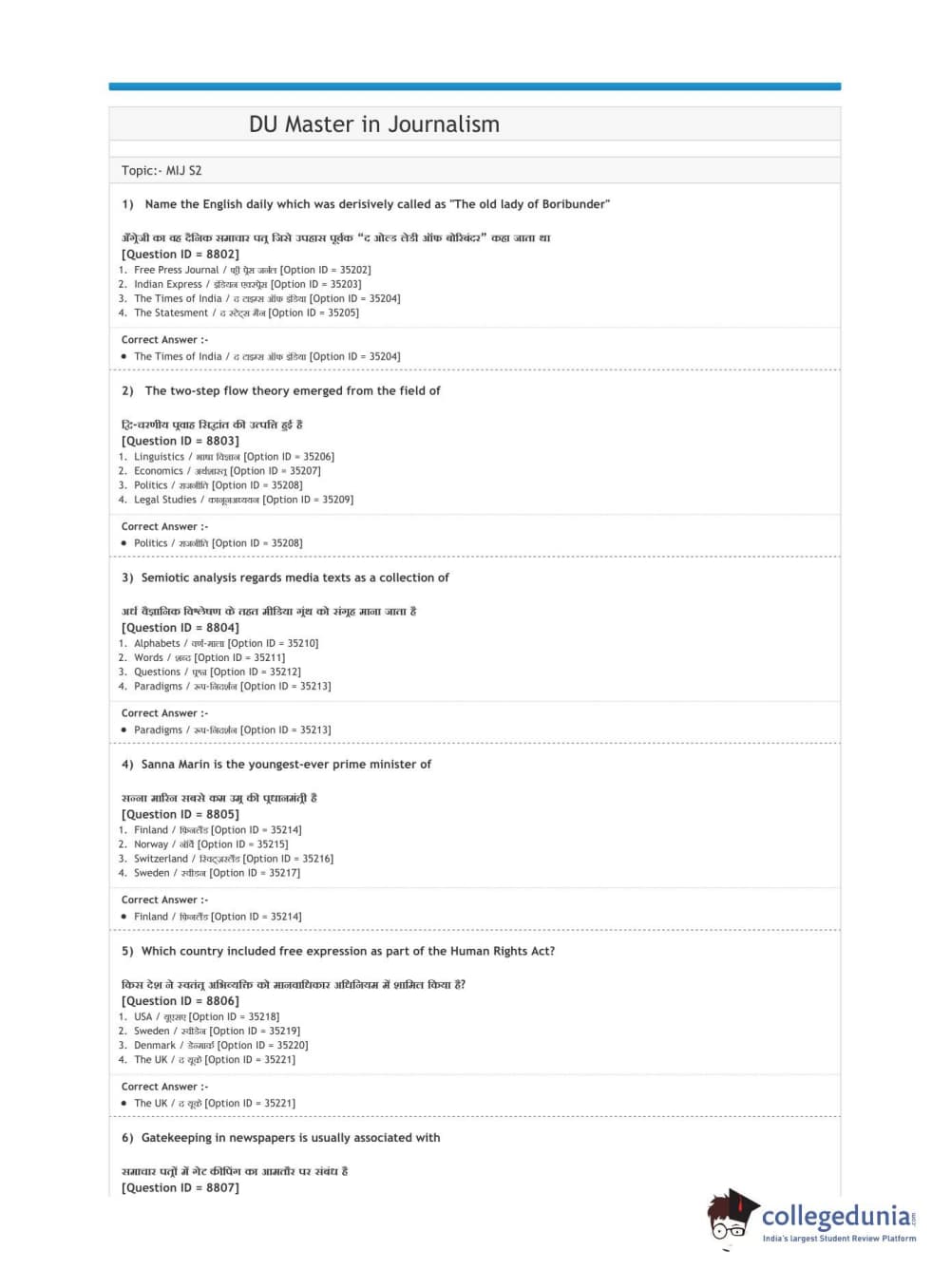 DUET 2020 Masters in Journalism Question Paper with Answer Key PDF Shift 1