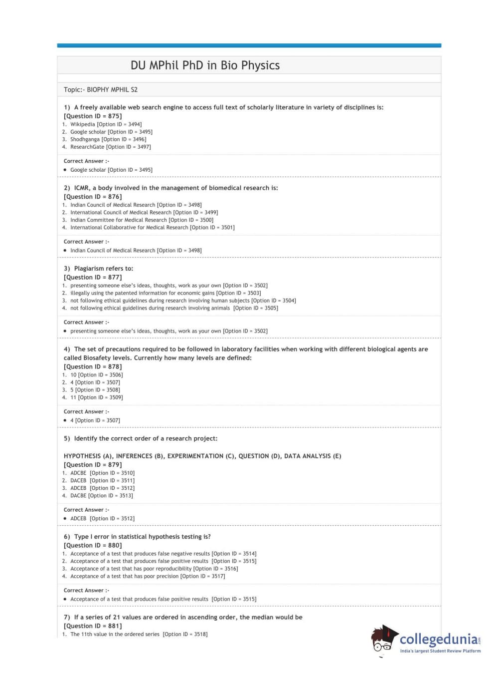 DUET 2020 M.Phil./Ph.D. in Bio-Physics Question paper with answer key pdf conducted on June 9, 2020 in Shift 1 is available for download. The exam was successfully organized by National Testing Agency (NTA). The question paper comprised a total of 50 questions.