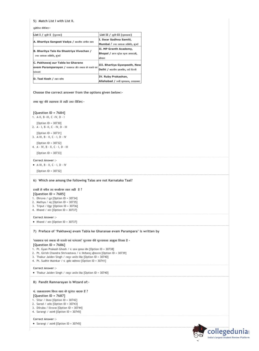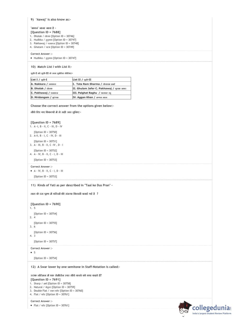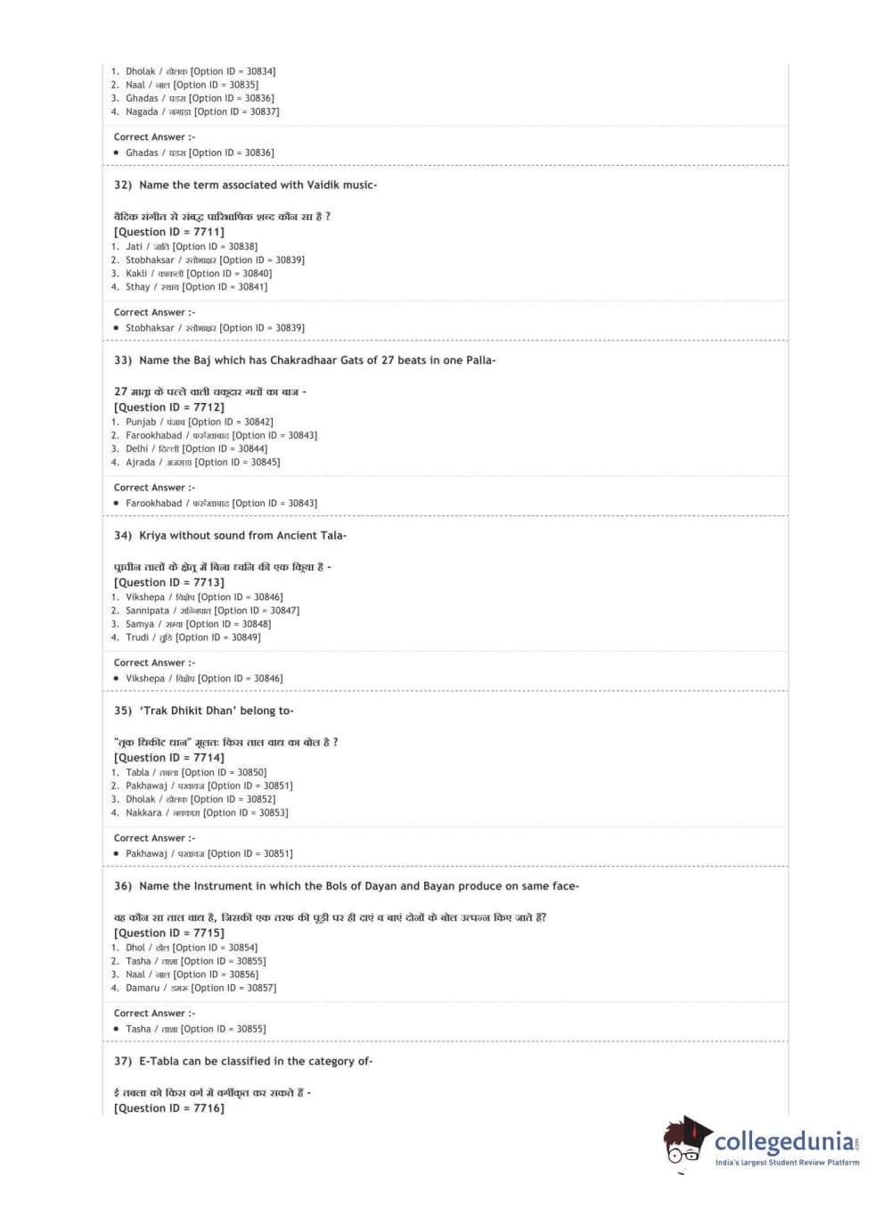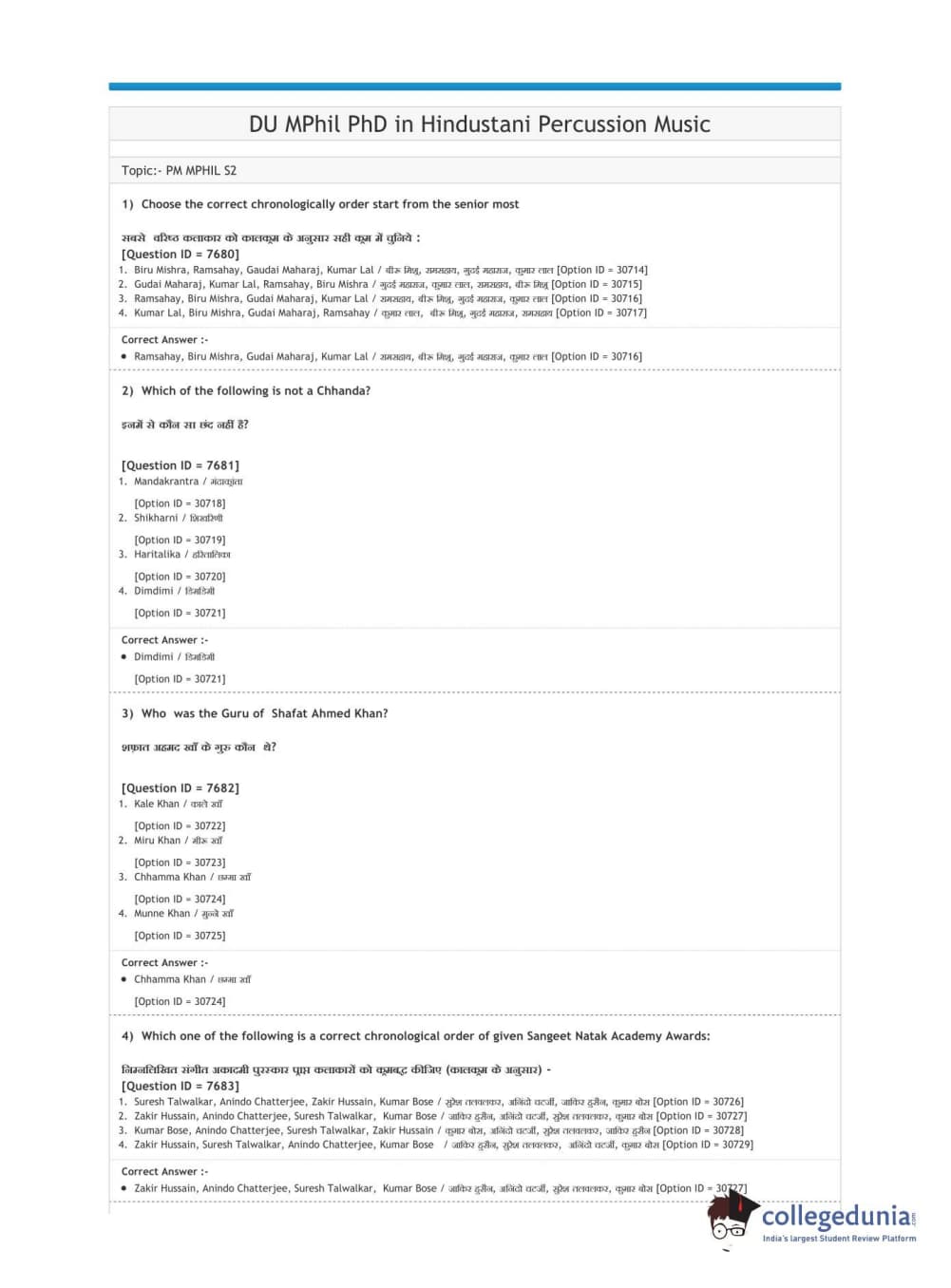DUET 2020 M.Phil./Ph.D. in Hindustani Percussion Music Question Paper with Answer Key PDF Shift 2