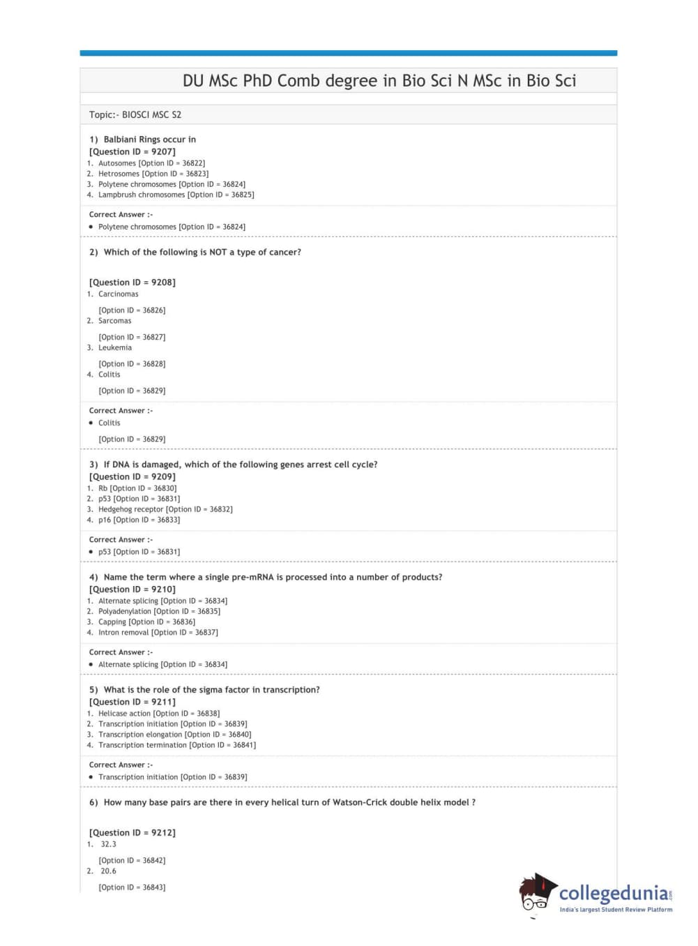 DUET 2020 M.Sc./Ph.D. combined degree in Biomedical Sciences Question Paper with Answer Key PDF Shift 1