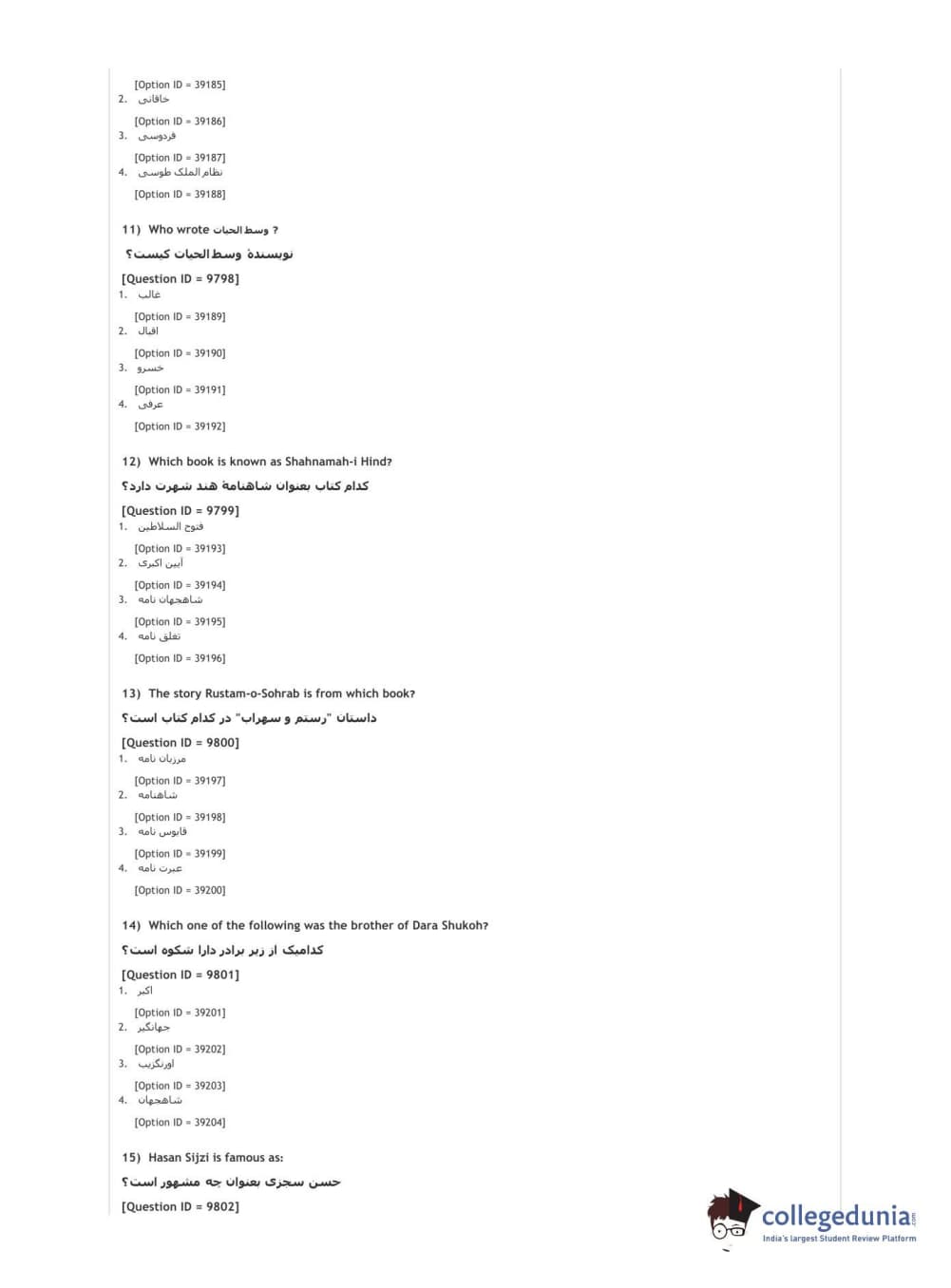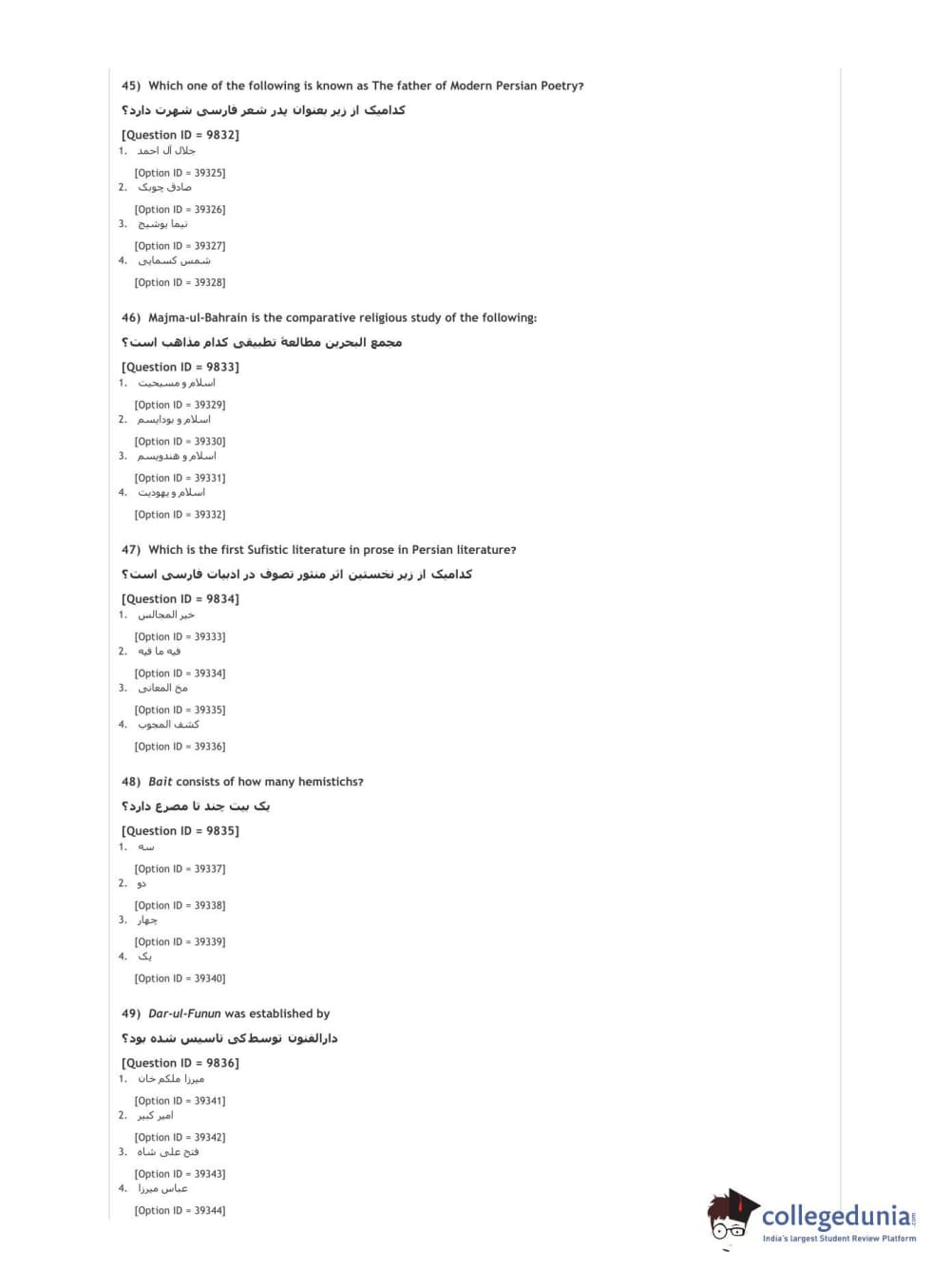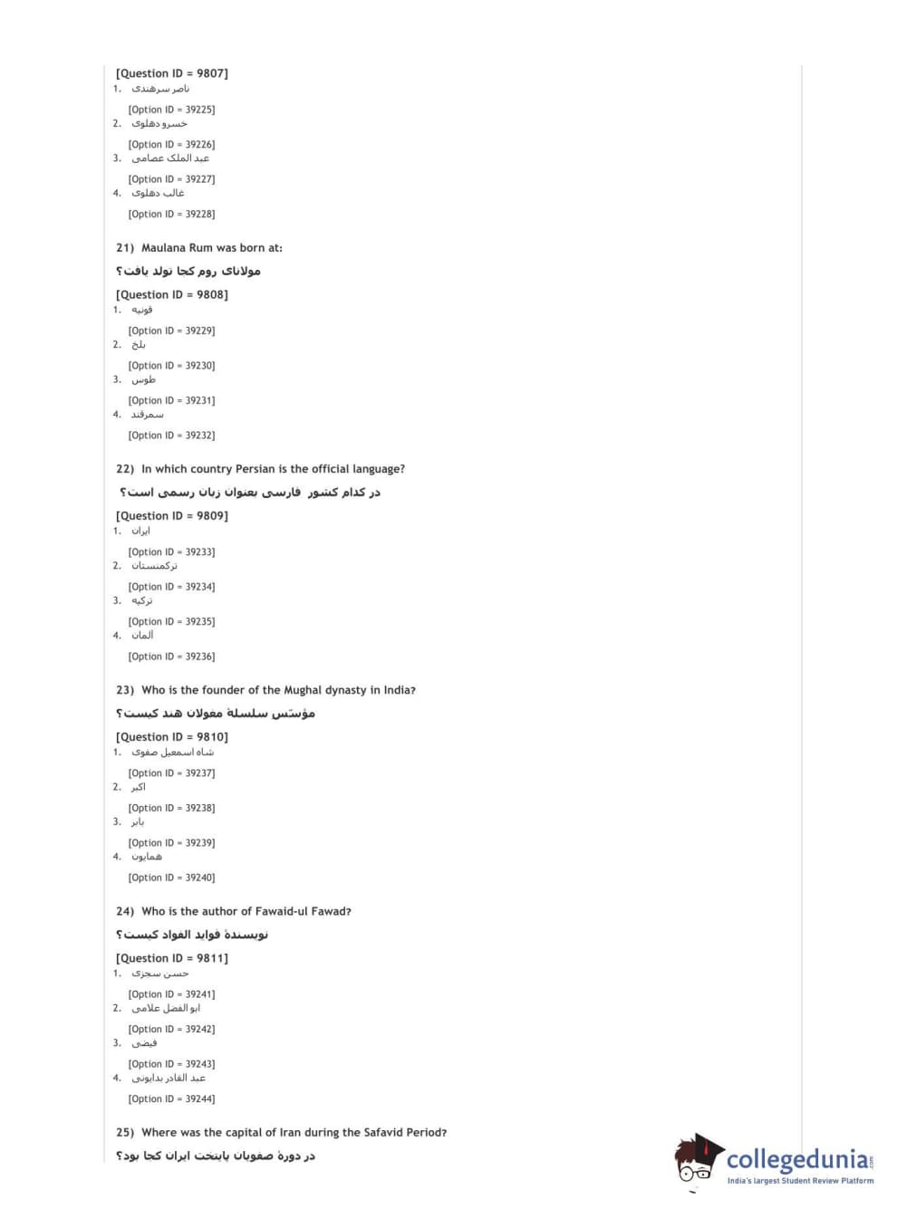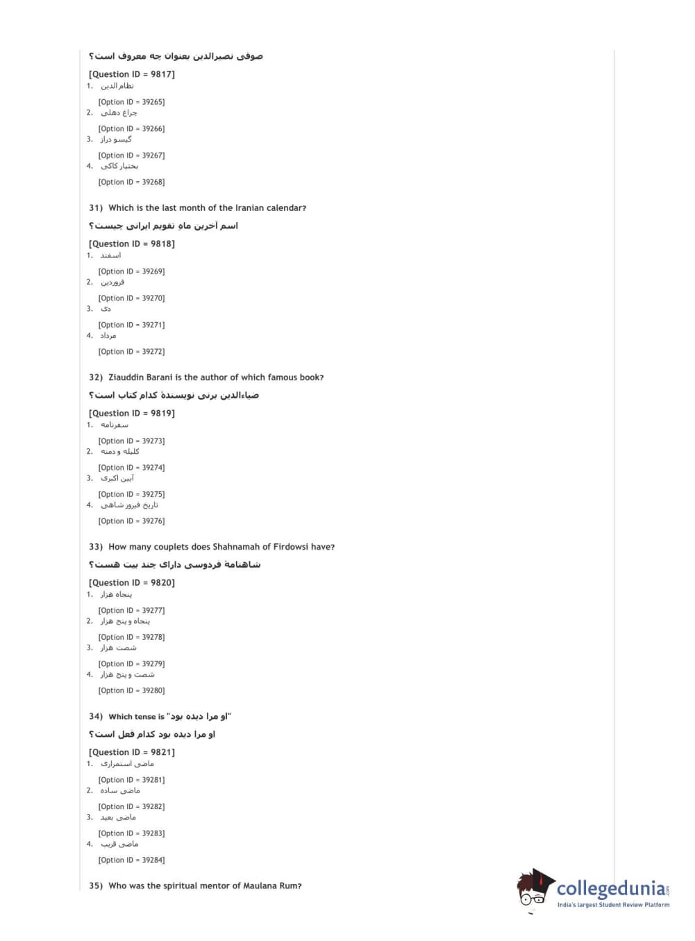 DUET 2021 DU MA Persian Question Paper with Answer Key PDFs Shift 2