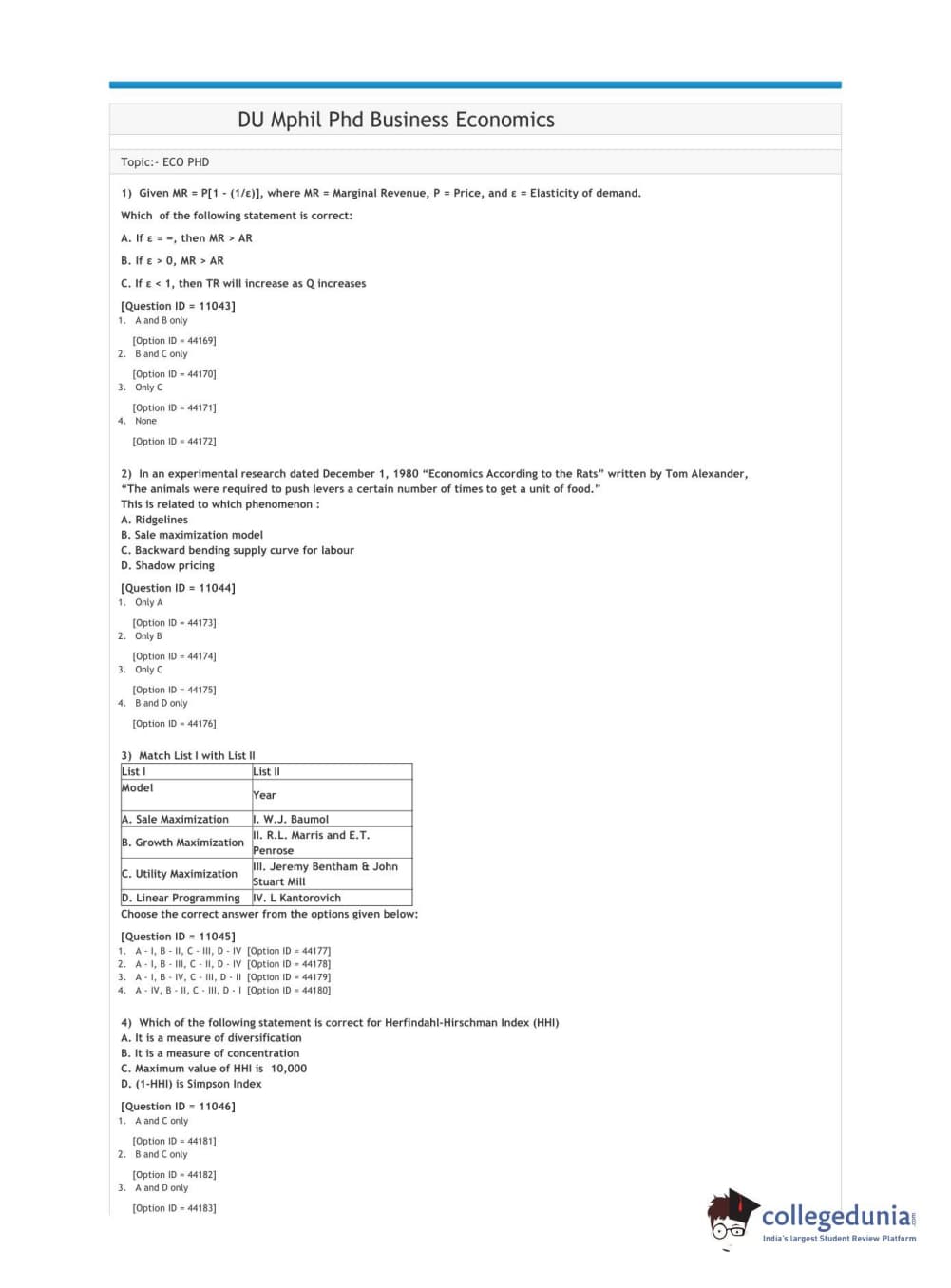 DUET 2021 DU Mphil Phd Business Economics Question Paper with Answer Key PDFs Shift 2