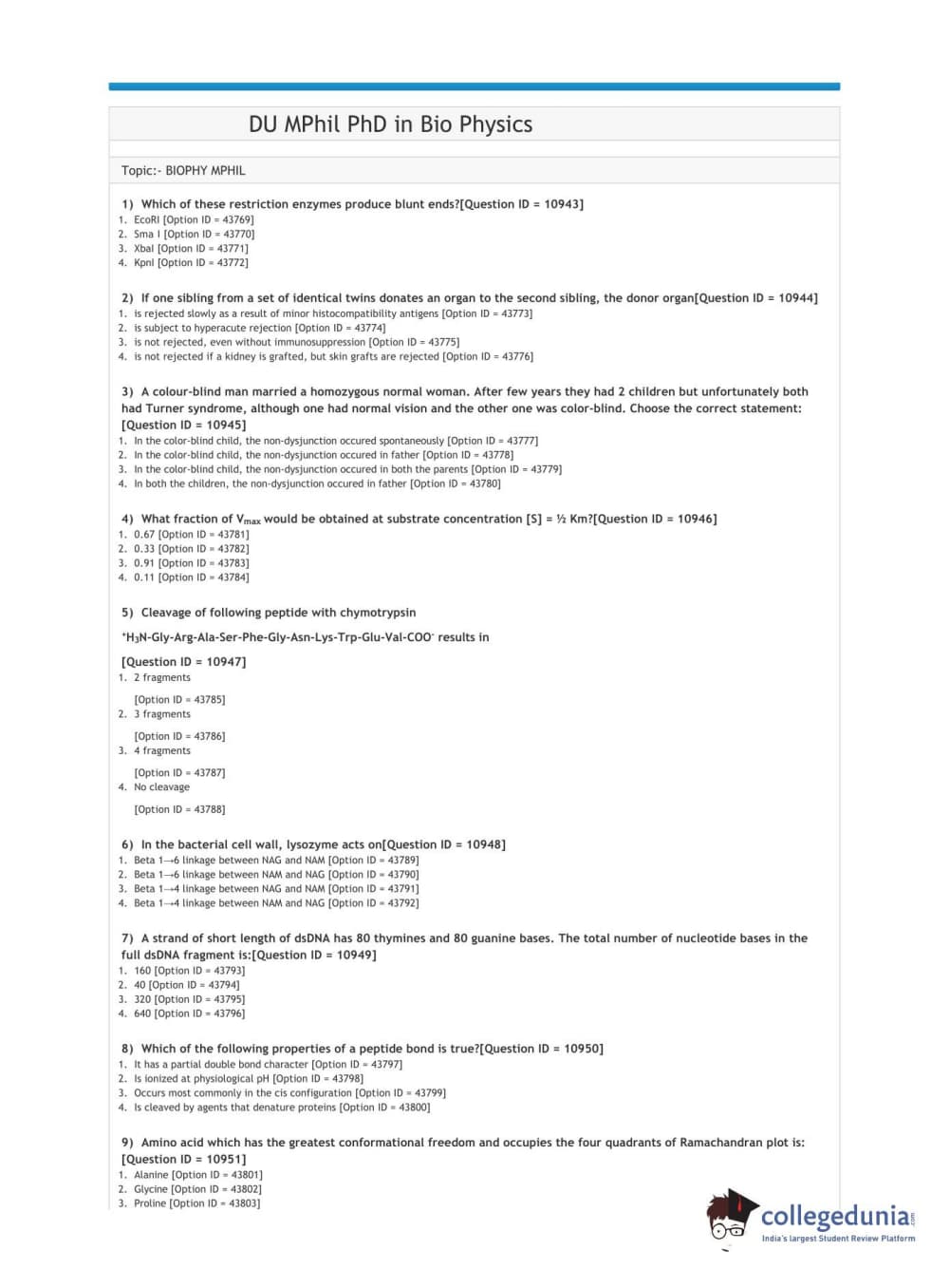 DUET 2021 DU MPhil PhD in Bio Physics Question Paper with Answer Key PDFs Shift 1