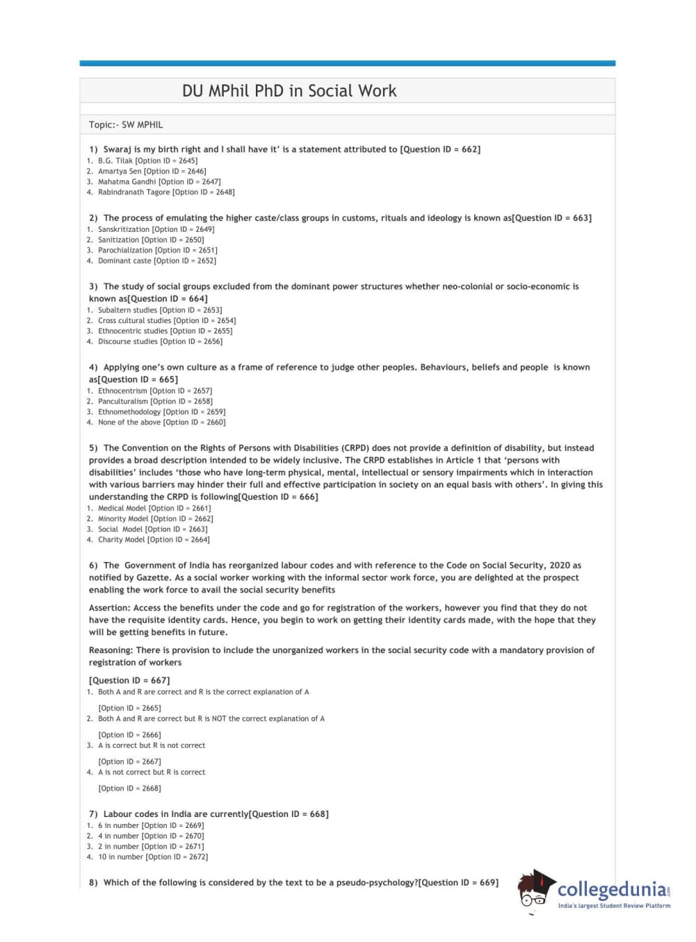 DUET 2021 DU MPhil PhD in Social Work Question paper with answer key pdf conducted on September 28, 2021 in Shift 1 is available for download. The exam was successfully organized by National Testing Agency (NTA). The question paper comprised a total of 50 questions.