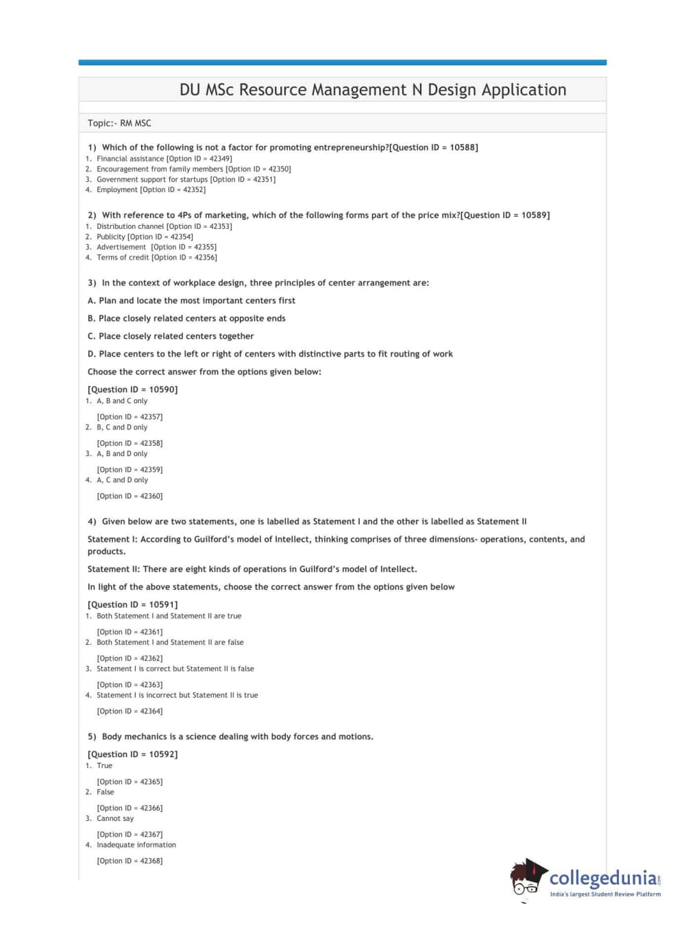 DUET 2021 DU MSc Resource Management N Design Application Question Paper with Answer Key PDFs Shift 1