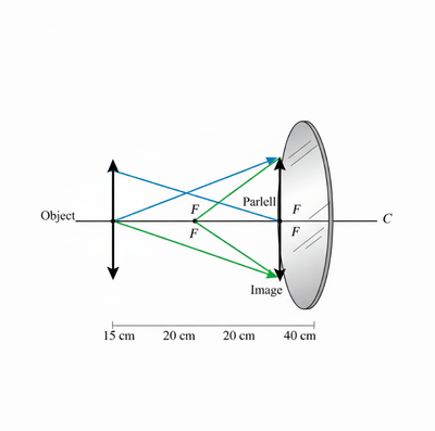 A ray diagram can be used to visually demonstrate the formation of the image. In this case, the incident rays parallel to the principal axis reflect off the mirror and converge at the centre of curvature, where the object and image are symmetrically placed.