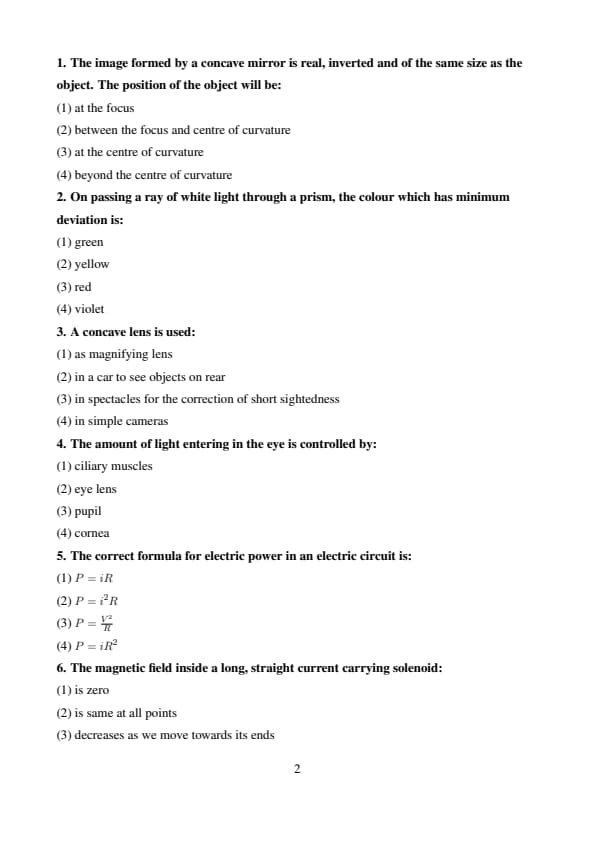 In the given question, option (2) \( P = I^2R \) is correct. It is one of the standard and widely used formulas for calculating electric power, especially when current and resistance are the known quantities. Quick Tip: Use \( P = VI \), \( P = I^2R \), or \( P = \frac{V^2}{R} \) depending on what's given in the problem (voltage, current, or resistance).