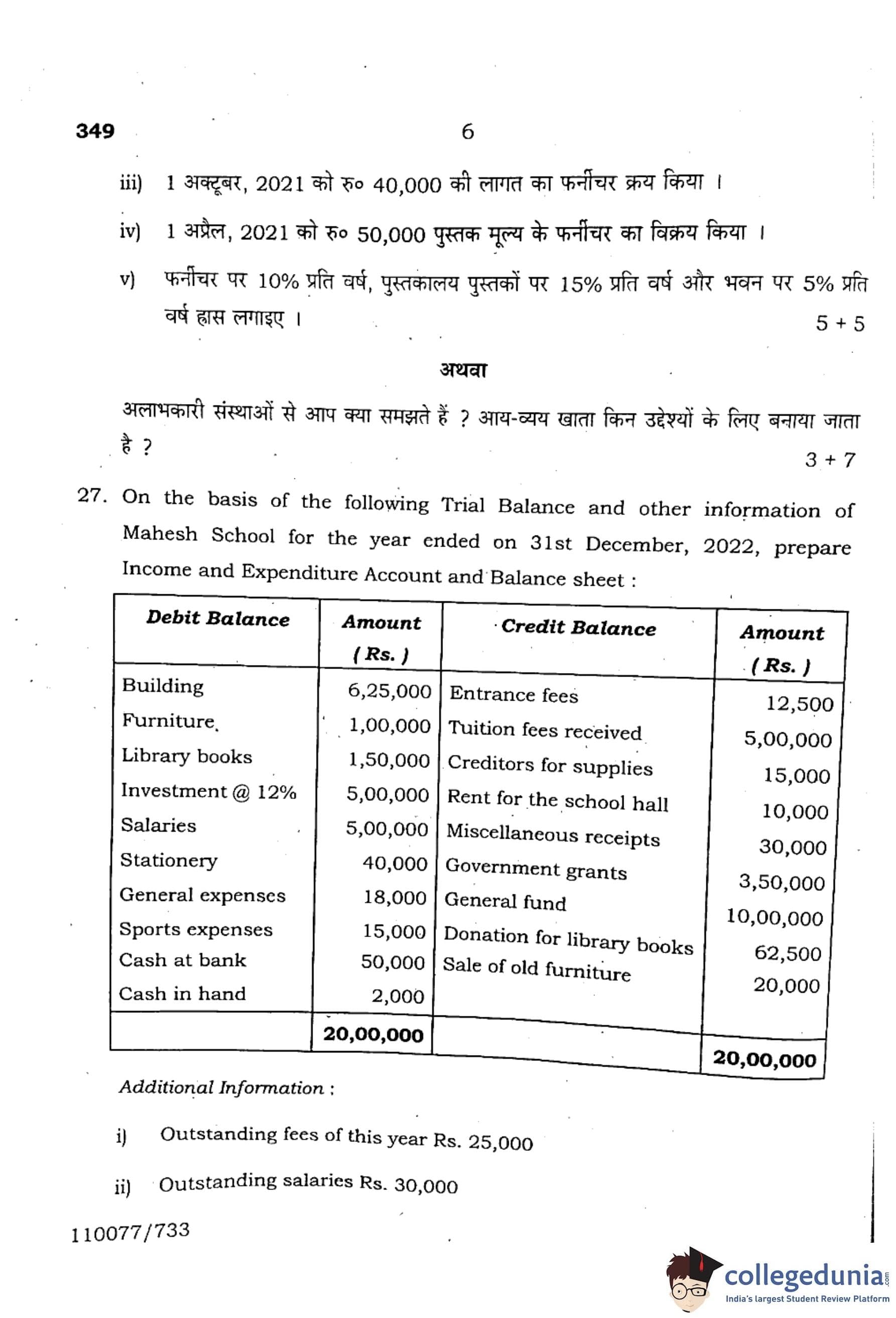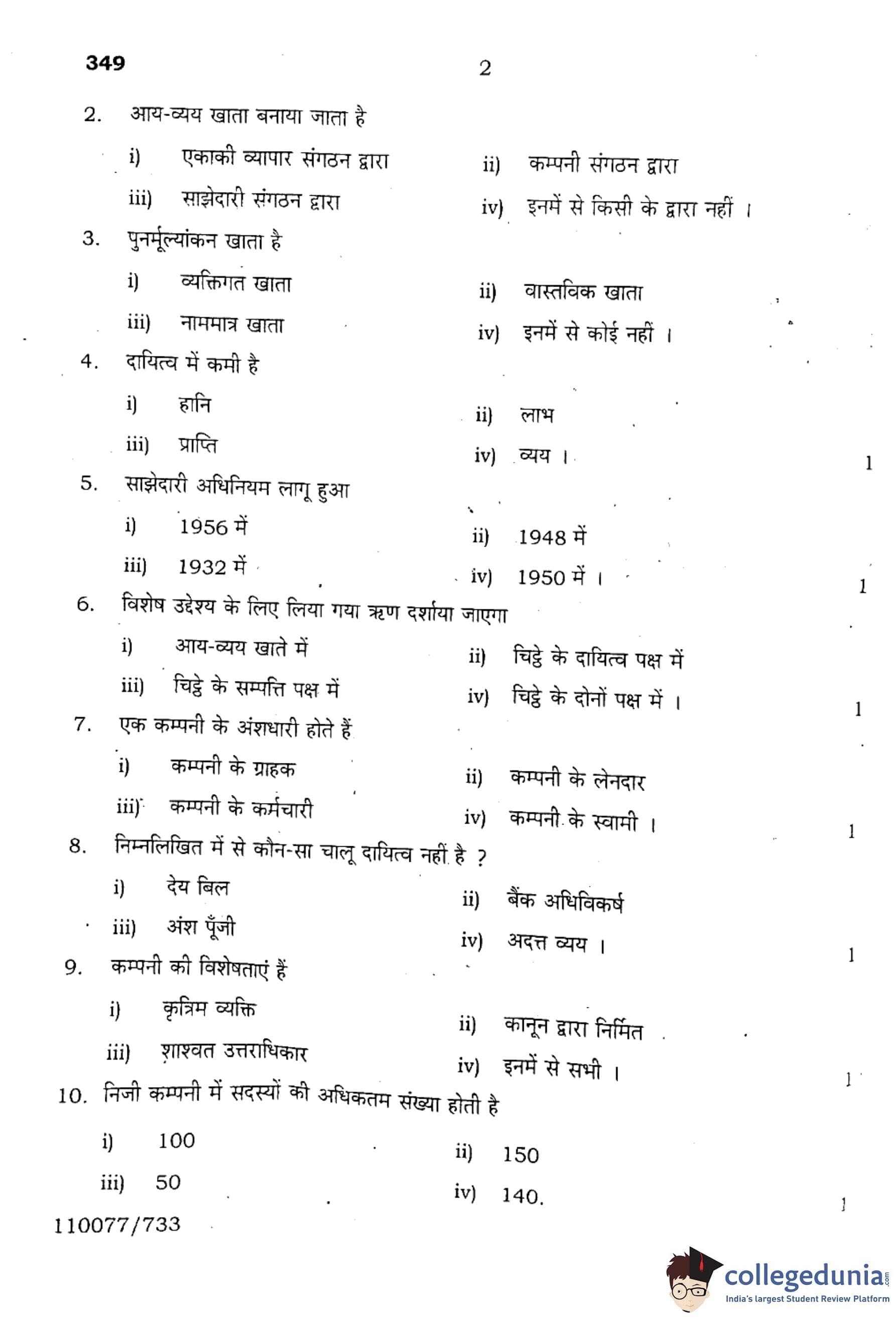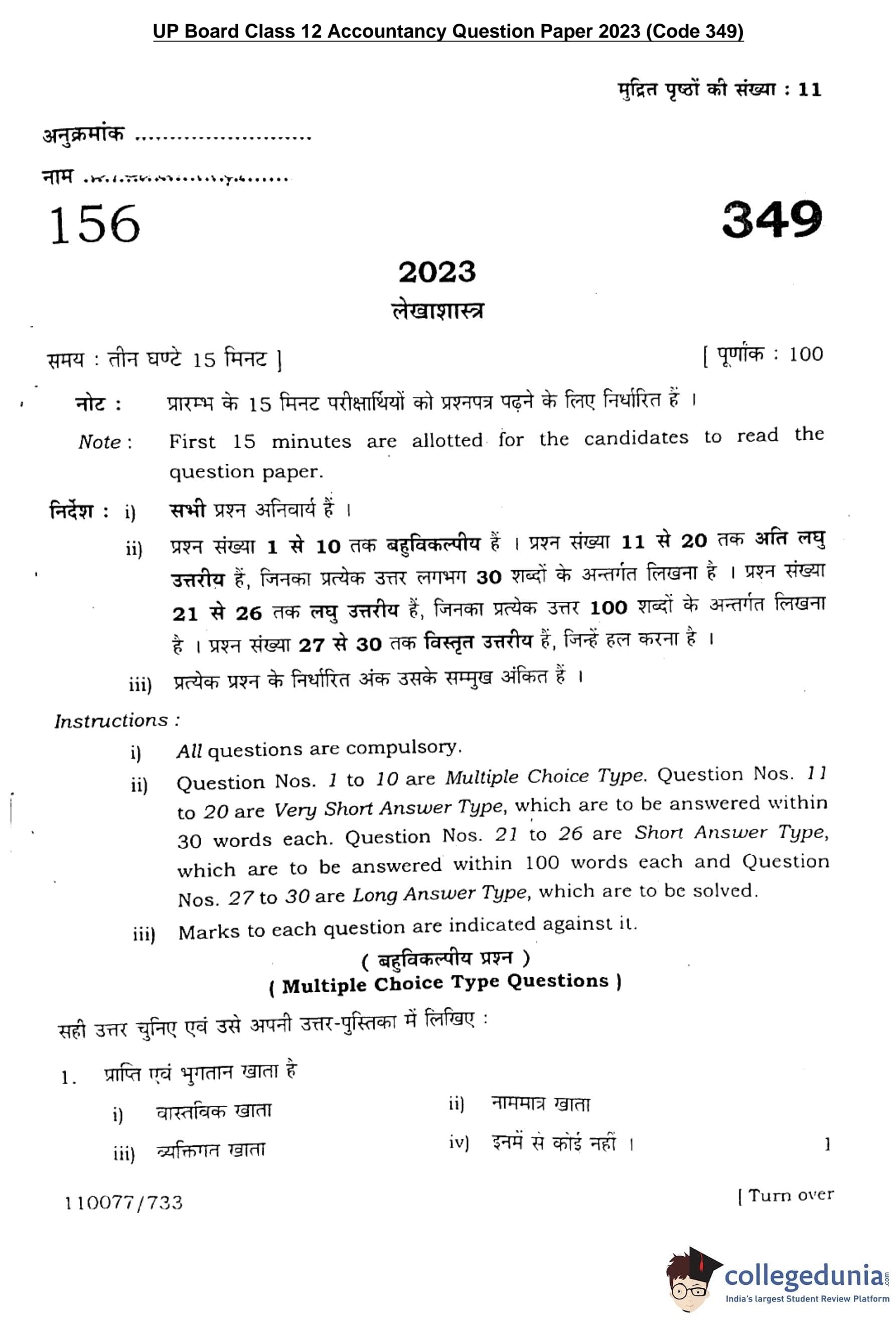 UP Board Class 12 Accountancy Question Paper 2023 with Answer Key Code 349 is available for download. The exam was conducted by the Uttar Pradesh Madhyamik Shiksha Parishad (UPMSP) on February 20, 2023 in Morning Session 8 AM to 11:15 AM. The medium of paper was English and Hindi. The question paper comprised a total of 30 questions.