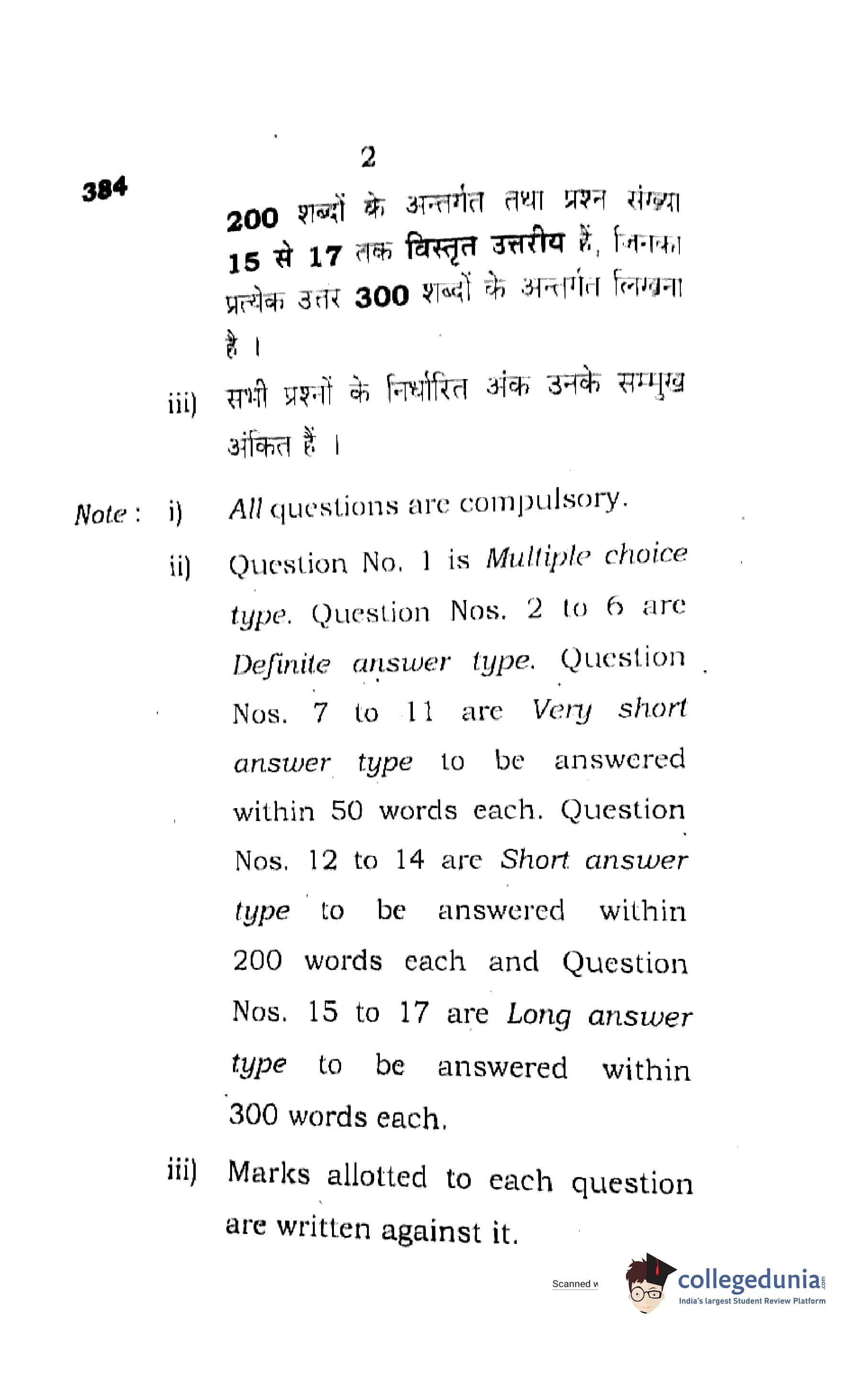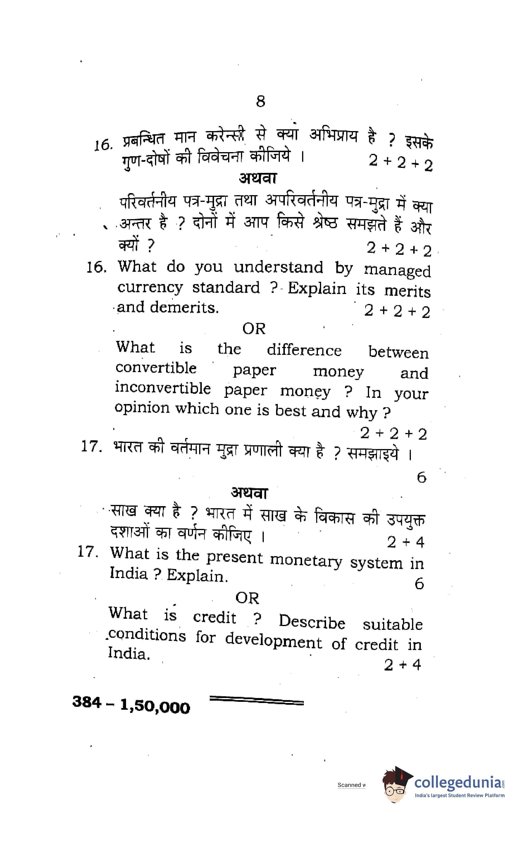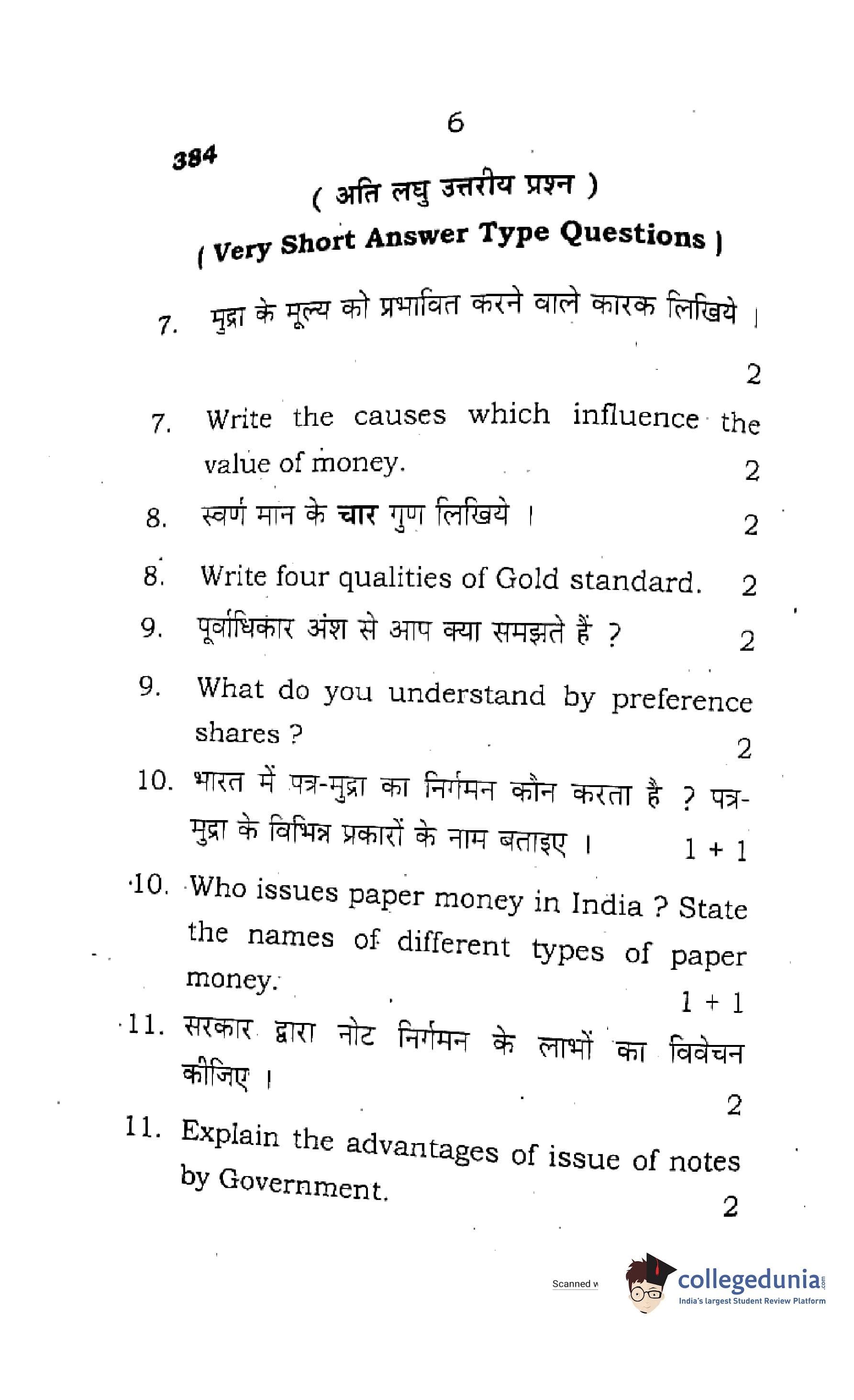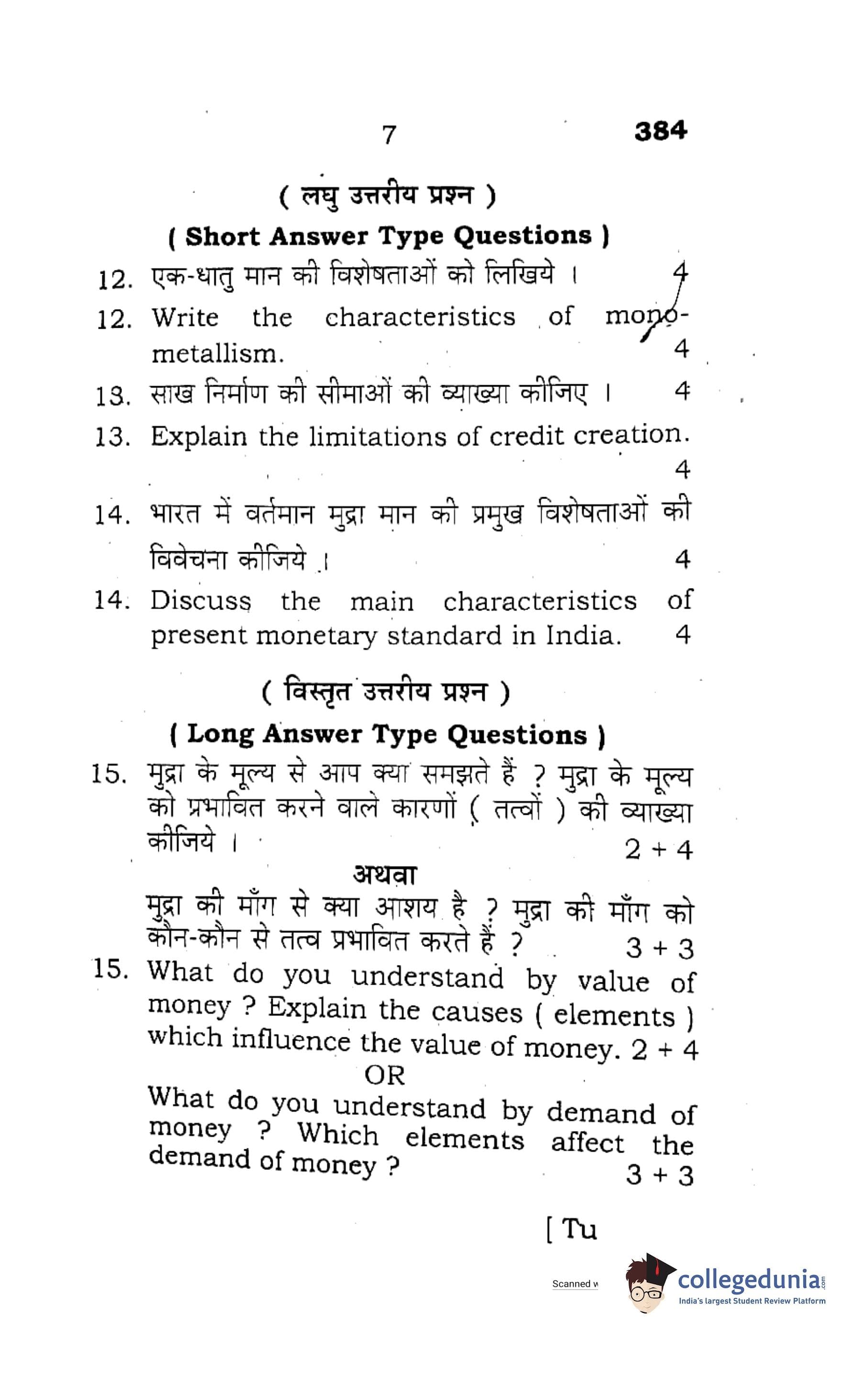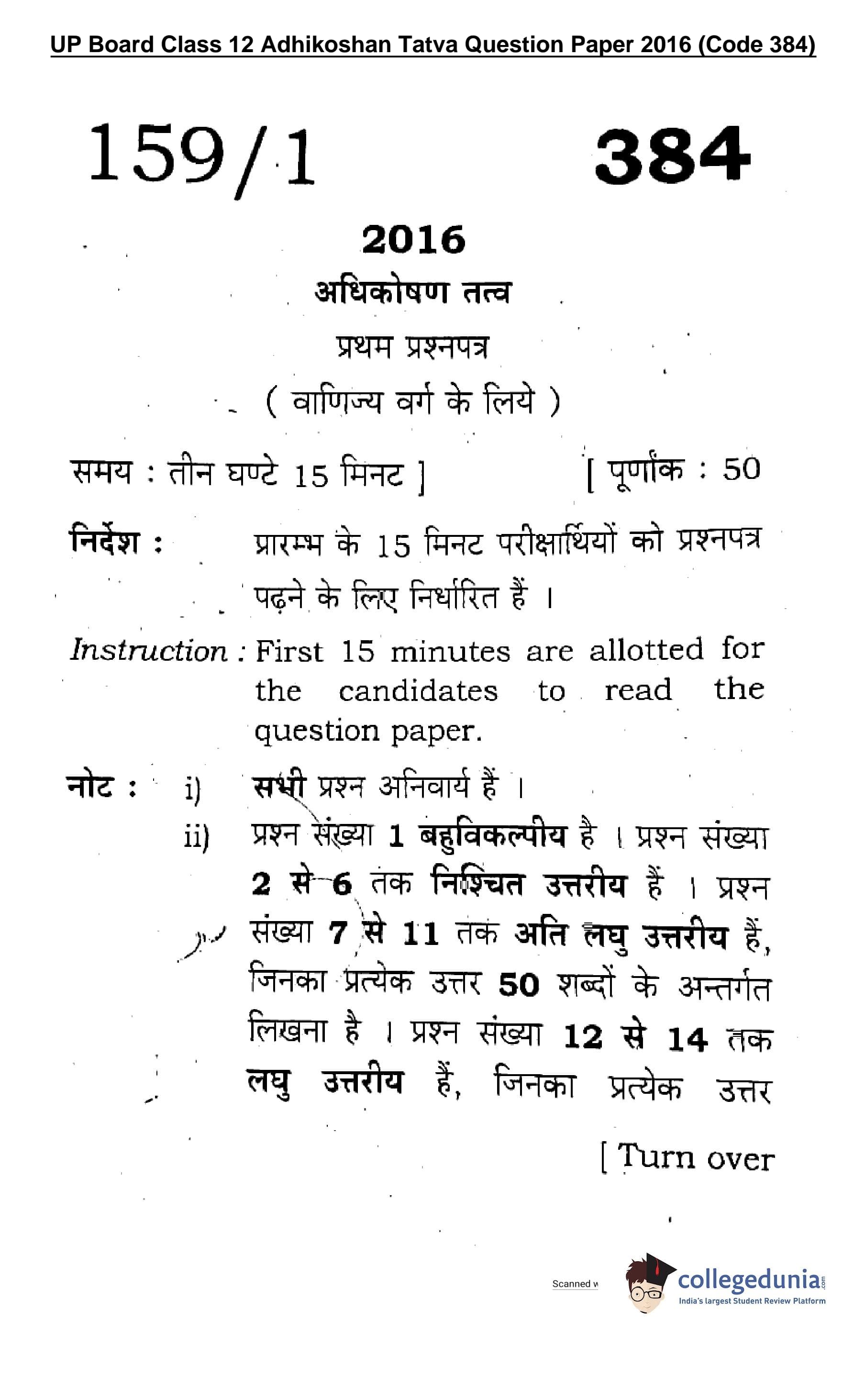 UP Board Class 12 Adhikoshan Tatva-1 Code 384 Question Paper 2016 with Answer Key (March 9)