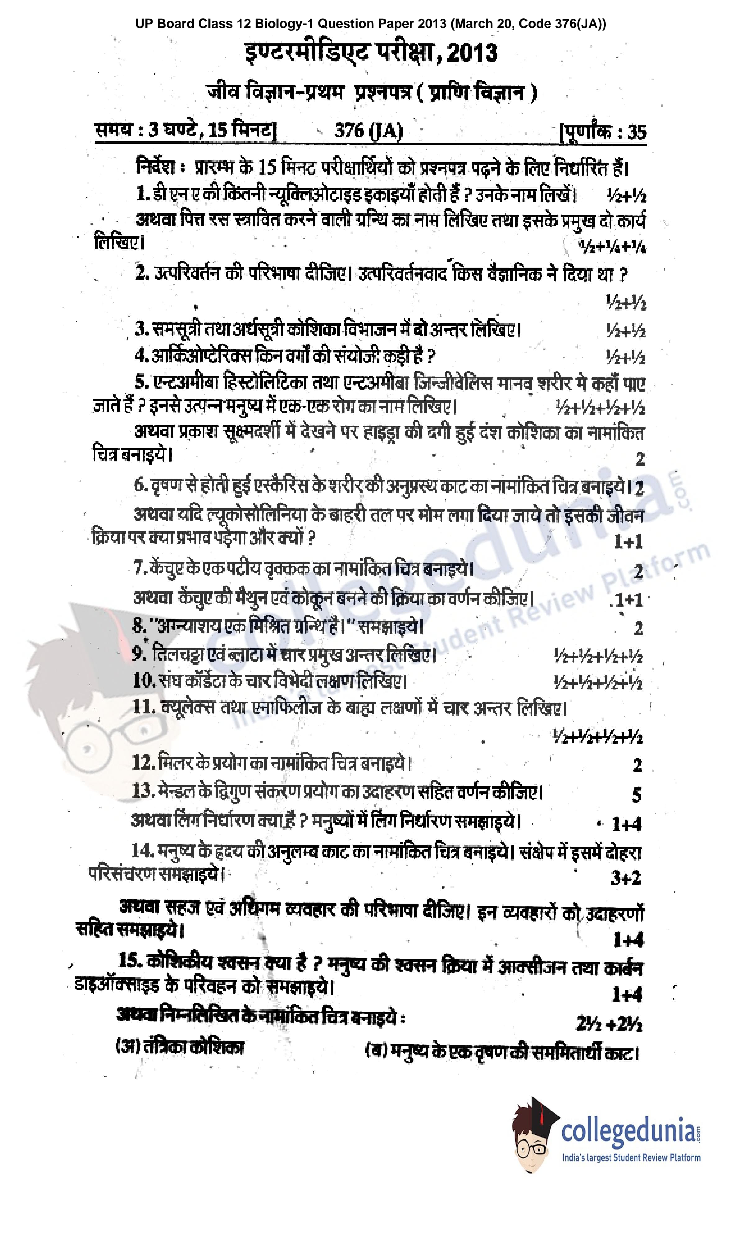 UP Board Class 12 Biology-1 Question Paper 2013 with Answer Key Code 376(JA) is available for download. The exam was conducted by the Uttar Pradesh Madhyamik Shiksha Parishad (UPMSP) on March 20, 2013 in the Afternoon Session 2 PM to 5:15 PM. The medium of paper was Hindi. The question paper comprised a total of 15 questions.
